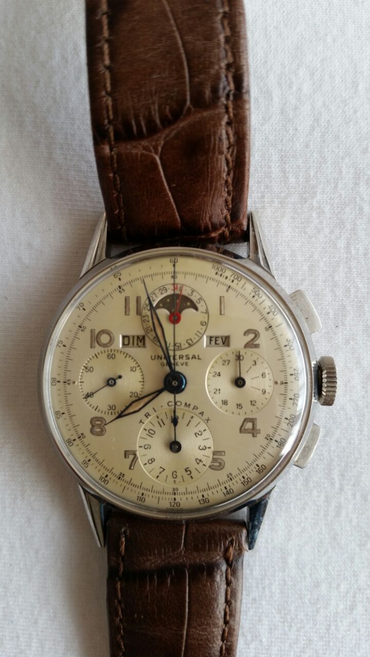 I am new to the forums but have been actively monitoring. I was hoping you may be able to help me out with a watch. I believe it is a c. 1940's tri-compax (37mm?). I am waiting on additional photos of the movement and case back to verify its originality but does this look to be a real dial? From the examples I have seen it looks pretty good, however the words tri-compax appear to be wider across the dial than other examples and the outer tachymetre markings seem almost too crisp. Appreciate your thoughts.