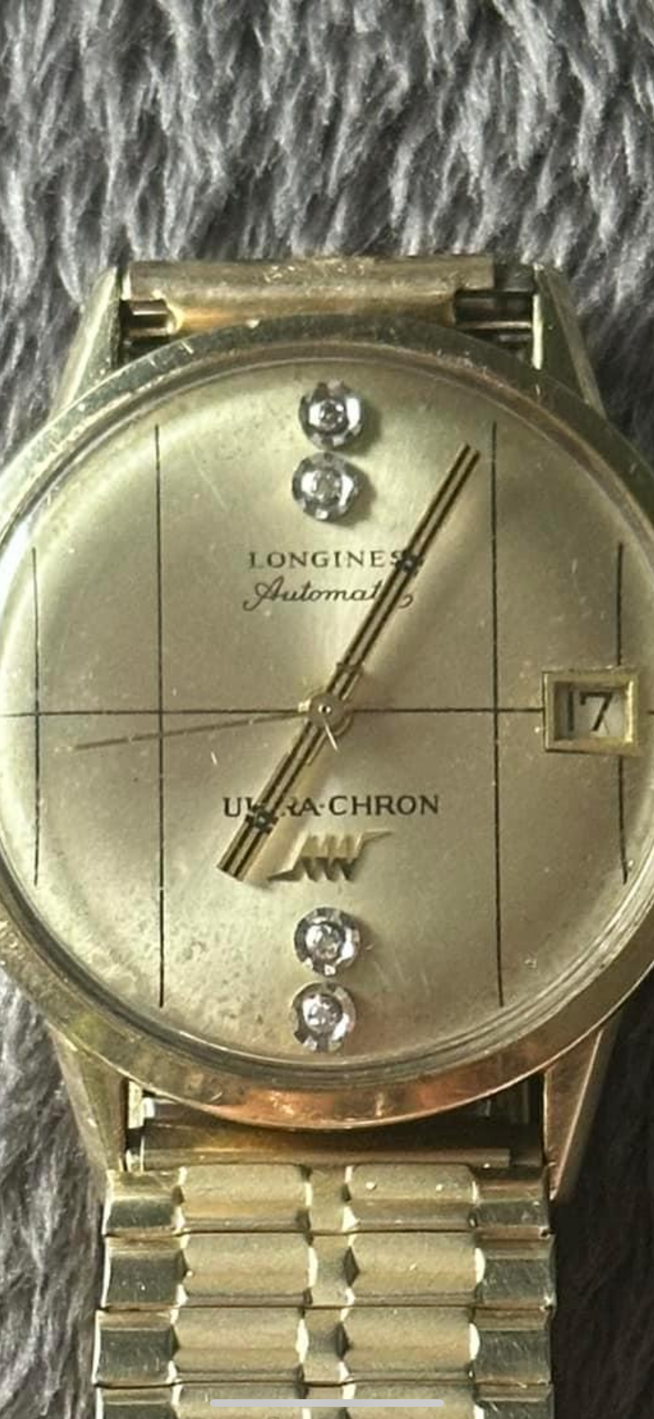 Posts 33,160 Likes 37,894 dsio ·Sep 3, 2024·Ash @ ΩF Looks like a Longines Ultra-Chron with this dial variant https://www.belovedwatch.com/products/longines-ultra-chron That may have had the applied furniture at 12 and 6 removed and replaced with diamonds as an aftermarket job, as the diamonds look slightly wonky.