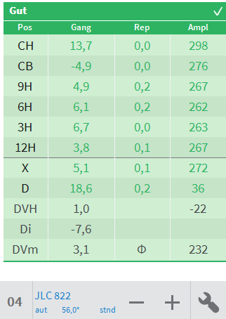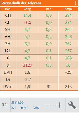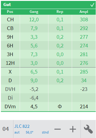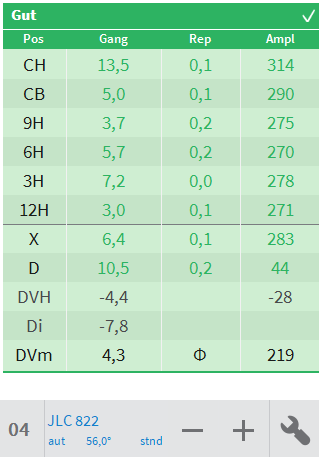 I’ve got a new watch (with a JLC caliber 822) which shows an unexpected behavior on the timegrapher. Fully wound the rates for dial up and dial down are rather similar but after some hours the rate for the dial down position drops by 10 to 15s/d while the rates of the other positions don’t change much. Here are the screen shots of the measurements for fully wound and after running for 3 hours, 11 hours and 16hours: