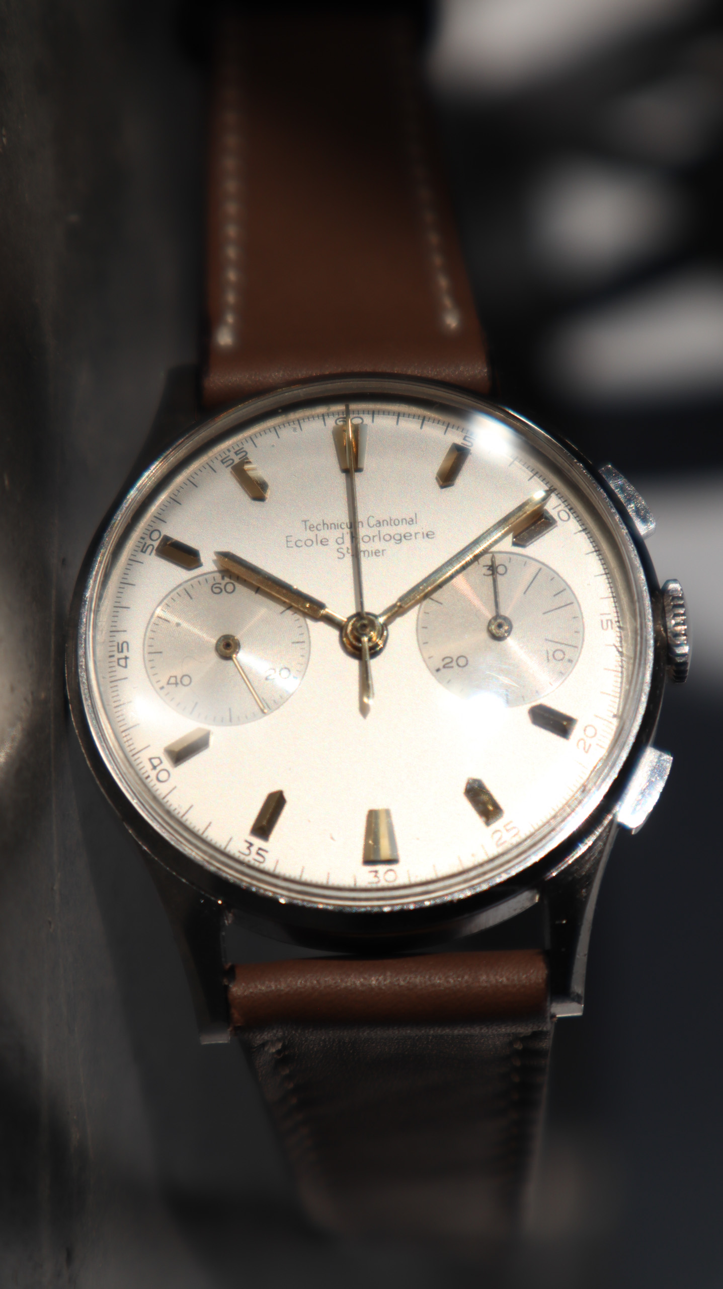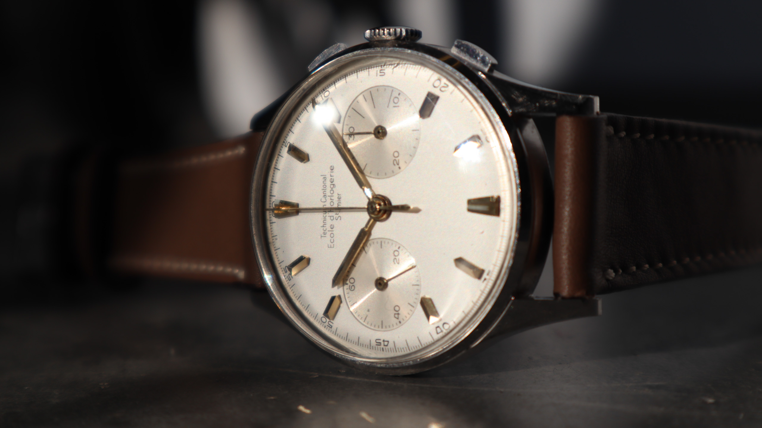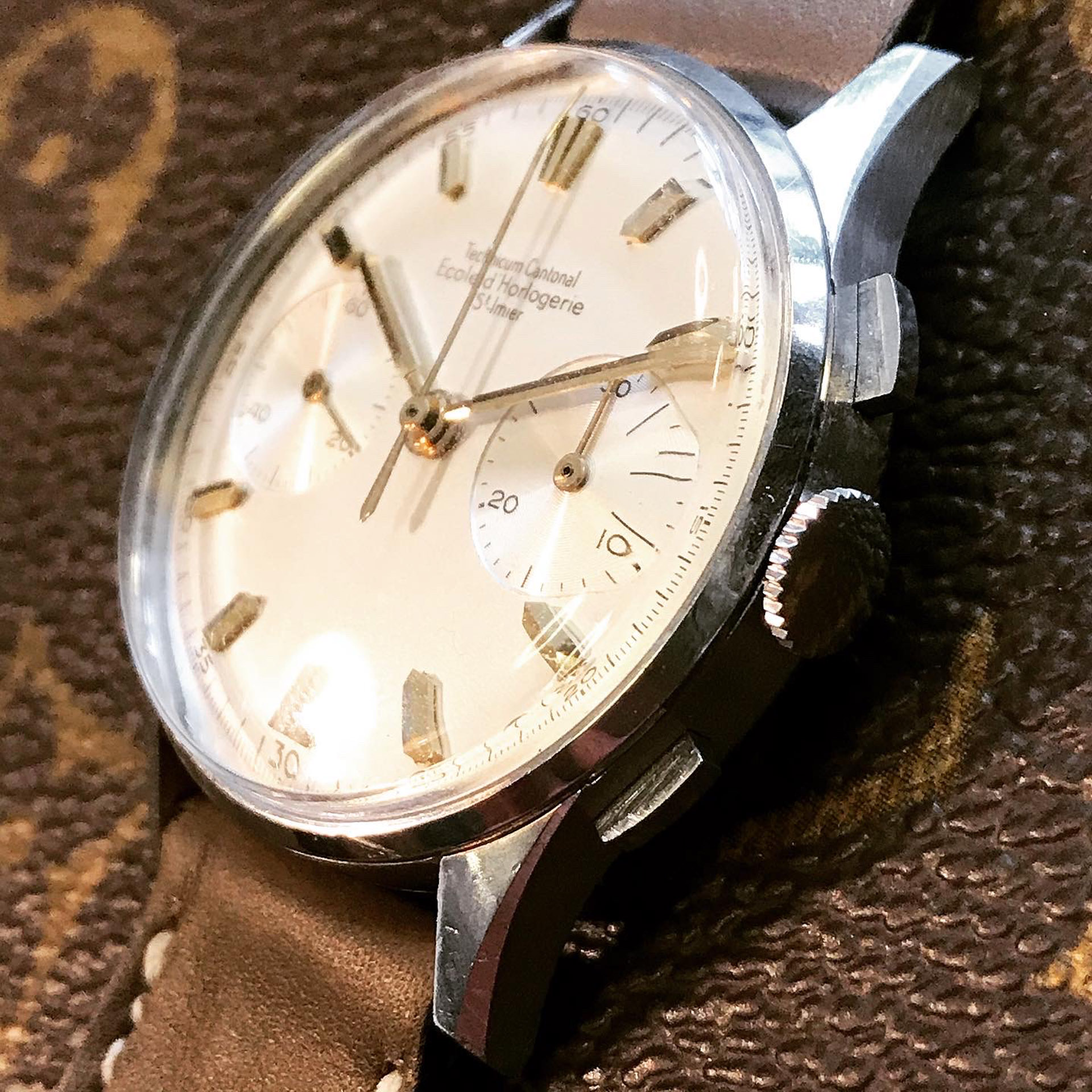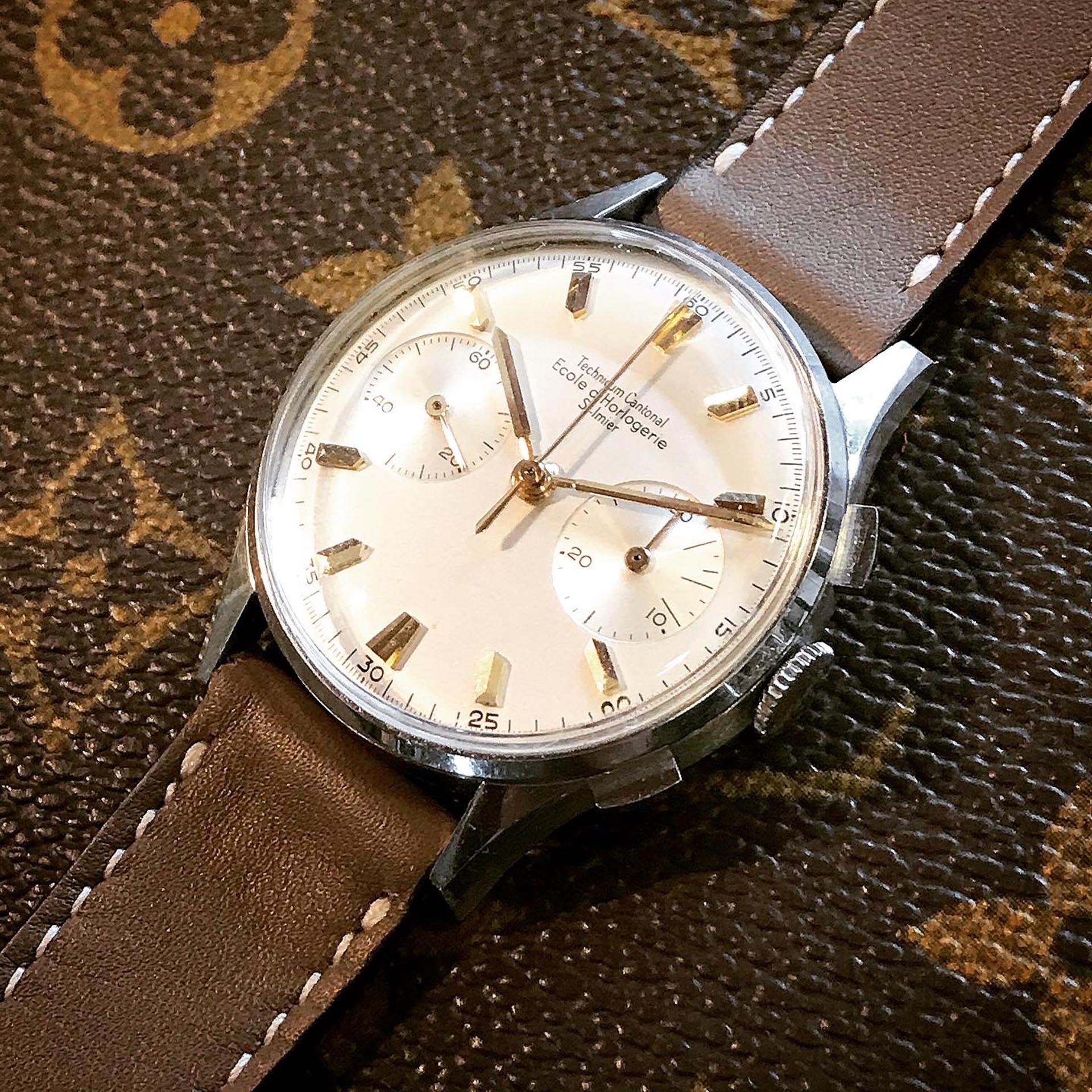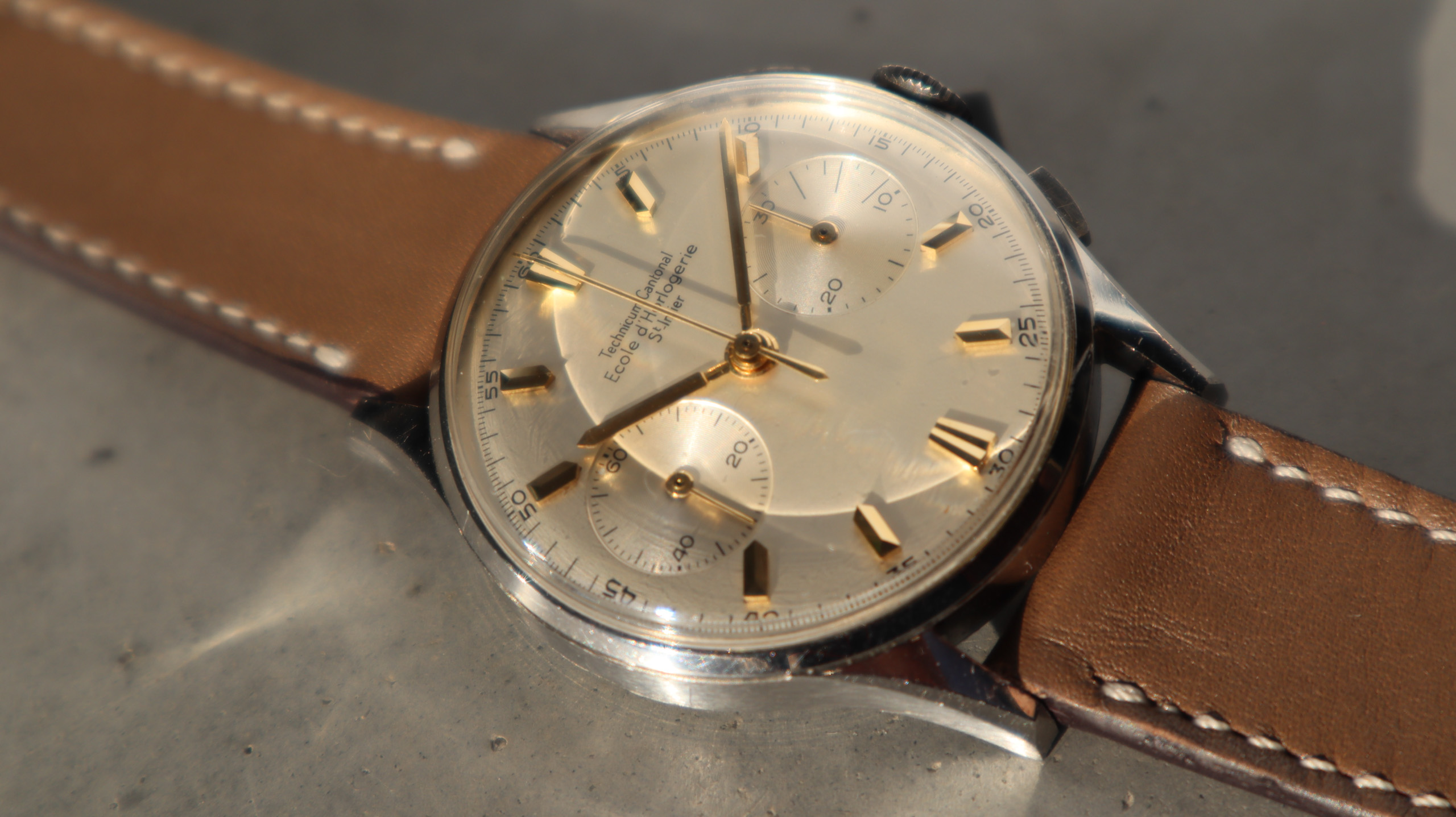 Some of the students who graduated as a Ingénieur Technicien after 5 and 1/2 years also made an additional optional wristwatch to complete their course. This watch is such a piece. It was bought by a collector friend who’s interest lies in the chronometer pocket and desk watches. This is sort of his side catch. He bought this piece directly from an alumnus from the Technicum Cantonal Ecole d’Horlogerie St’ Imier. I am completely in love with this piece since it shows an unique craftsmanship. It has the coveted Valjoux 23 movement inside, which is a celebrated hand-winding chronograph movement in the Valjoux 72 family produced from 1916 through 1974. The Valjoux 23 and 72 are almost identical except that the latter adds a 12 hour counter at 6:00 on the dial.The Valjoux 23 family is 13 ligne in size (29.5 mm) with a nine-pillar column wheel. It is typically a two-register design, with small seconds at 9:00 and a 30- or 45-minute counter at 3:00.