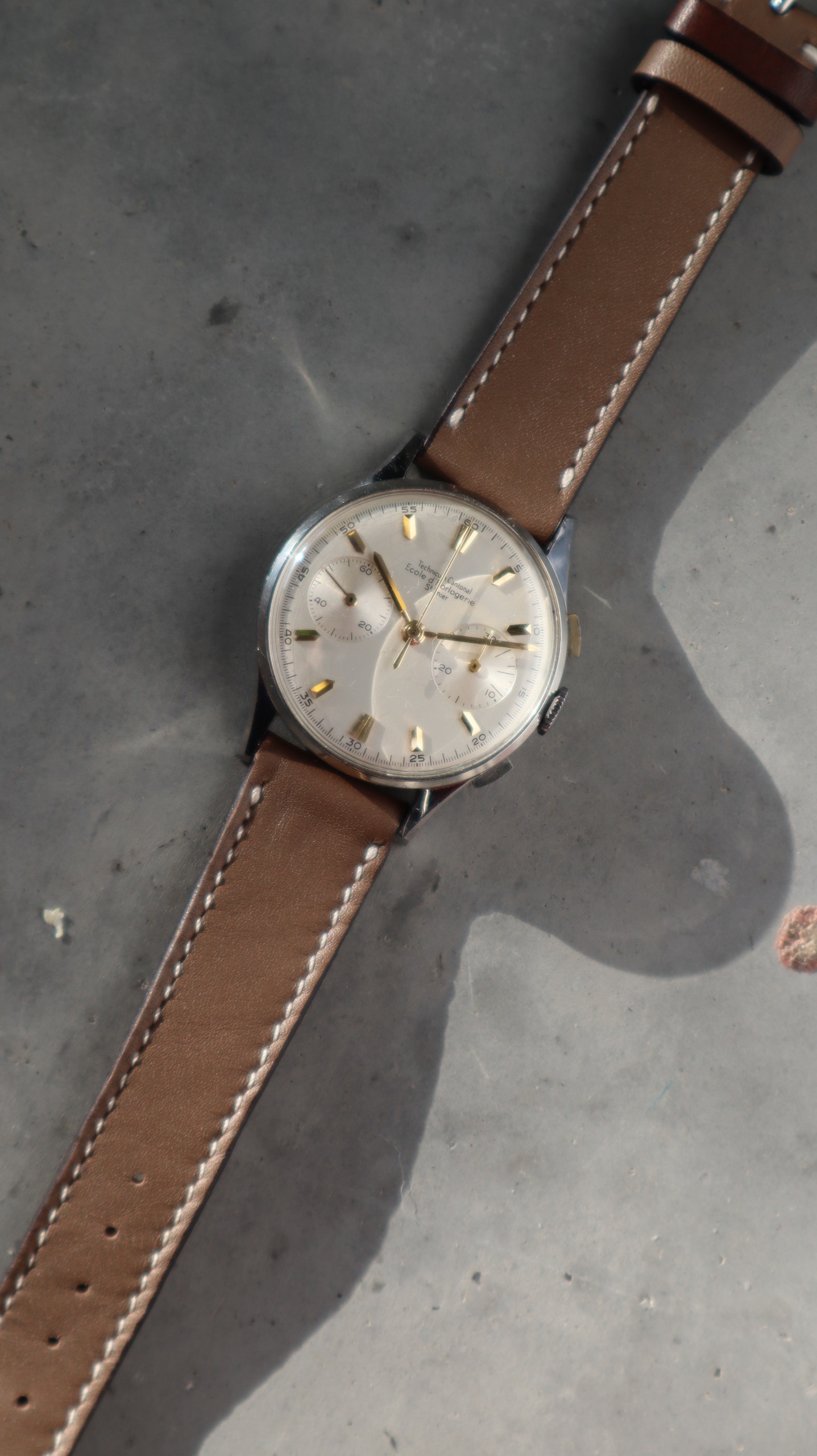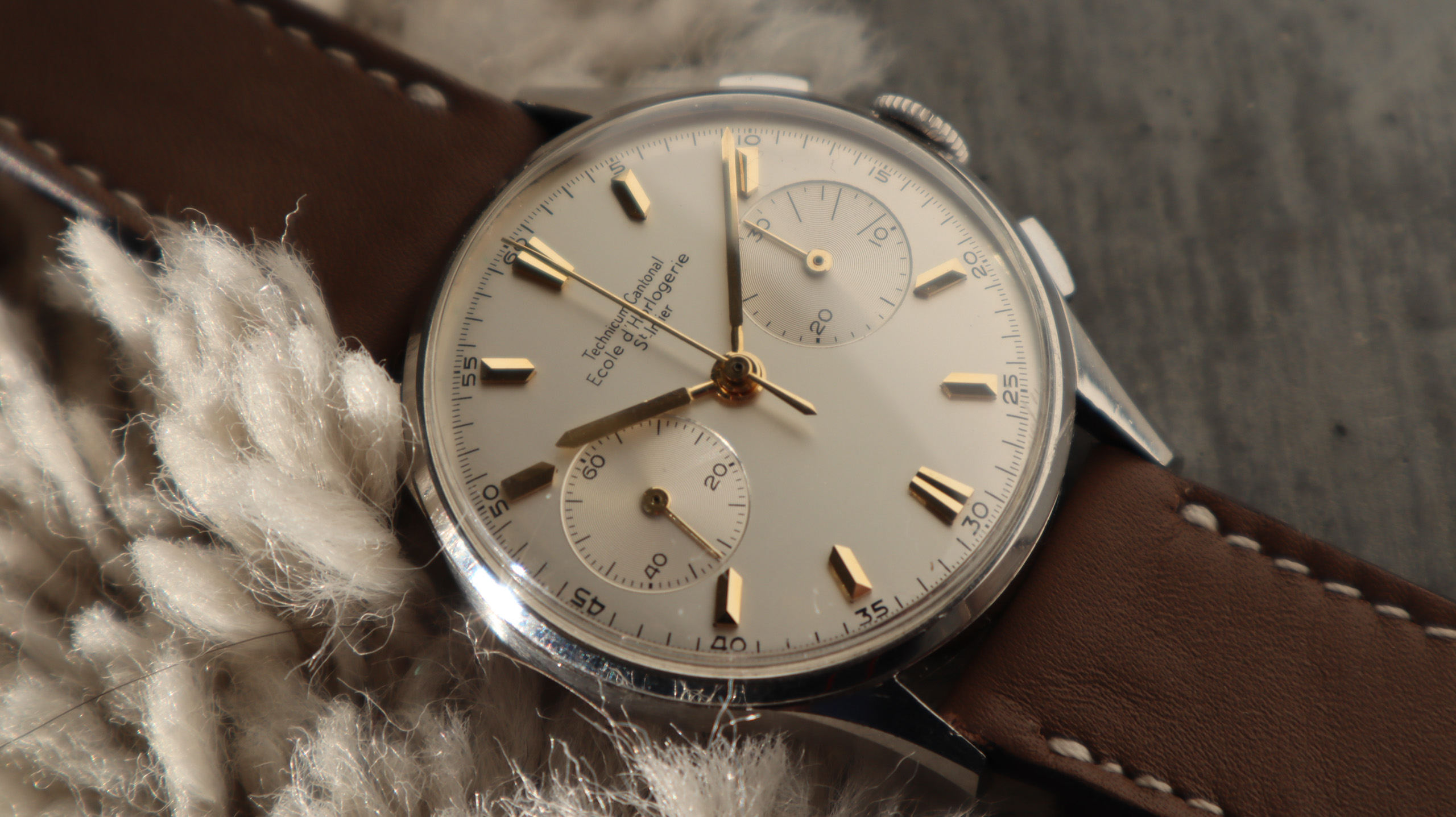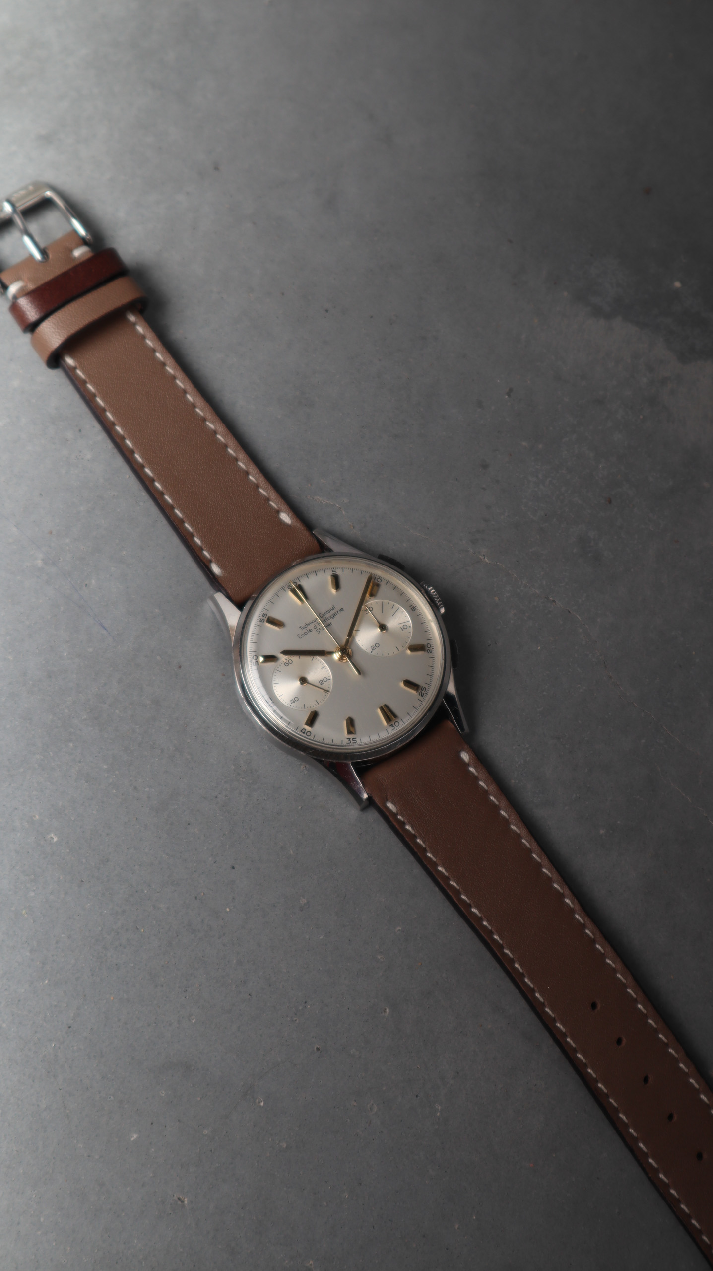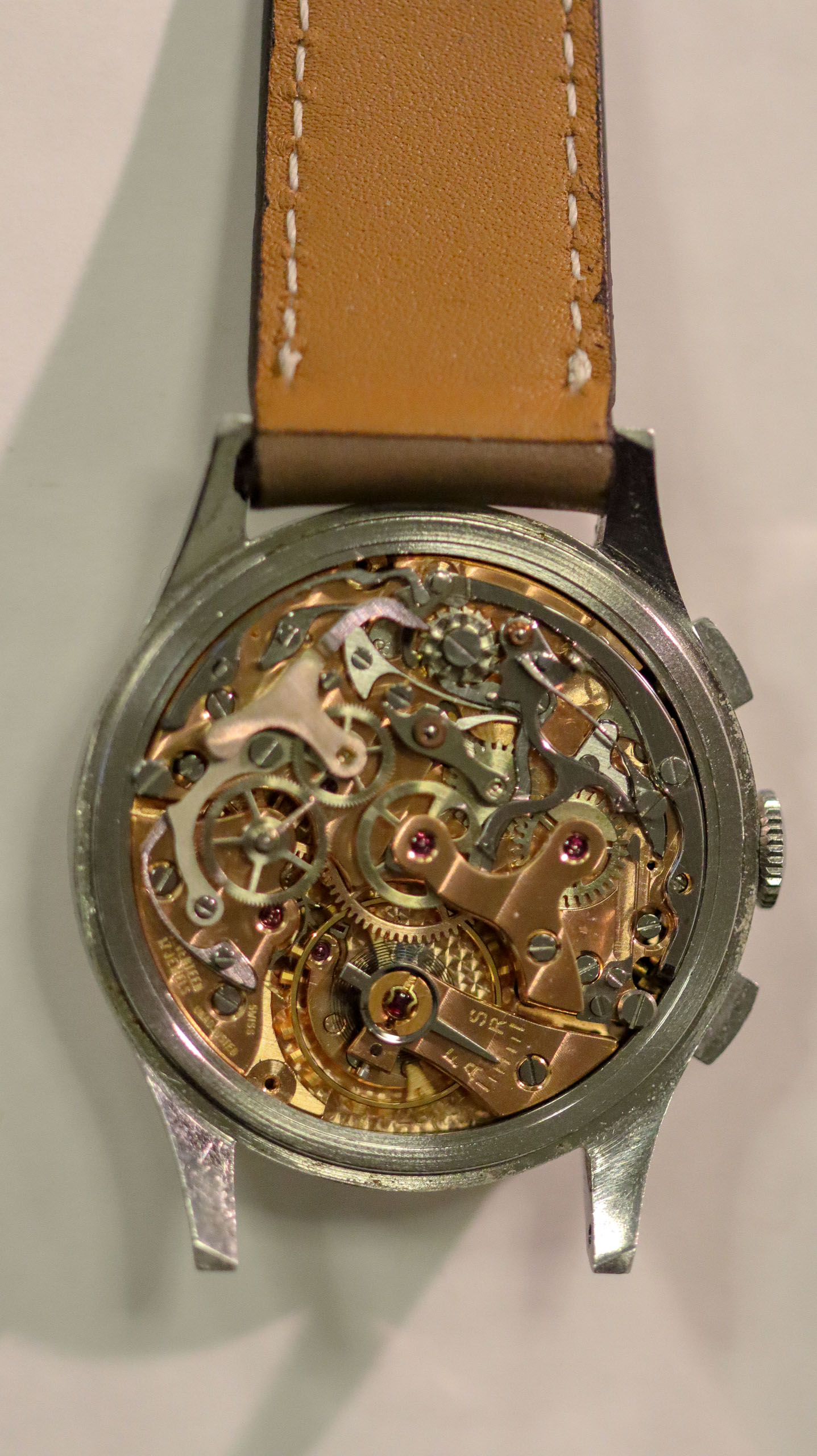 Some of the students who graduated as a Ingénieur Technicien after 5 and 1/2 years also made an additional optional wristwatch to complete their course. This watch is such a piece. It was bought by a collector friend who’s interest lies in the chronometer pocket and desk watches. This is sort of his side catch. He bought this piece directly from an alumnus from the Technicum Cantonal Ecole d’Horlogerie St’ Imier. I am completely in love with this piece since it shows an unique craftsmanship. It has the coveted Valjoux 23 movement inside, which is a celebrated hand-winding chronograph movement in the Valjoux 72 family produced from 1916 through 1974. The Valjoux 23 and 72 are almost identical except that the latter adds a 12 hour counter at 6:00 on the dial.The Valjoux 23 family is 13 ligne in size (29.5 mm) with a nine-pillar column wheel. It is typically a two-register design, with small seconds at 9:00 and a 30- or 45-minute counter at 3:00.