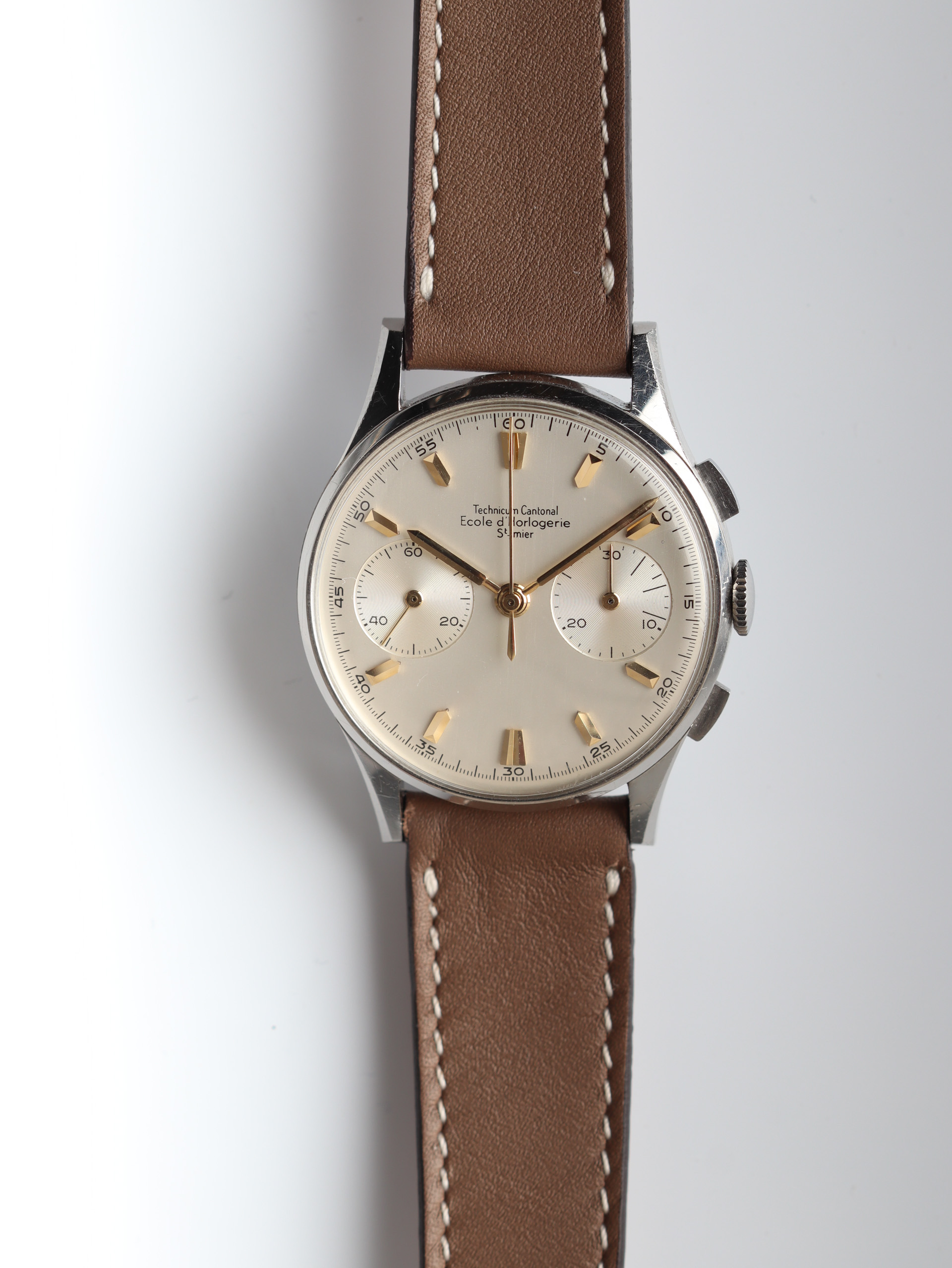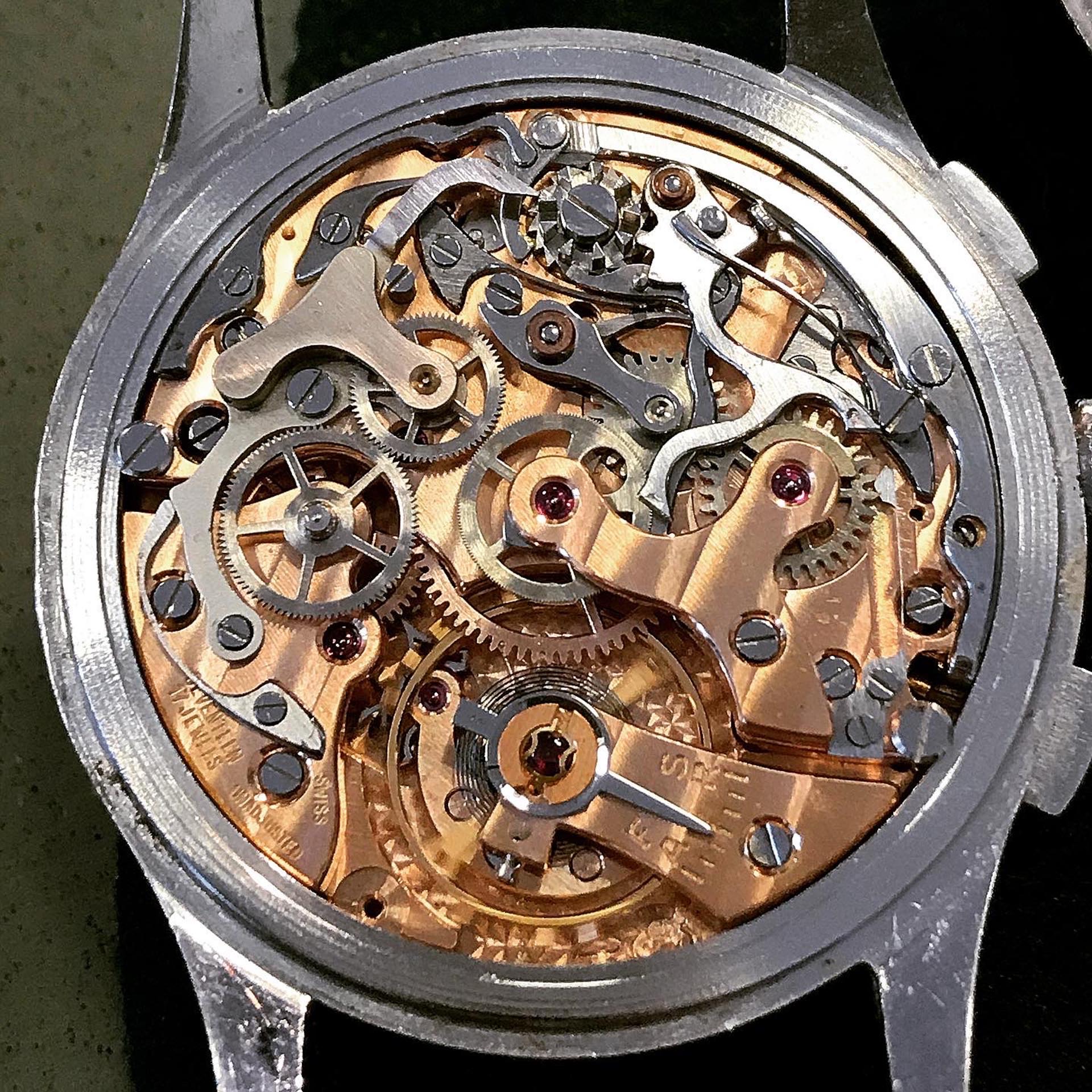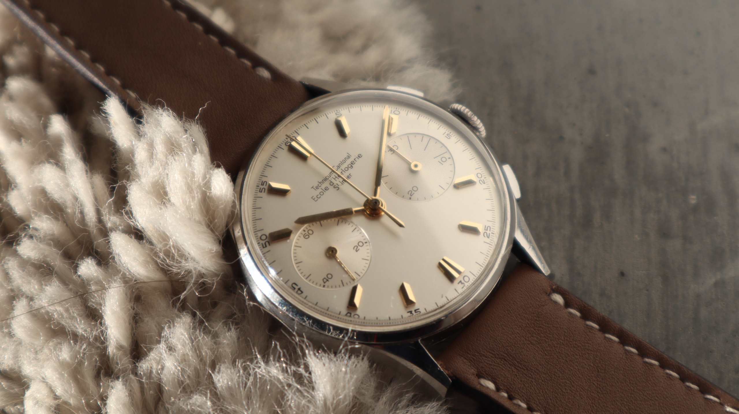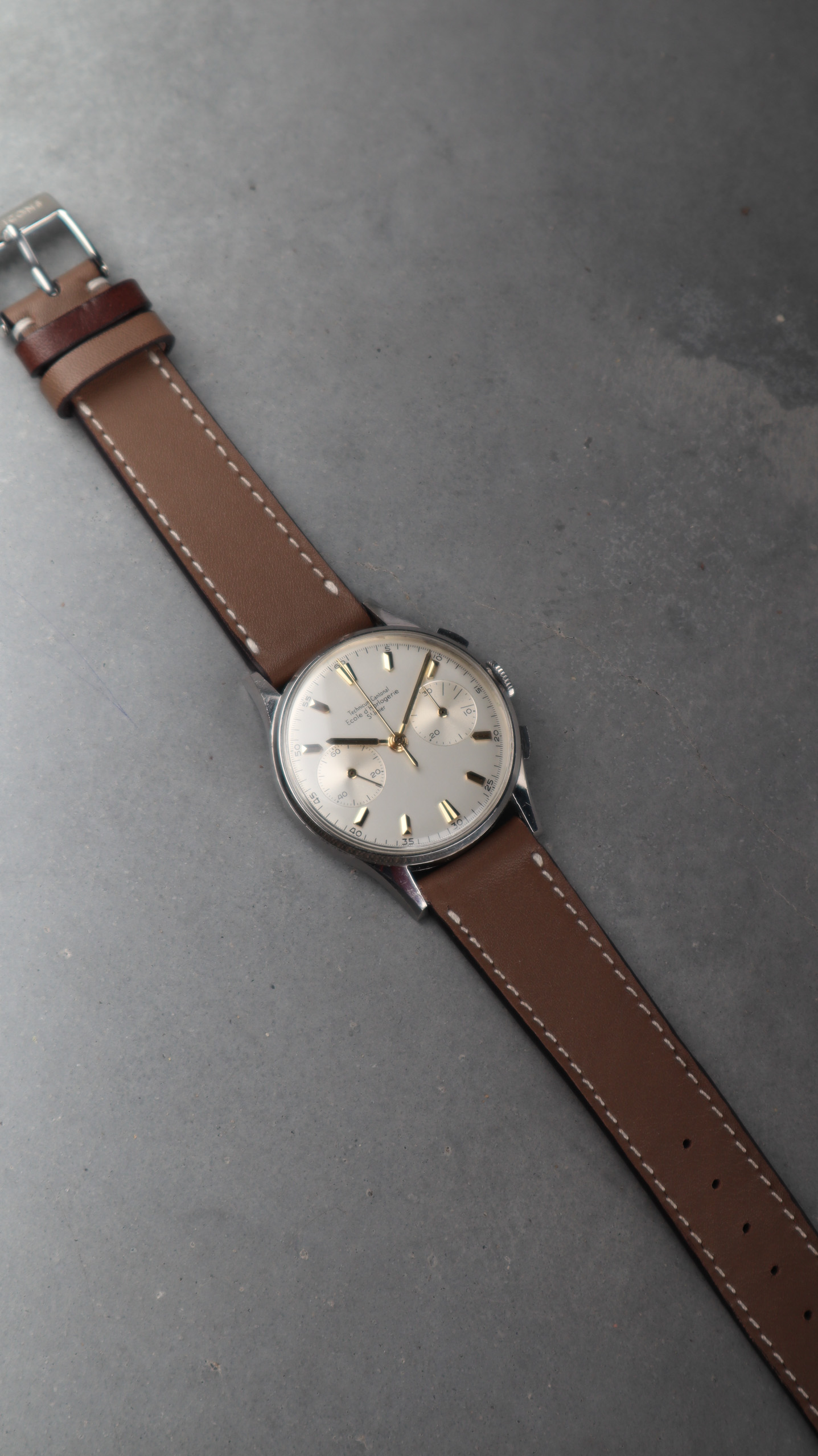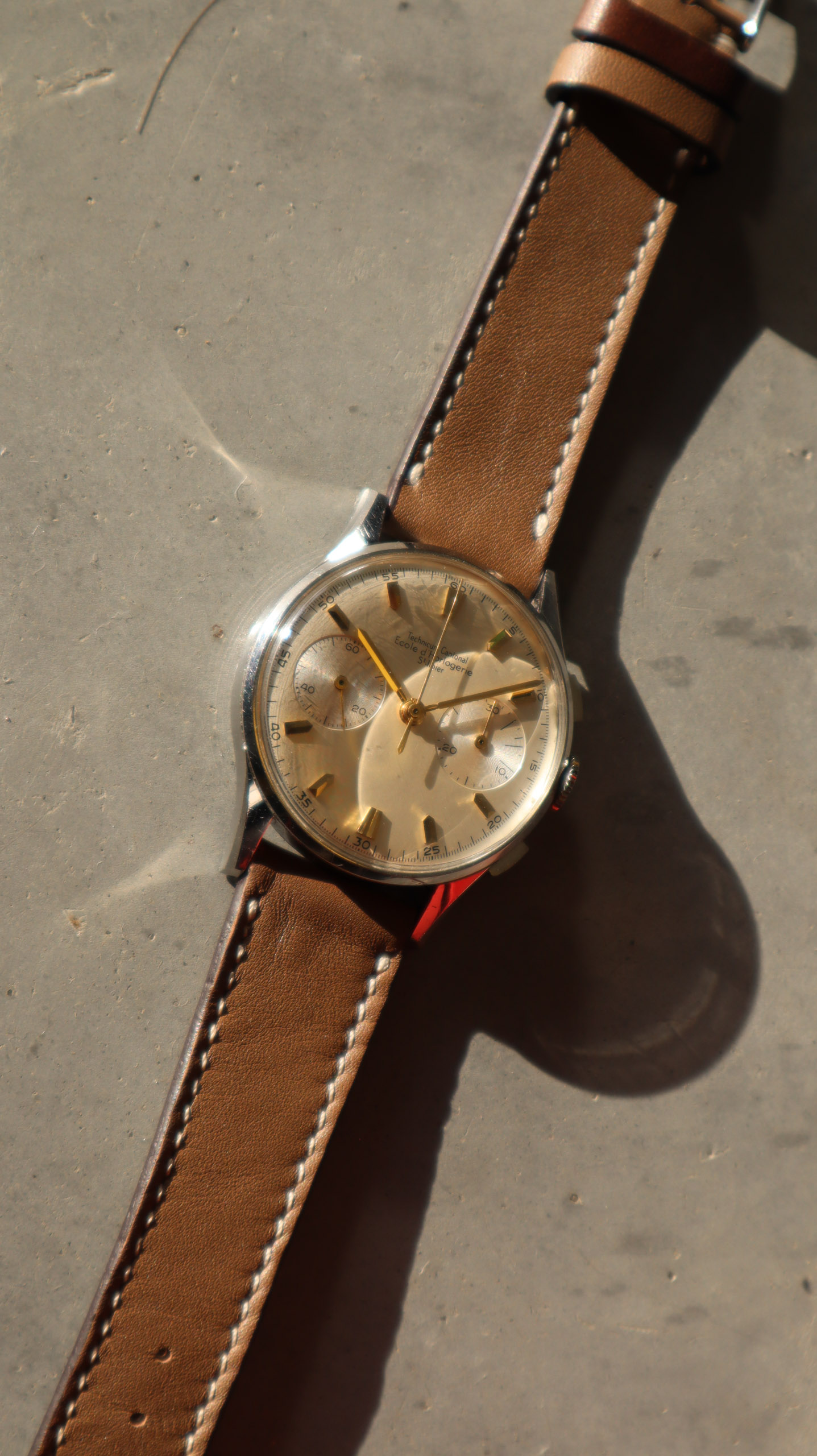 Some of the students who graduated as a Ingénieur Technicien after 5 and 1/2 years also made an additional optional wristwatch to complete their course. This watch is such a piece. It was bought by a collector friend who’s interest lies in the chronometer pocket and desk watches. This is sort of his side catch. He bought this piece directly from an alumnus from the Technicum Cantonal Ecole d’Horlogerie St’ Imier. I am completely in love with this piece since it shows an unique craftsmanship. It has the coveted Valjoux 23 movement inside, which is a celebrated hand-winding chronograph movement in the Valjoux 72 family produced from 1916 through 1974. The Valjoux 23 and 72 are almost identical except that the latter adds a 12 hour counter at 6:00 on the dial.The Valjoux 23 family is 13 ligne in size (29.5 mm) with a nine-pillar column wheel. It is typically a two-register design, with small seconds at 9:00 and a 30- or 45-minute counter at 3:00.
