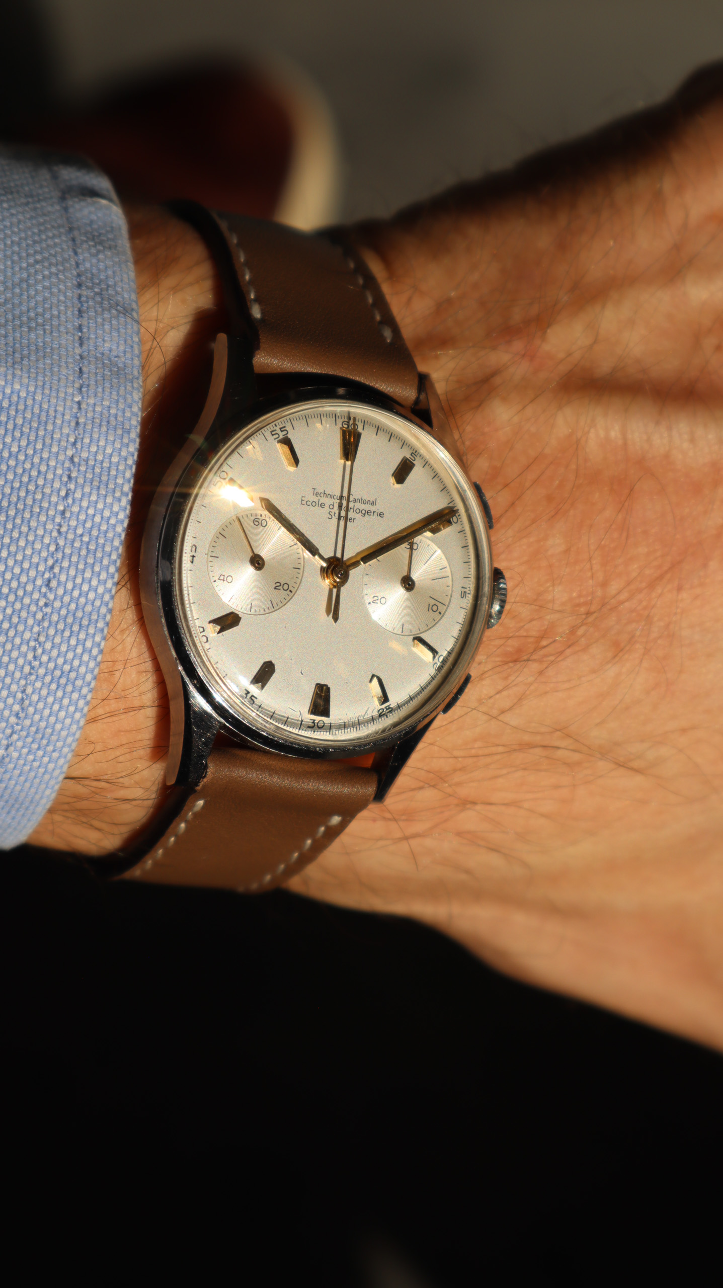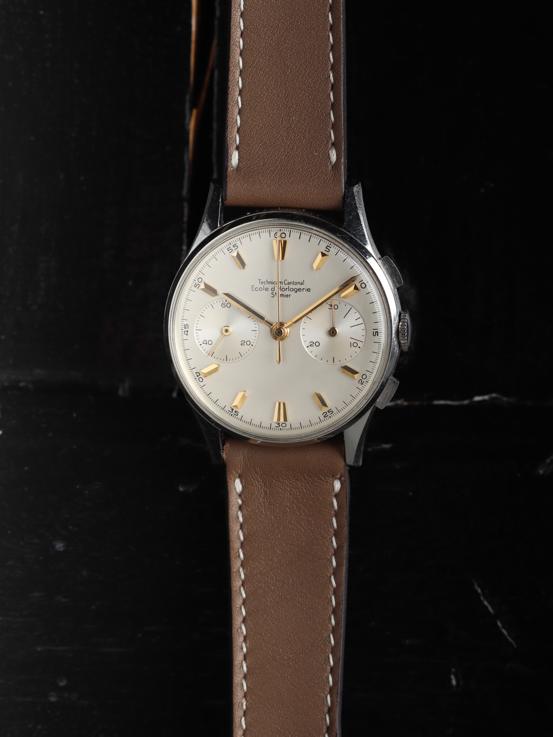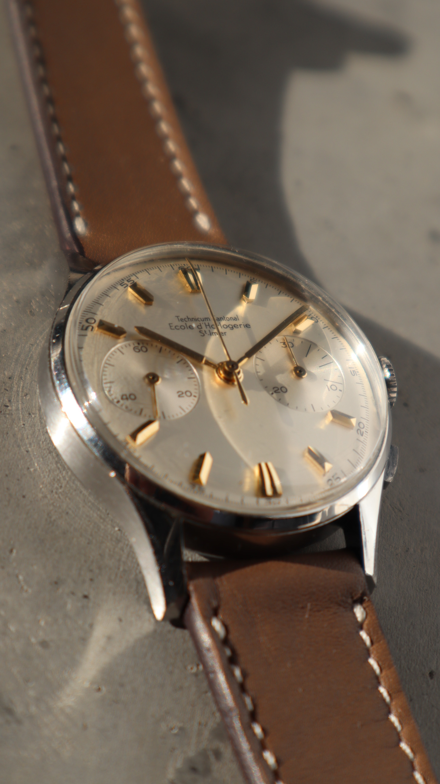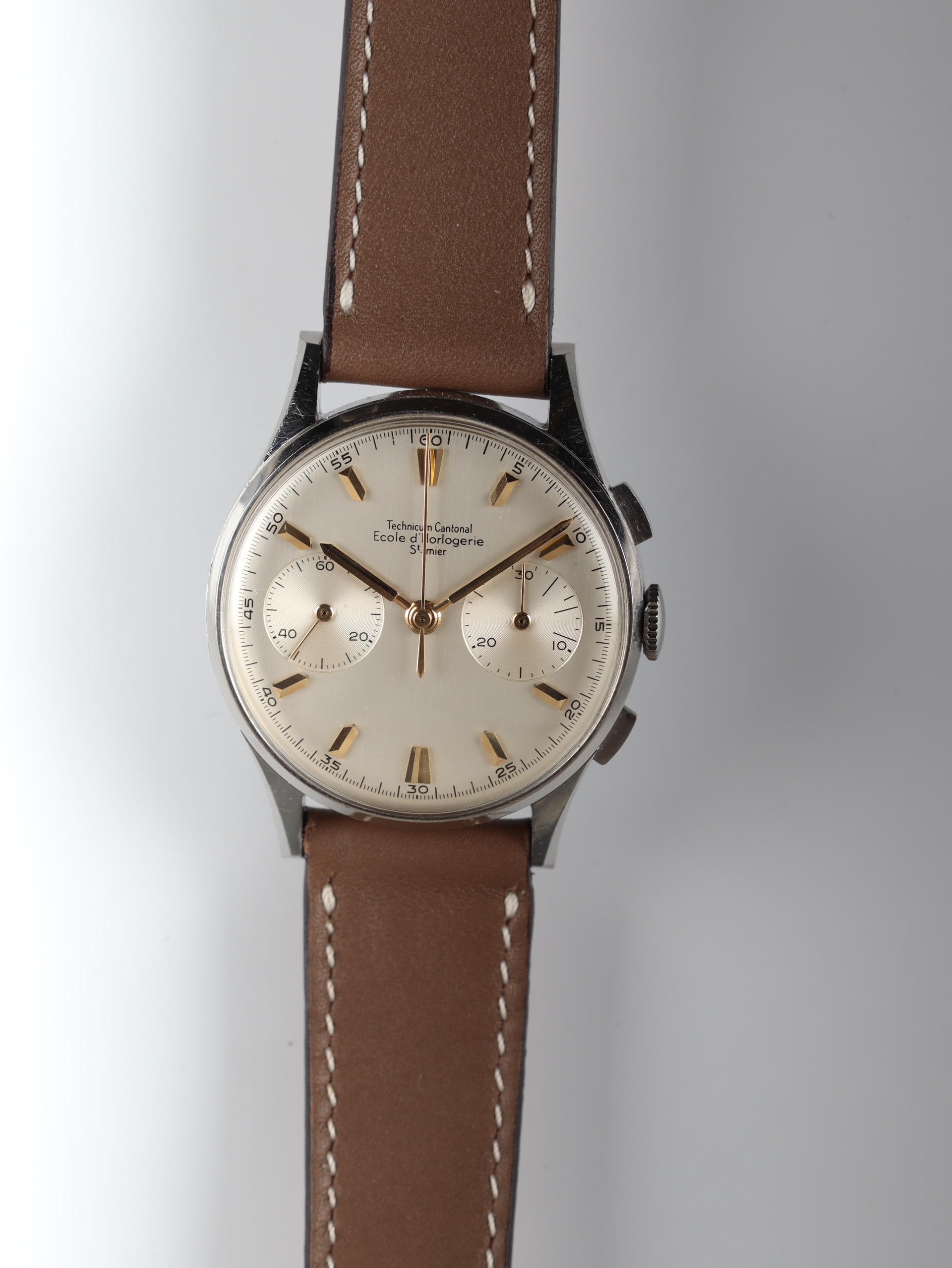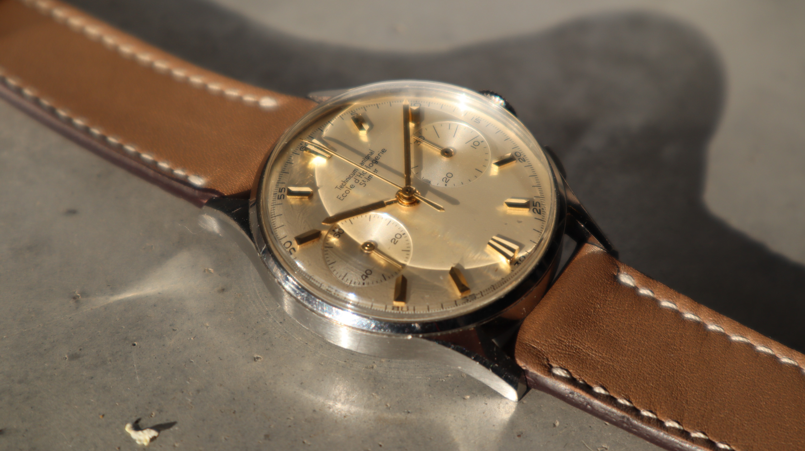 Some of the students who graduated as a Ingénieur Technicien after 5 and 1/2 years also made an additional optional wristwatch to complete their course. This watch is such a piece. It was bought by a collector friend who’s interest lies in the chronometer pocket and desk watches. This is sort of his side catch. He bought this piece directly from an alumnus from the Technicum Cantonal Ecole d’Horlogerie St’ Imier. I am completely in love with this piece since it shows an unique craftsmanship. It has the coveted Valjoux 23 movement inside, which is a celebrated hand-winding chronograph movement in the Valjoux 72 family produced from 1916 through 1974. The Valjoux 23 and 72 are almost identical except that the latter adds a 12 hour counter at 6:00 on the dial.The Valjoux 23 family is 13 ligne in size (29.5 mm) with a nine-pillar column wheel. It is typically a two-register design, with small seconds at 9:00 and a 30- or 45-minute counter at 3:00.