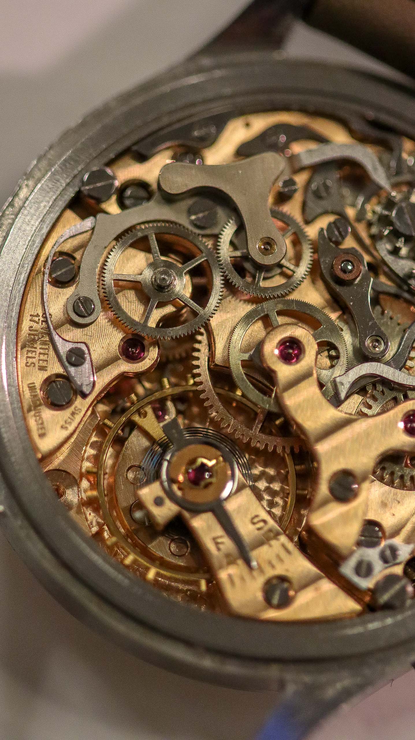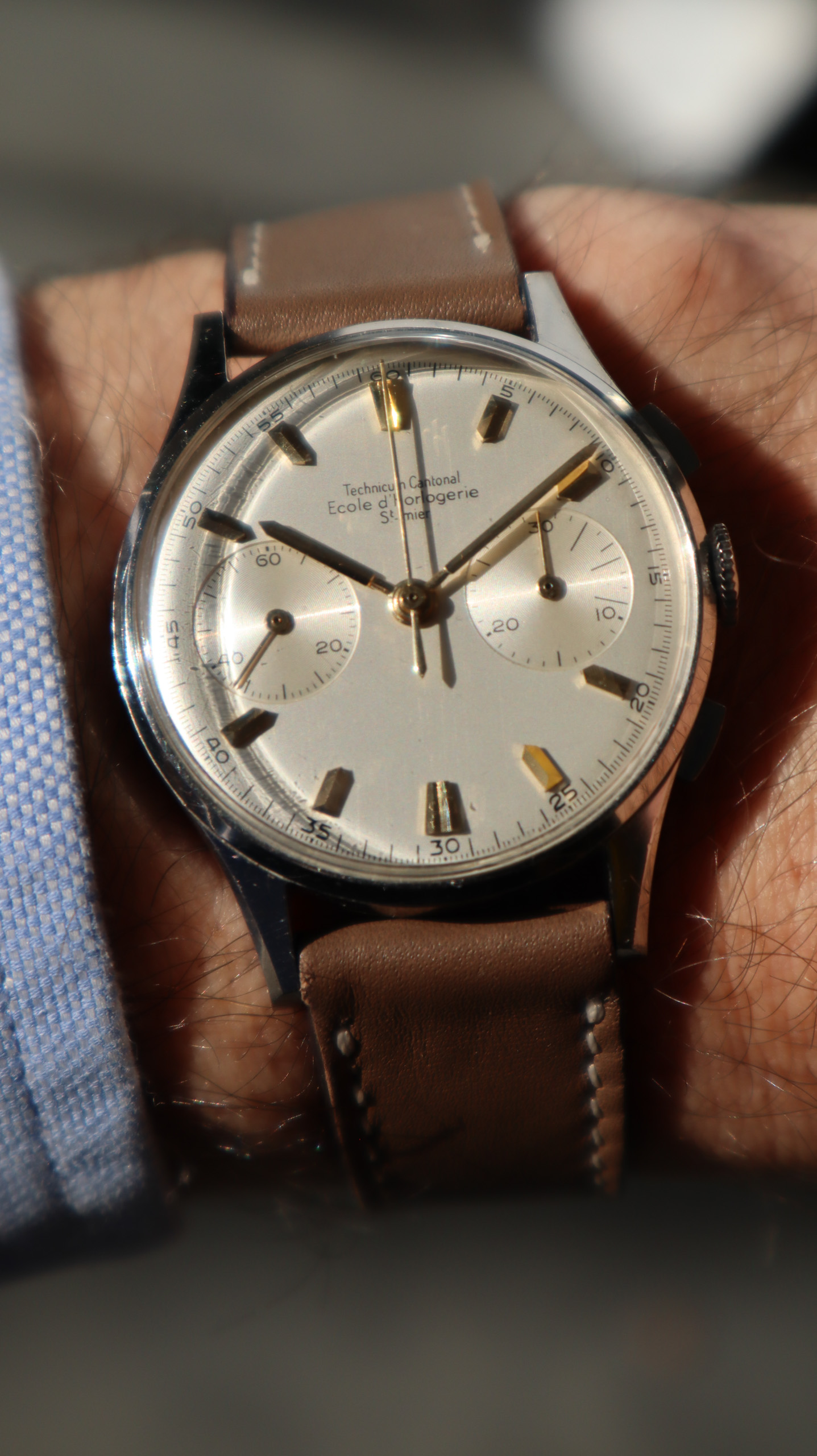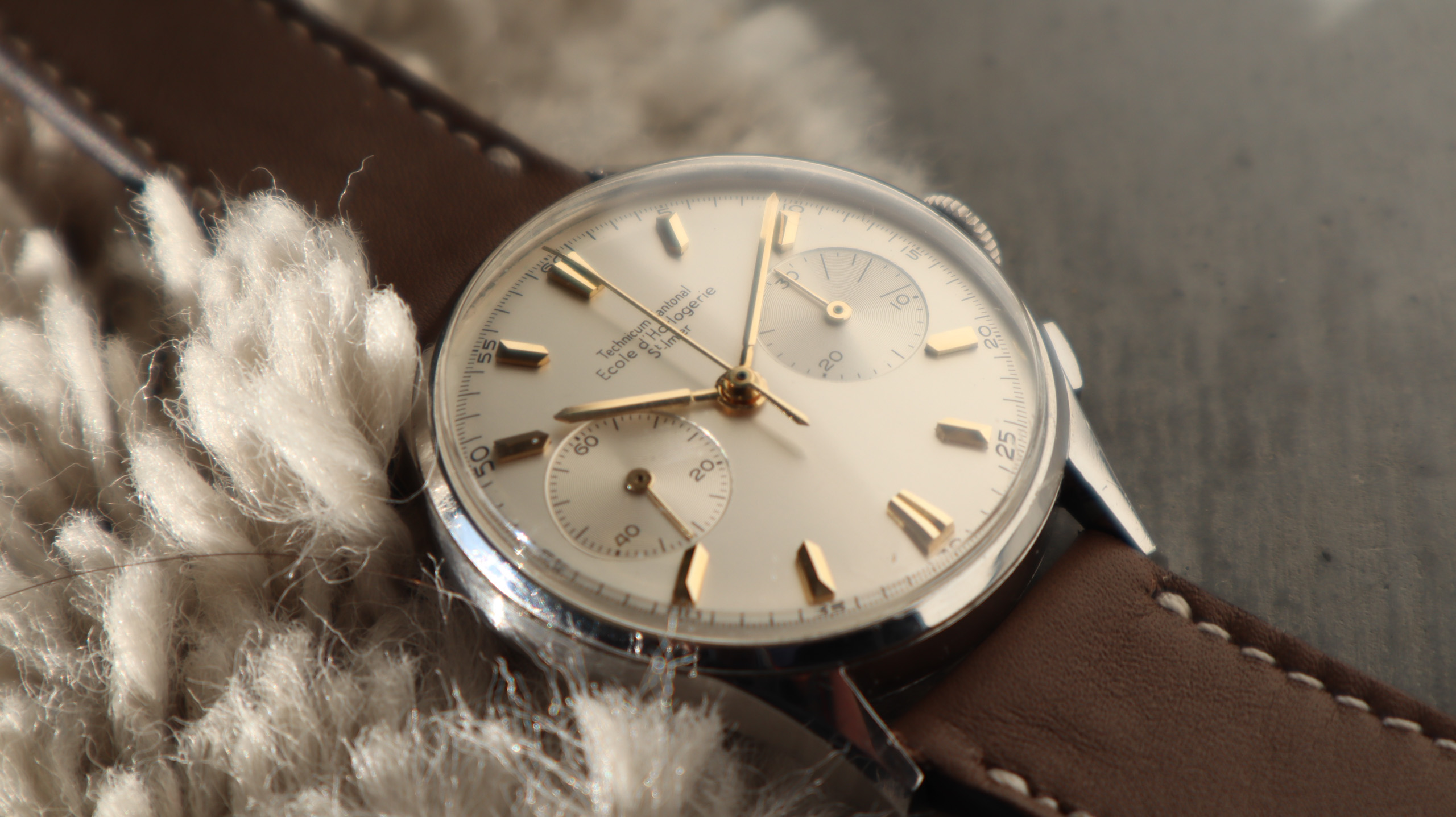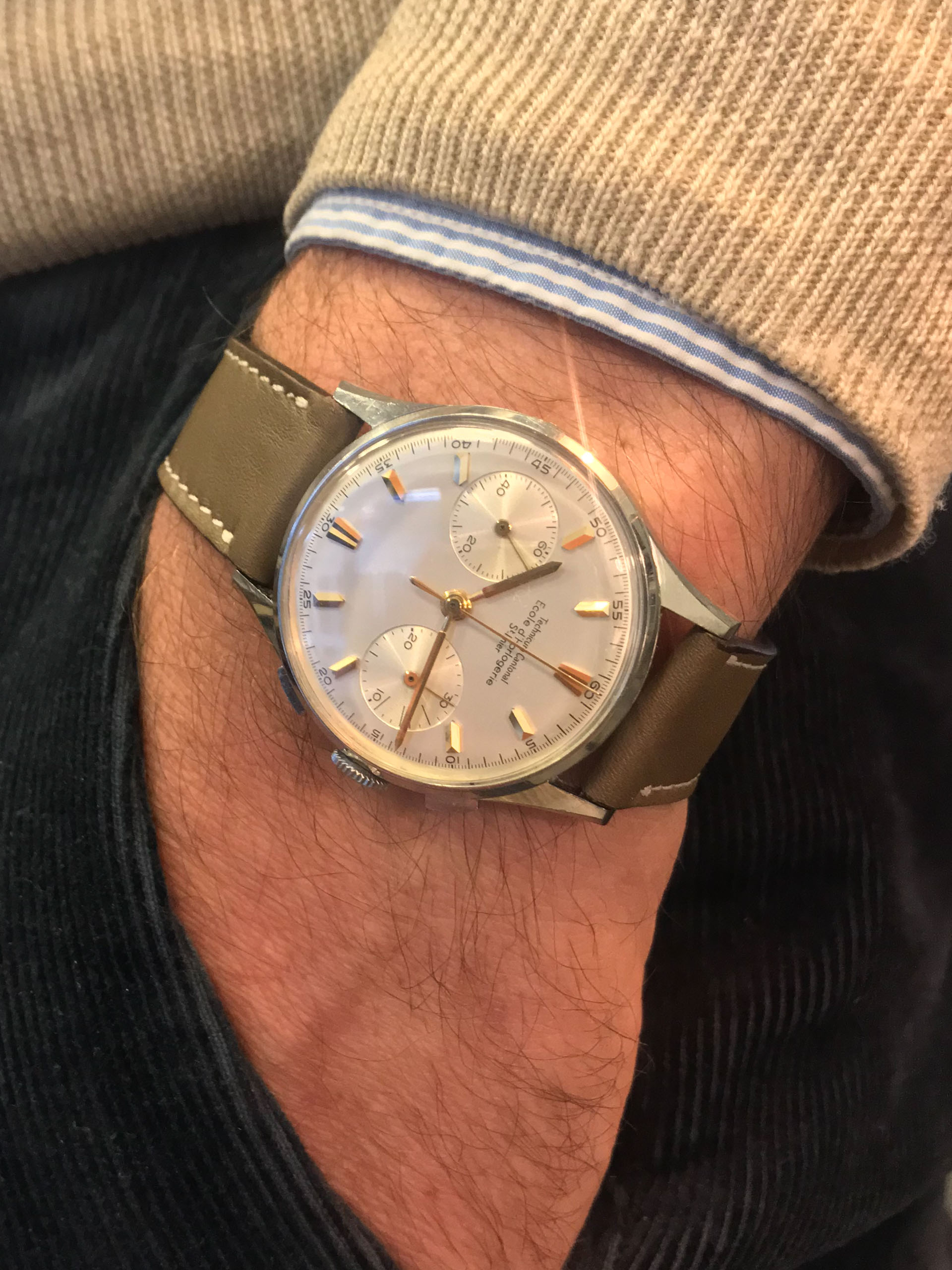 Some of the students who graduated as a Ingénieur Technicien after 5 and 1/2 years also made an additional optional wristwatch to complete their course. This watch is such a piece. It was bought by a collector friend who’s interest lies in the chronometer pocket and desk watches. This is sort of his side catch. He bought this piece directly from an alumnus from the Technicum Cantonal Ecole d’Horlogerie St’ Imier. I am completely in love with this piece since it shows an unique craftsmanship. It has the coveted Valjoux 23 movement inside, which is a celebrated hand-winding chronograph movement in the Valjoux 72 family produced from 1916 through 1974. The Valjoux 23 and 72 are almost identical except that the latter adds a 12 hour counter at 6:00 on the dial.The Valjoux 23 family is 13 ligne in size (29.5 mm) with a nine-pillar column wheel. It is typically a two-register design, with small seconds at 9:00 and a 30- or 45-minute counter at 3:00.