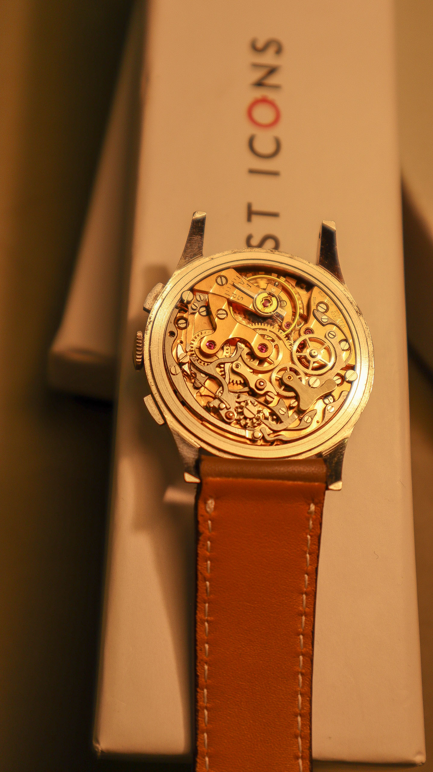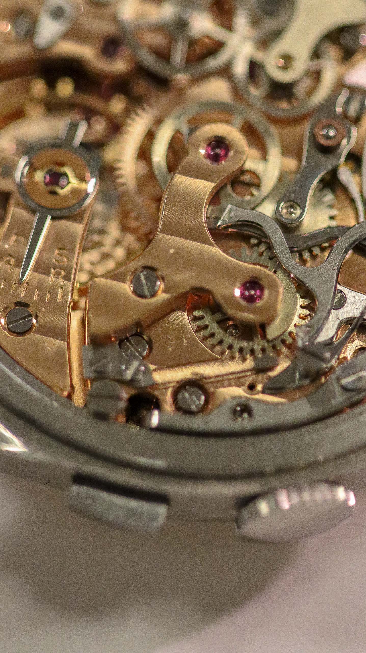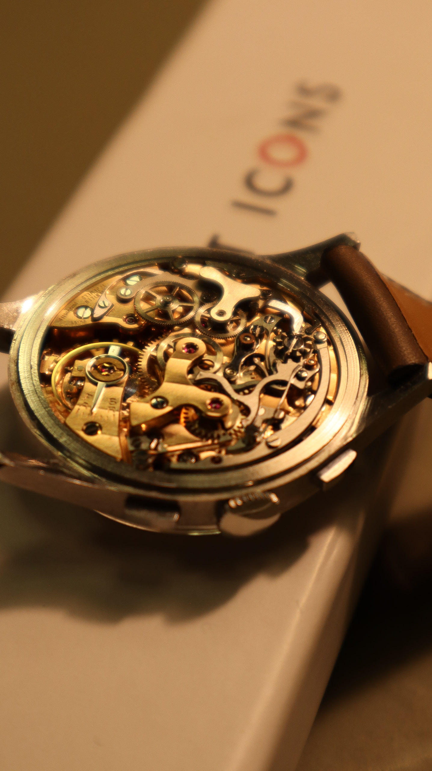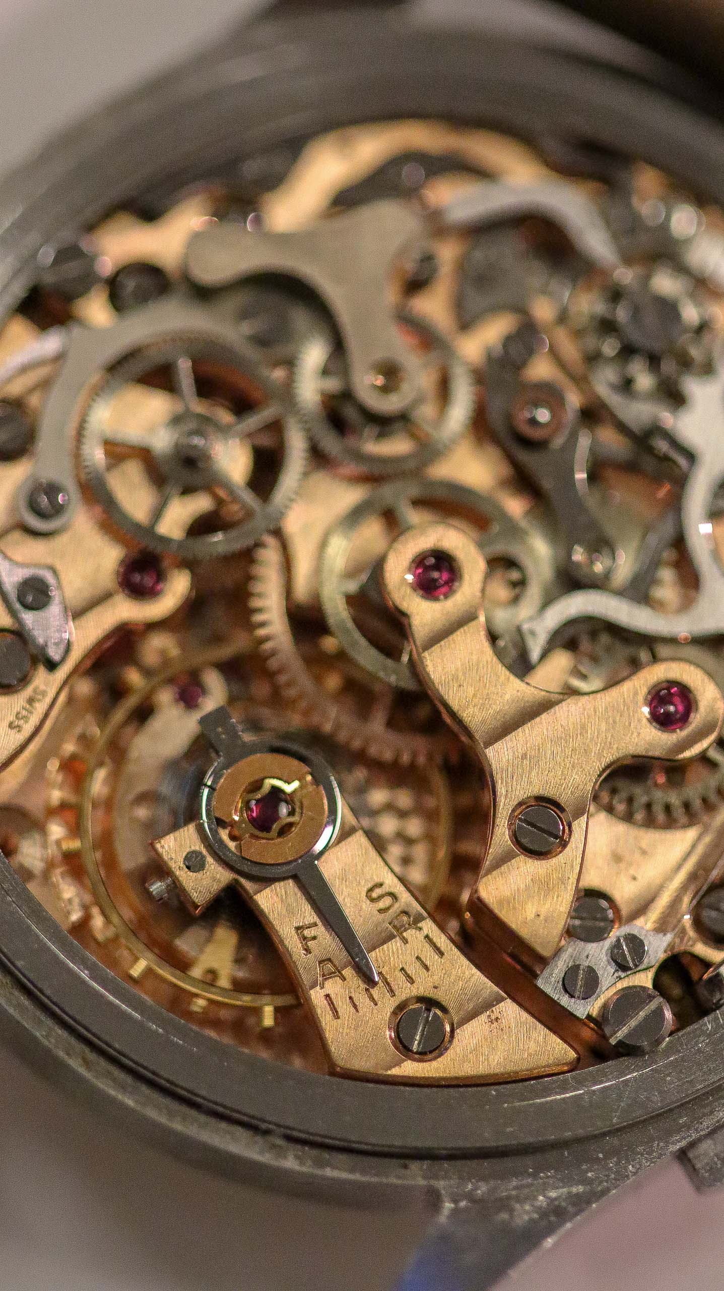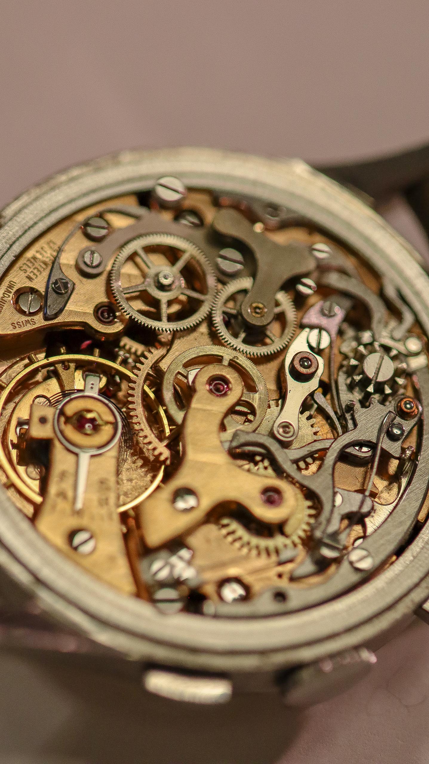 Some of the students who graduated as a Ingénieur Technicien after 5 and 1/2 years also made an additional optional wristwatch to complete their course. This watch is such a piece. It was bought by a collector friend who’s interest lies in the chronometer pocket and desk watches. This is sort of his side catch. He bought this piece directly from an alumnus from the Technicum Cantonal Ecole d’Horlogerie St’ Imier. I am completely in love with this piece since it shows an unique craftsmanship. It has the coveted Valjoux 23 movement inside, which is a celebrated hand-winding chronograph movement in the Valjoux 72 family produced from 1916 through 1974. The Valjoux 23 and 72 are almost identical except that the latter adds a 12 hour counter at 6:00 on the dial.The Valjoux 23 family is 13 ligne in size (29.5 mm) with a nine-pillar column wheel. It is typically a two-register design, with small seconds at 9:00 and a 30- or 45-minute counter at 3:00.