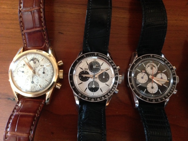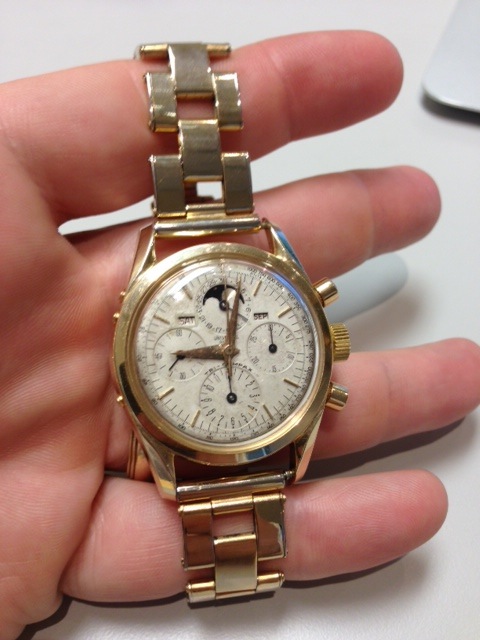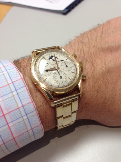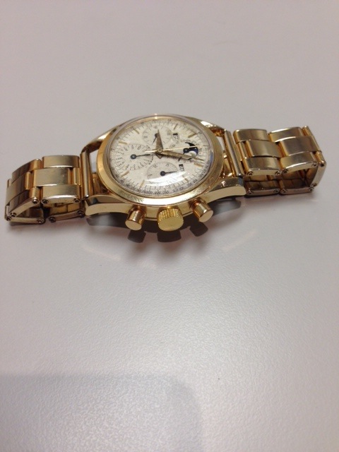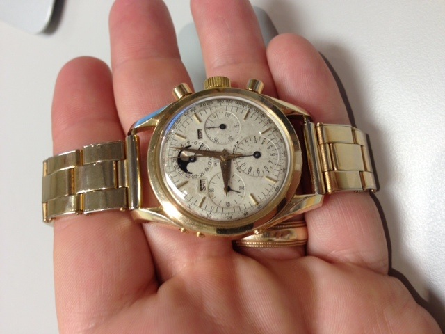 ·I am always searching for interesting vintage items to go along with my tri-compaxes. I almost always wear them on either a vintage bead of rice bracelet, oysters bracelet or cordovan strap (with the occasional alligator mixed in). For my gold one I have only used the strap options until I ran into this interesting bracelet. It is a vintage aftermarket rivet oyster strap with the springs in the links. This is similar to what would have been used on a vintage bubble back. While it is a little small (18mm vs 19mm) I think it adds an interesting option for wearing a gold tri-compax. the gold plating is almost exactly the same color as the watch so it works well. Tell me what you think! Would love to see some of the interesting things that you all use for your tri-compaxes.