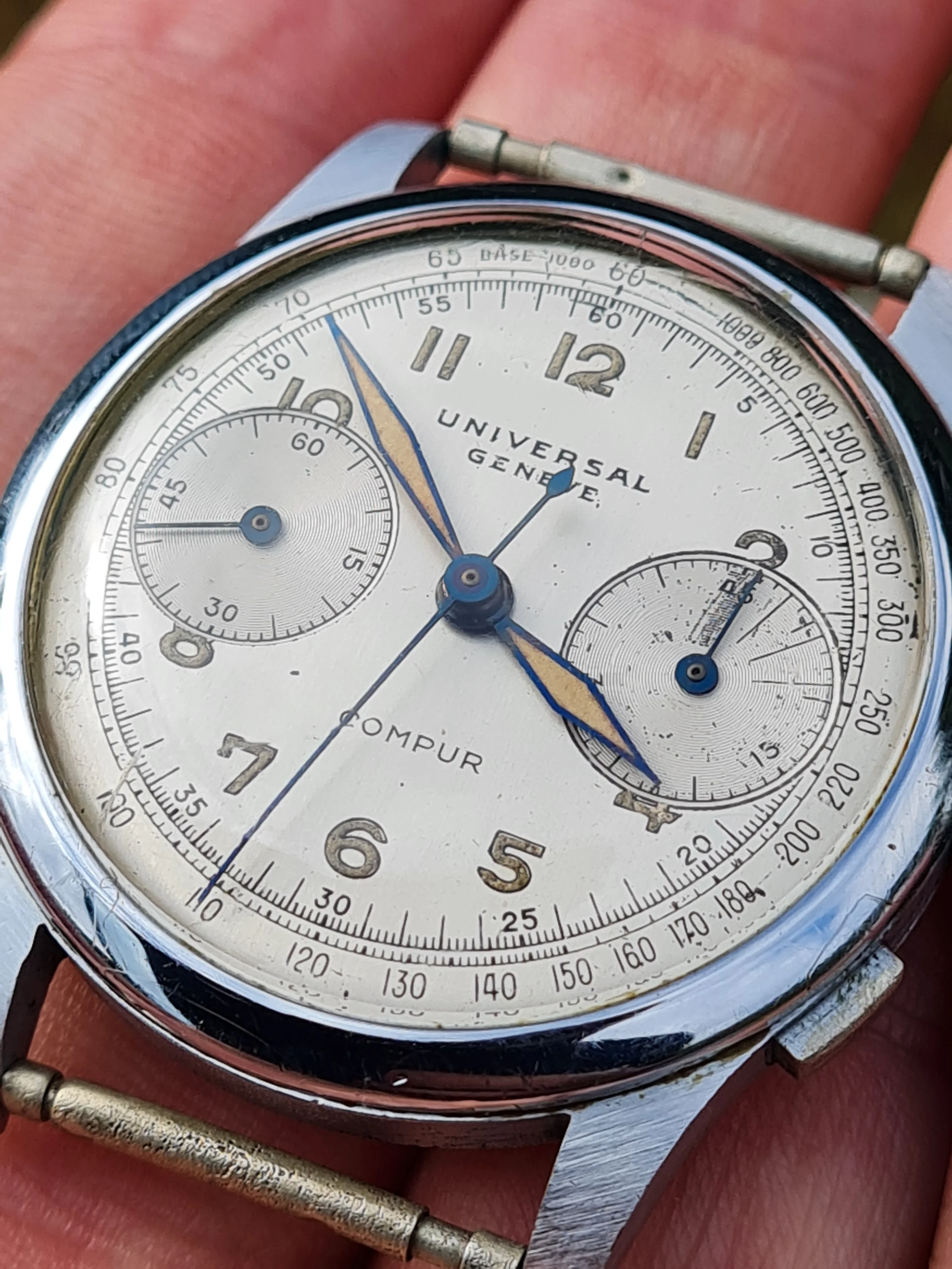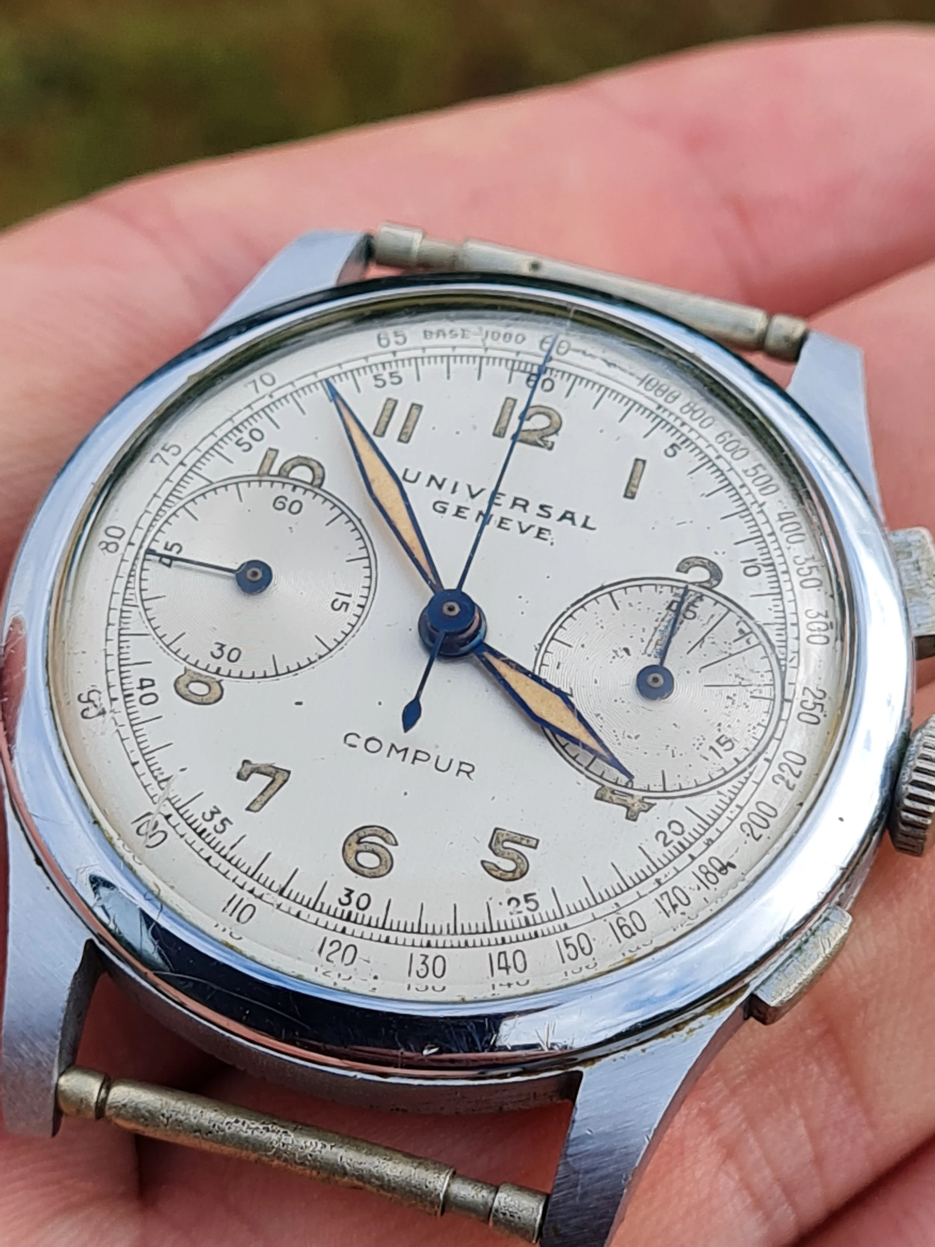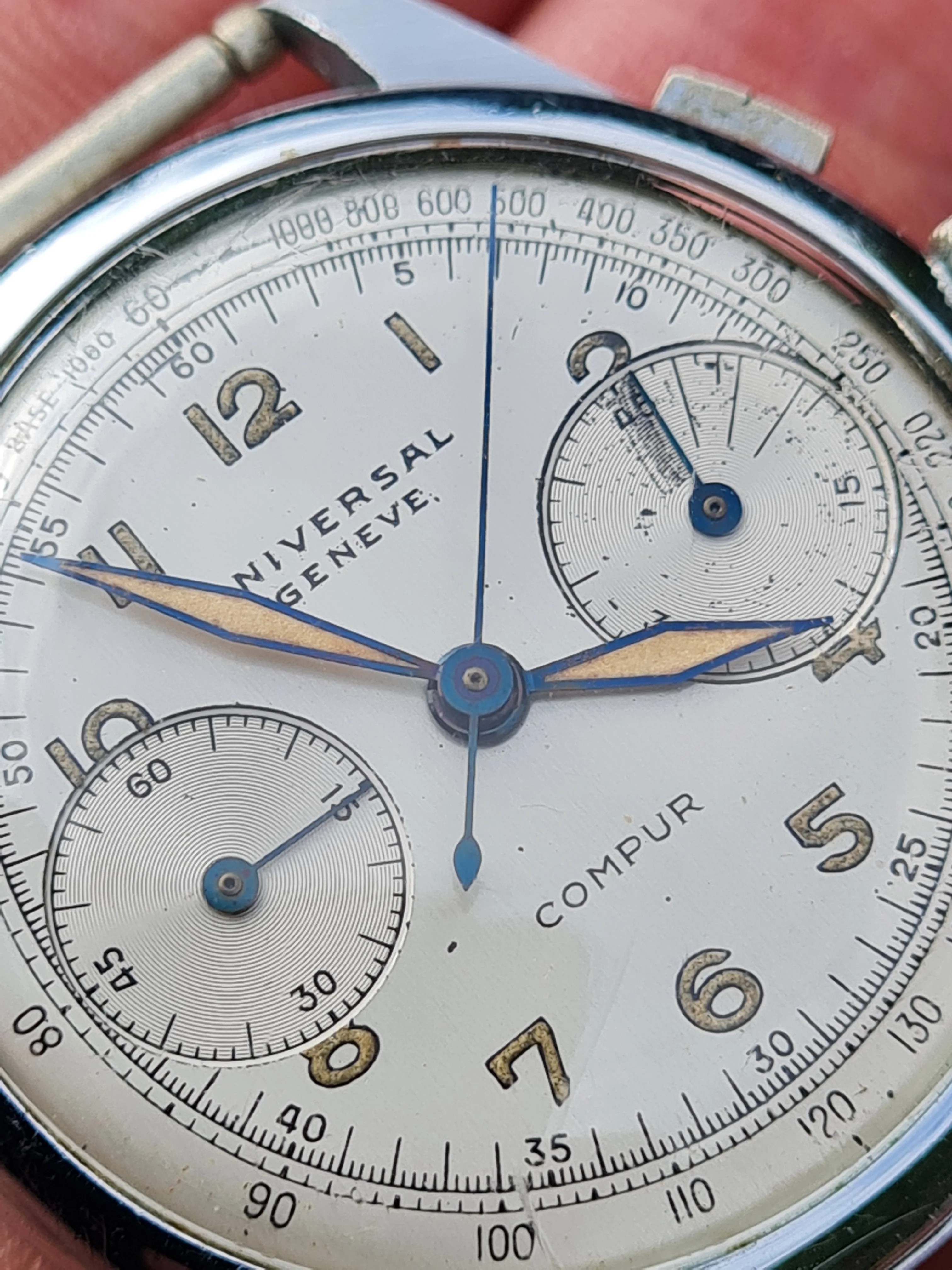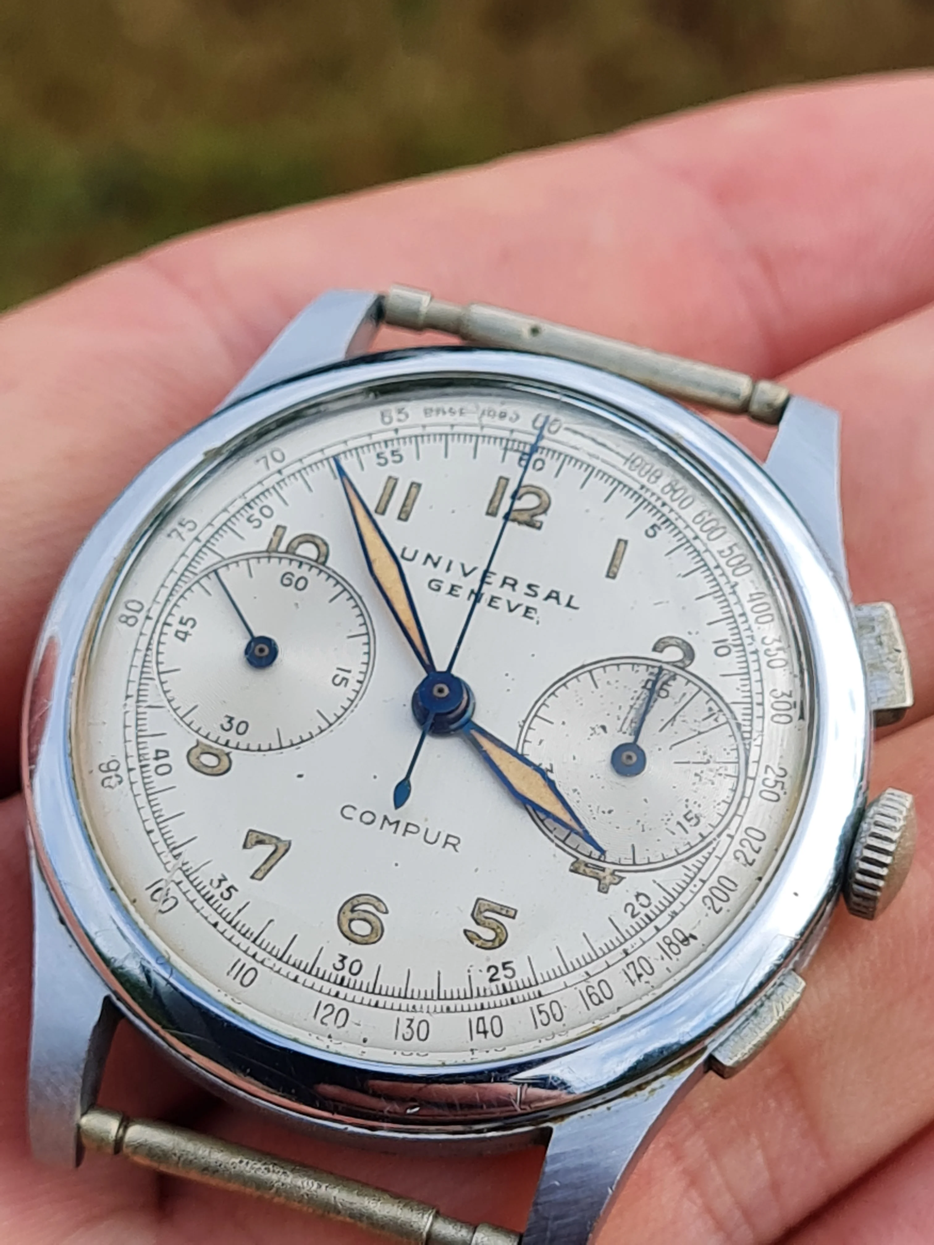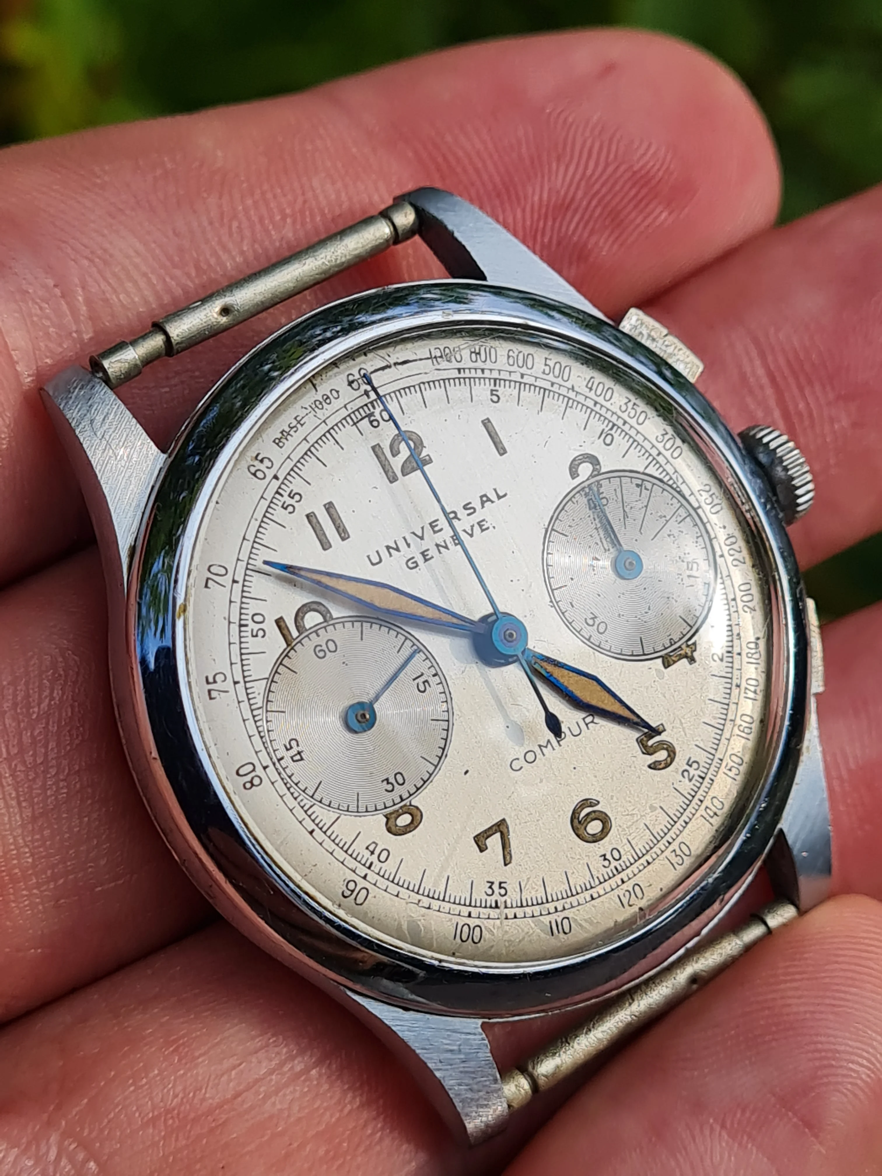 Because I not know Universal Geneve chronographs very well, I did not recognize, that the first number in the reference suggests, that the case is chromed (in this case, I guess nickel-plated and chromed, only back and perhaps bezel should be steel).