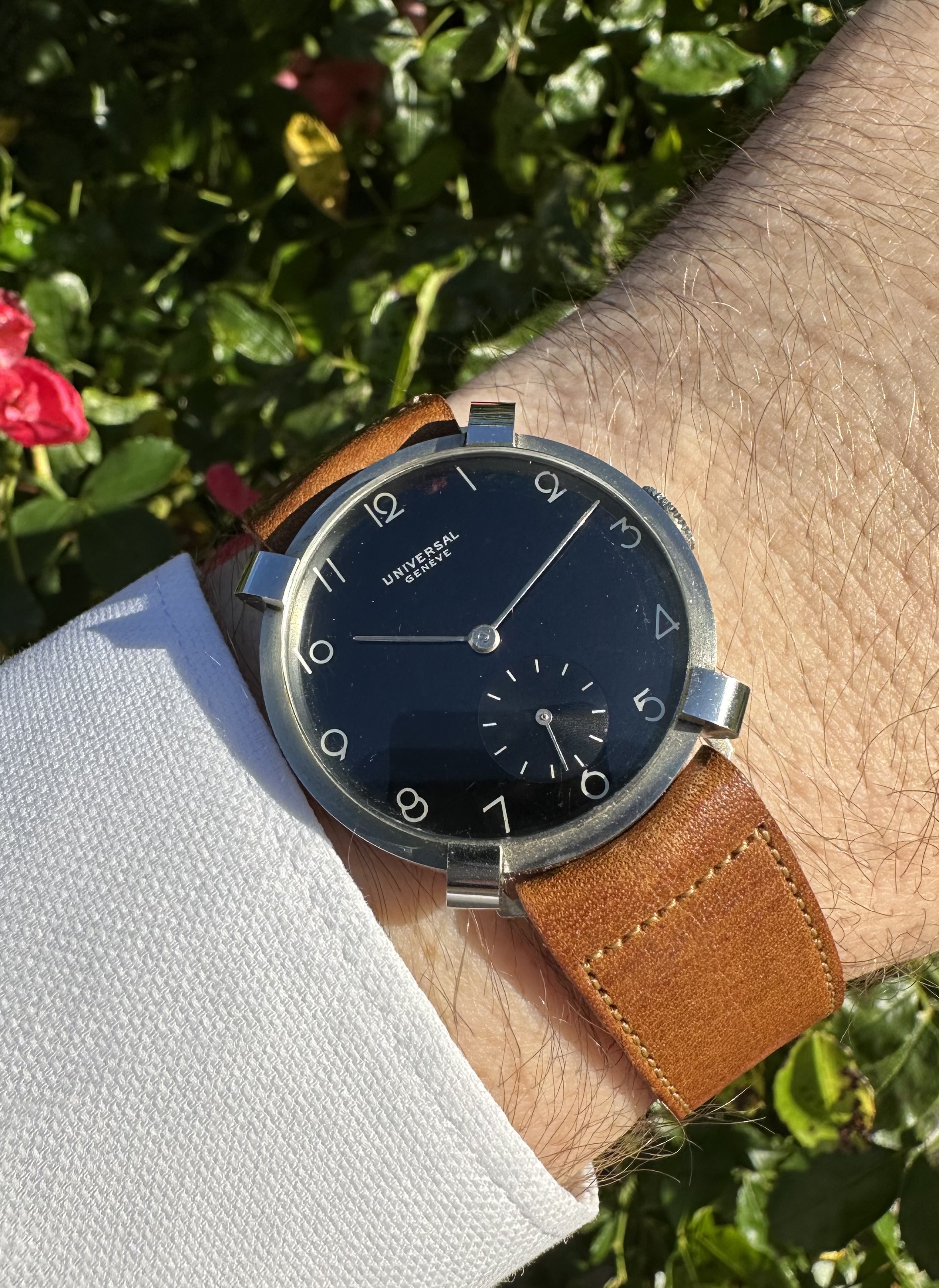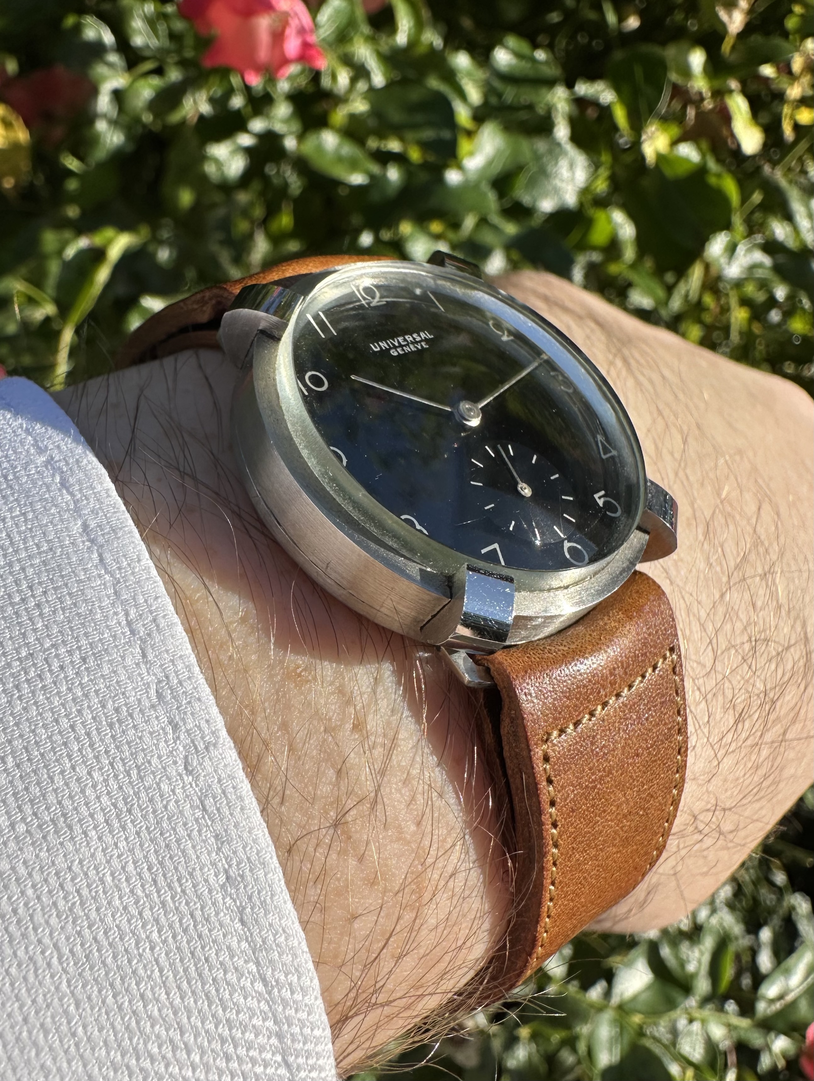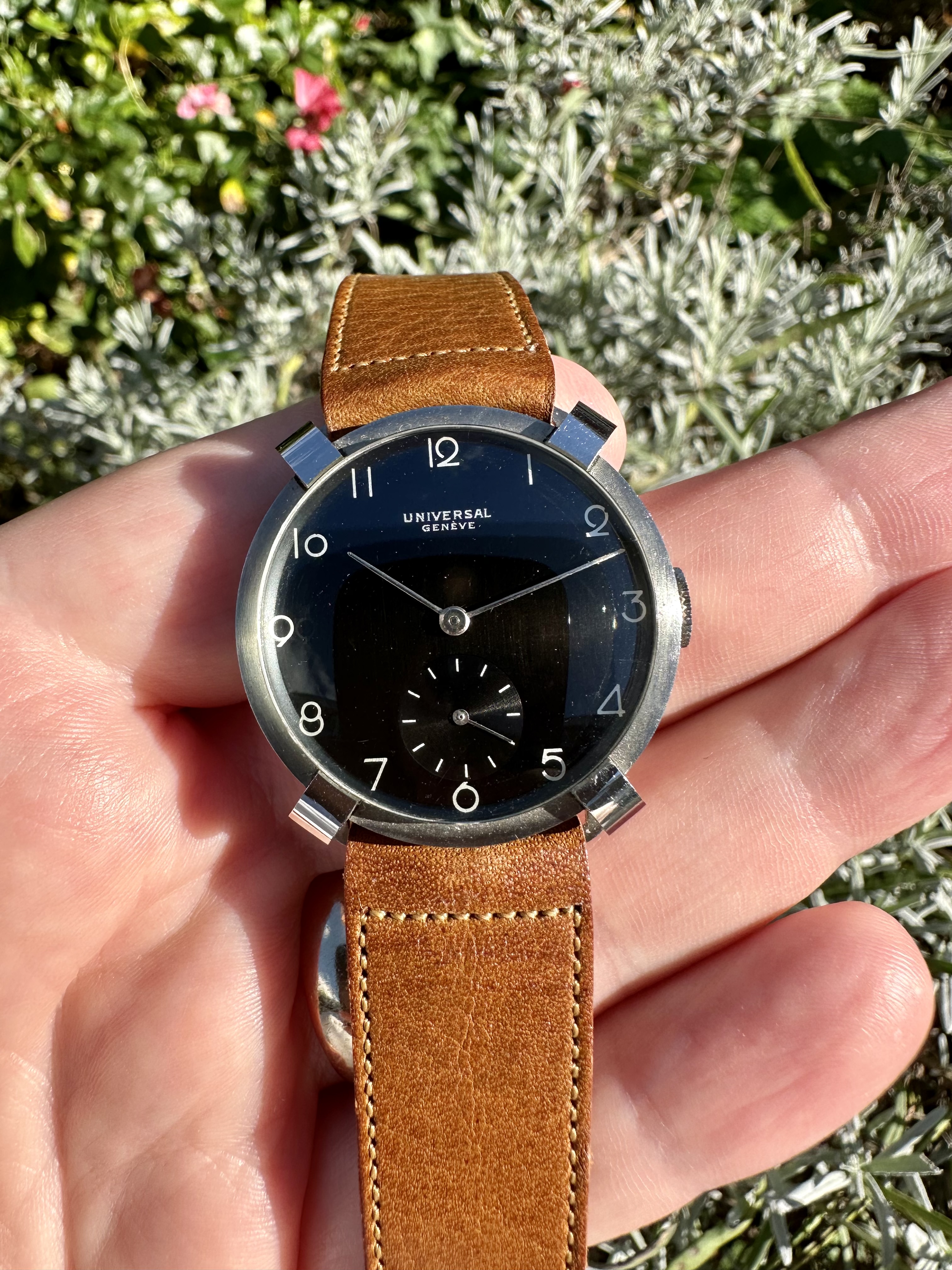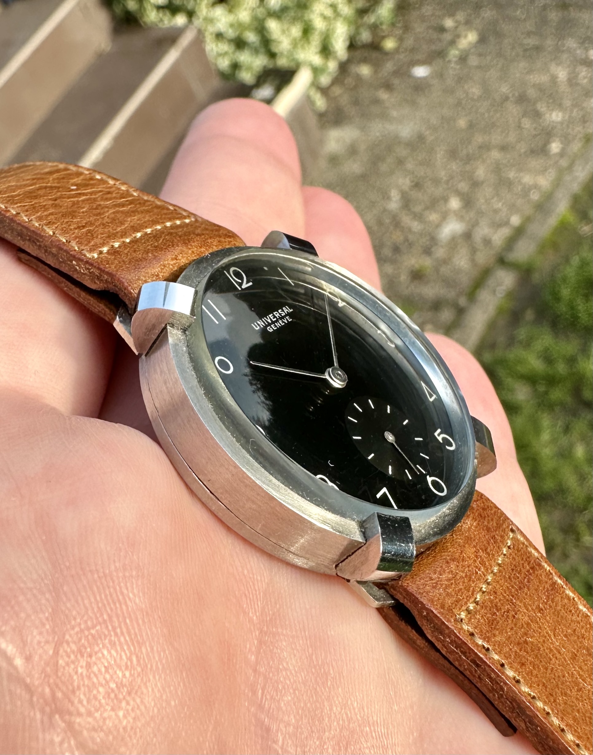 The 34mm fancy case is unlike anything I have ever seen from Universal. The watch feels honest in hand and marked inside-and-out with the usual UG stamps one would expect to find. The case is mostly brush-finished but the faceted edges at 1.15, 4.45, 7.15 and 10.45 have a highly reflective mirror polish on them which adds real drama to the watch at wrist. The lugs are fixed and precisely follow the curve of the case.