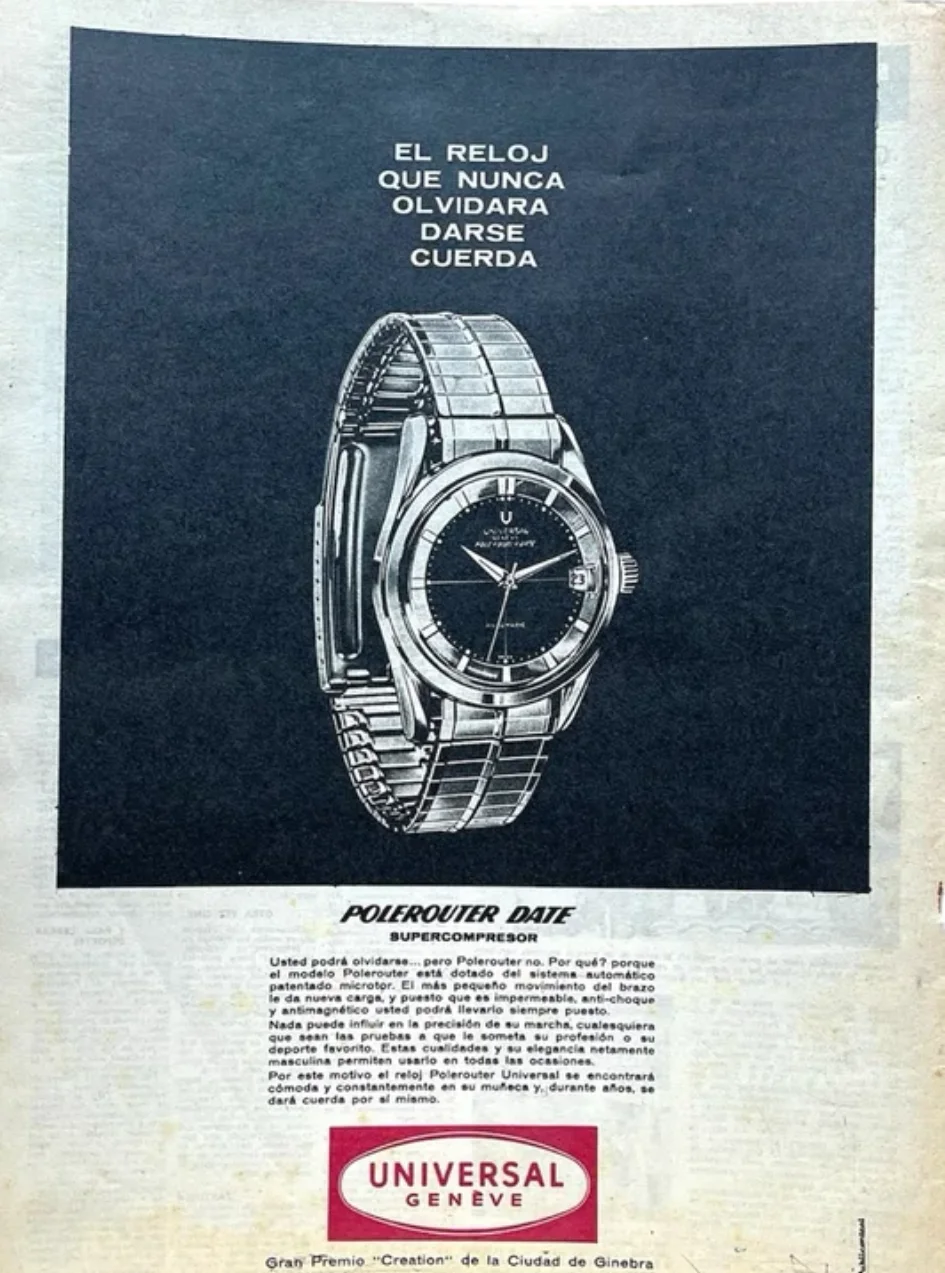 ·Here’s an interesting detail from two Spanish advertisements for the Universal Genève Polerouter: both watches are fitted with a JB Champion bracelet, specifically the TK model, as noted in the Polerouter book. What makes this notable is that the bracelet features 17mm end links, while the watch has 19mm lugs. Despite the visible gap between the bracelet and the case, this was an original factory configuration.