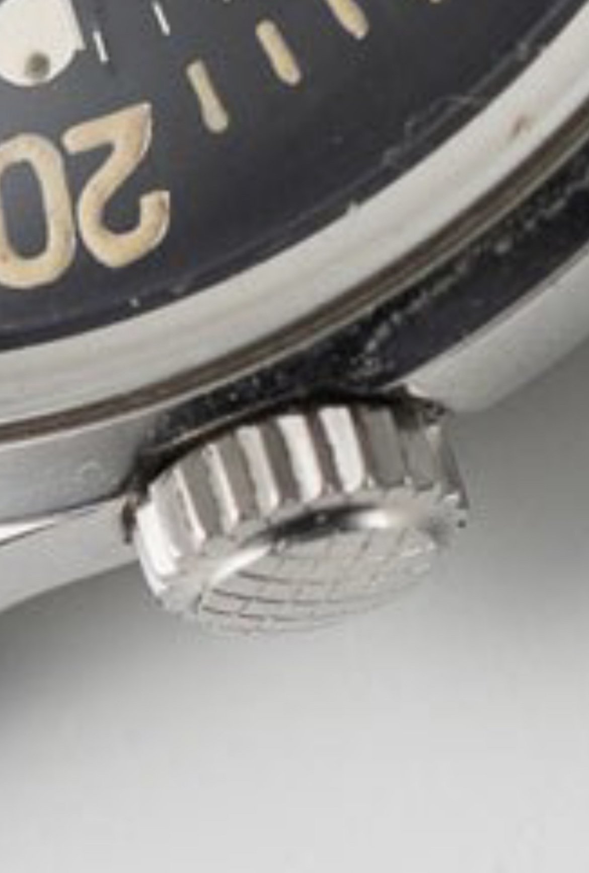If I'm not mistaken, the original crown on this watch would have been a cross-hatched compressor style crown, with somewhat unique measurements. Rather than the 5.3 to 5.5mm diameter these compressor crowns typically have, I believe the crown on my Polerouter was app 6.3mm in diameter and 4mm tall, with a 0.9mm thread size to fit the 215 winding stem.