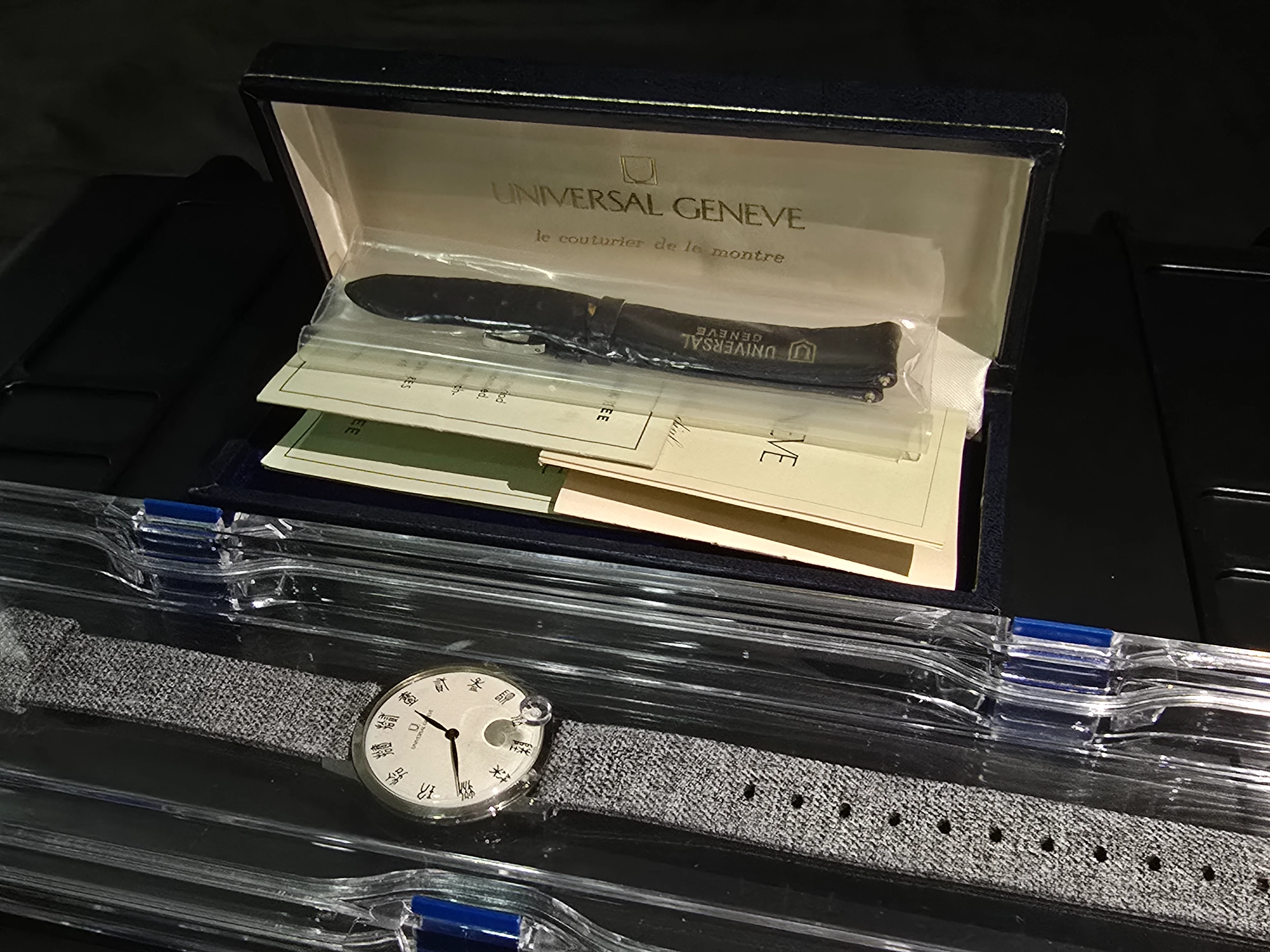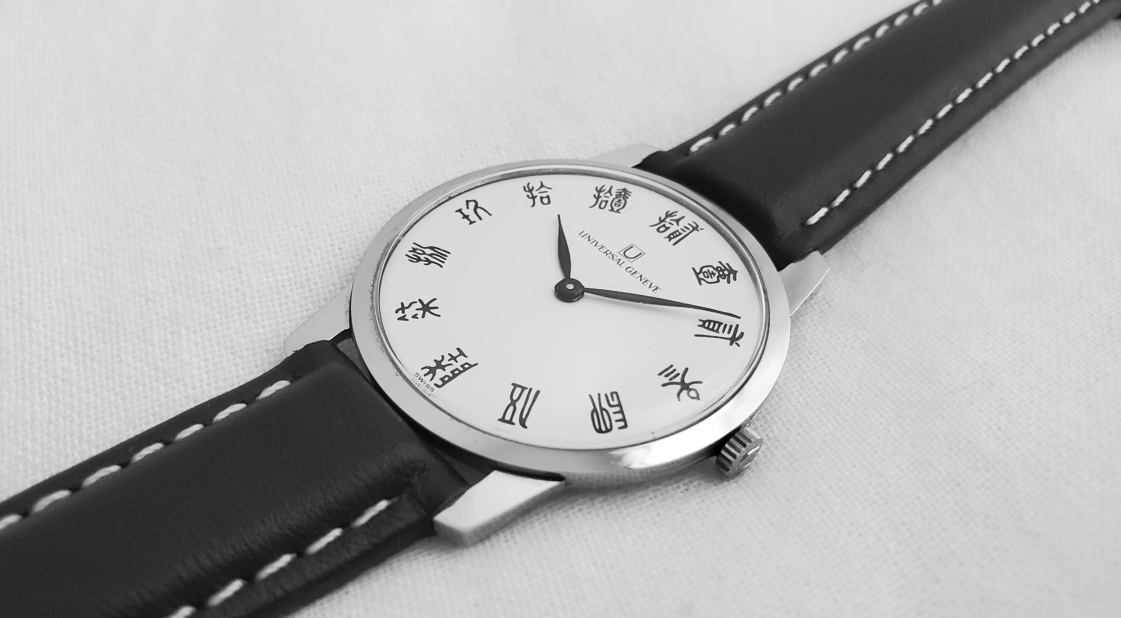 ·hi all, i bought one universal geneve from 1969 and with chinese dial, diameter about 33mm only, small but gorgerous. Similar model was been produced among 1960s (maybe even longer), most of dial is roman number or just lines, so far i only see 3 or 4 piece with chinese dial, one was sold by hoddinke, another one still on chrono24.