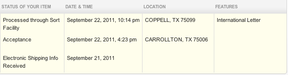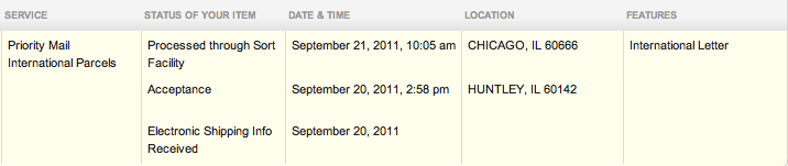 14 days later, the damned thing is still in the same post office its been in since the 21st, when the seller was kind enough to rush down to the post office before closing time to get it in early.