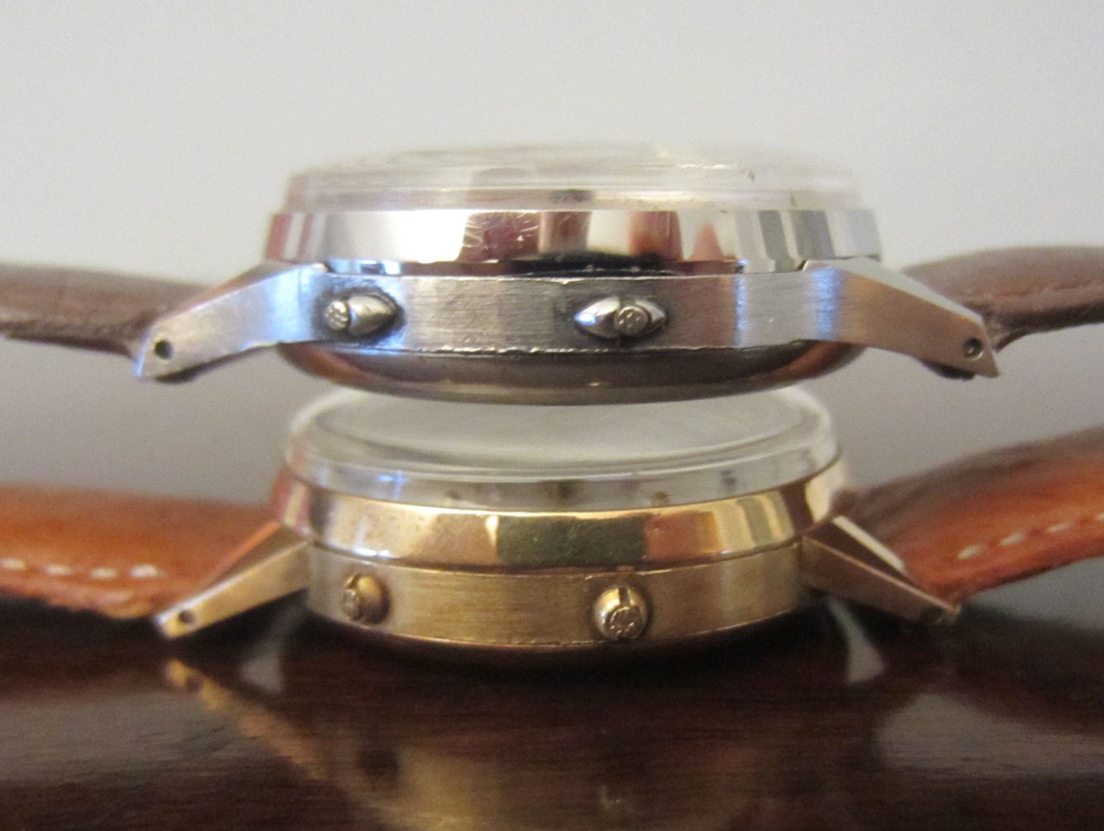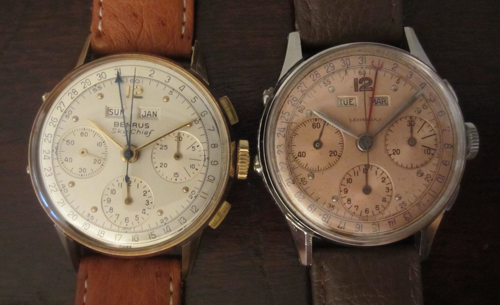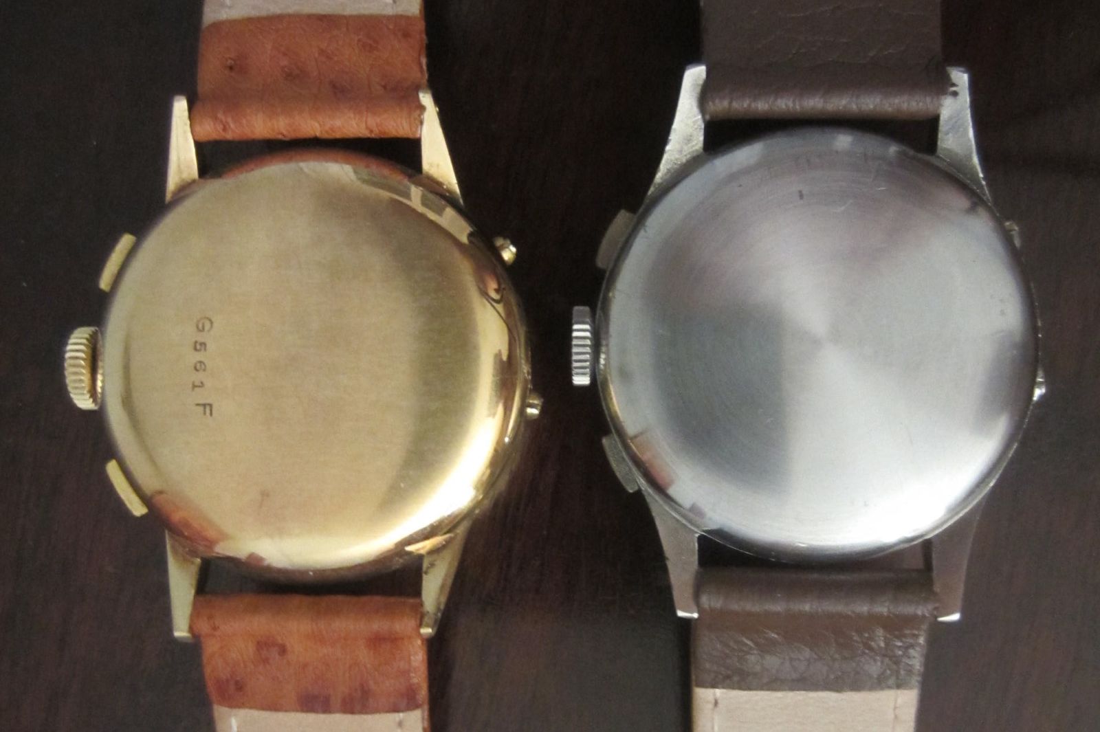 ··Adam @ ΩFI've had my 14K Sky Chief for a few years now...Just added a Leonidas in steel to the collection. Some comparison photos to share. The similarities leads one to surmise that these are not by chance. Perhaps the same case maker? Well, there are slight differences in the lugs and pushers, but still, one wonders.