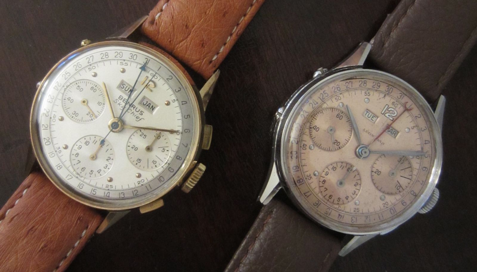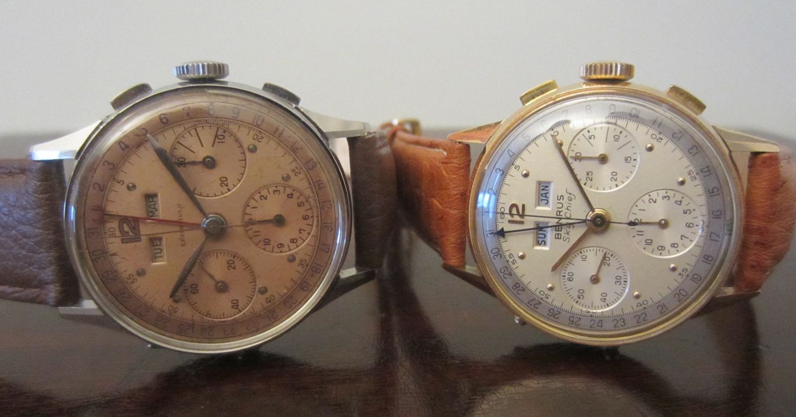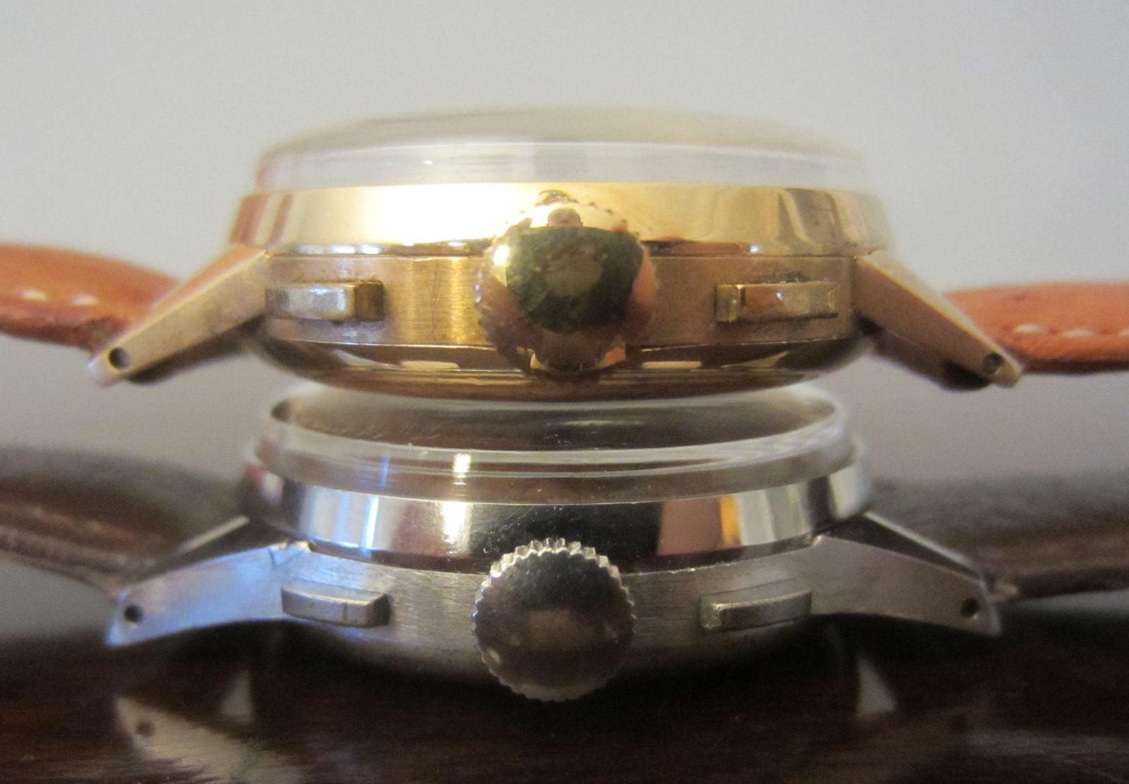 ··Adam @ ΩFI've had my 14K Sky Chief for a few years now...Just added a Leonidas in steel to the collection. Some comparison photos to share. The similarities leads one to surmise that these are not by chance. Perhaps the same case maker? Well, there are slight differences in the lugs and pushers, but still, one wonders.