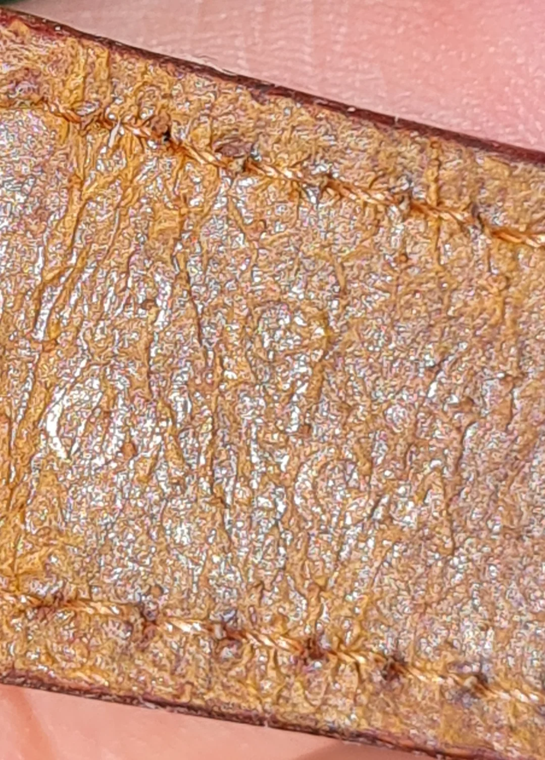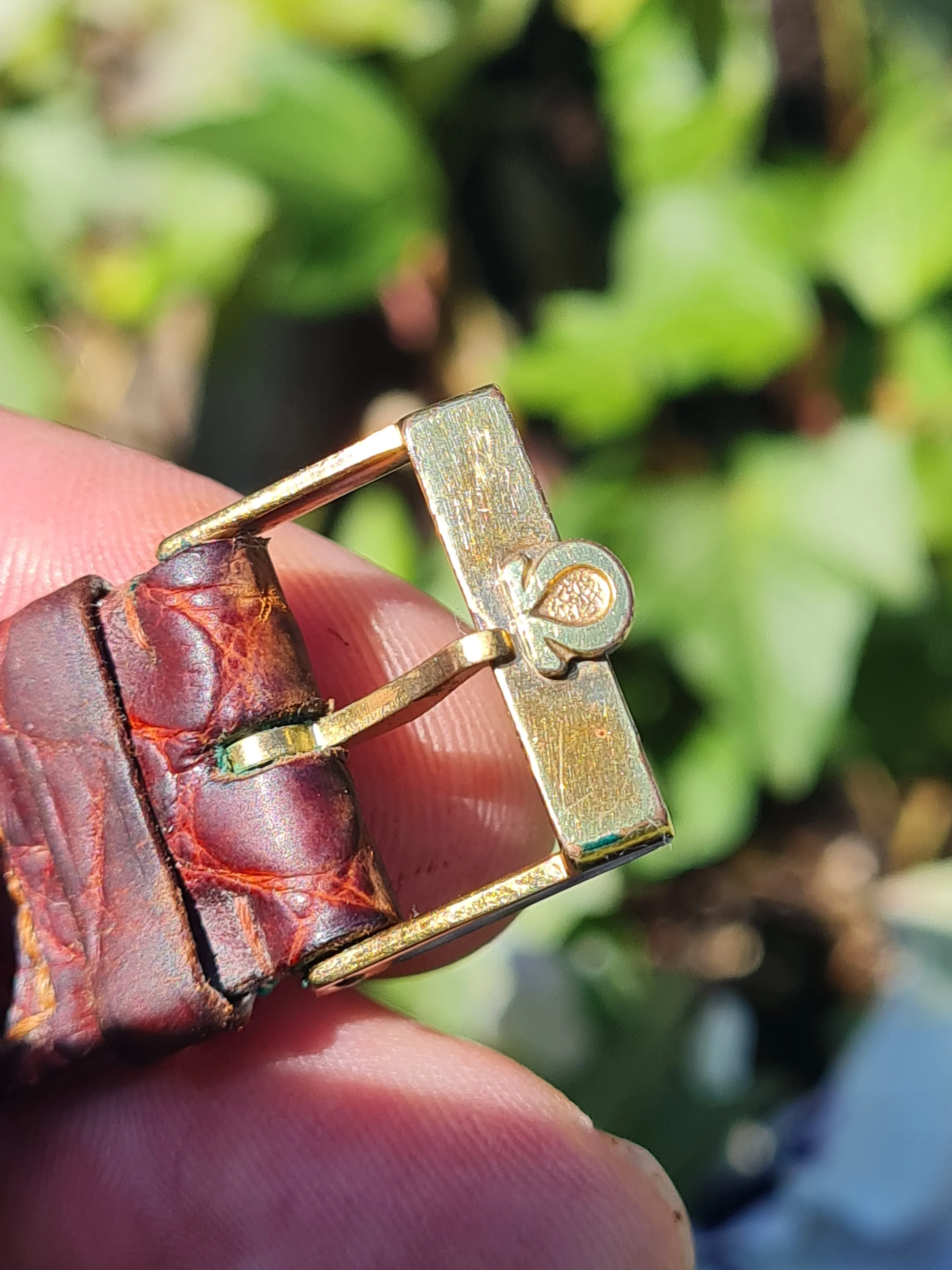 The buckle is mounted on an old Omega leather bracelet in kind of poor condition.
