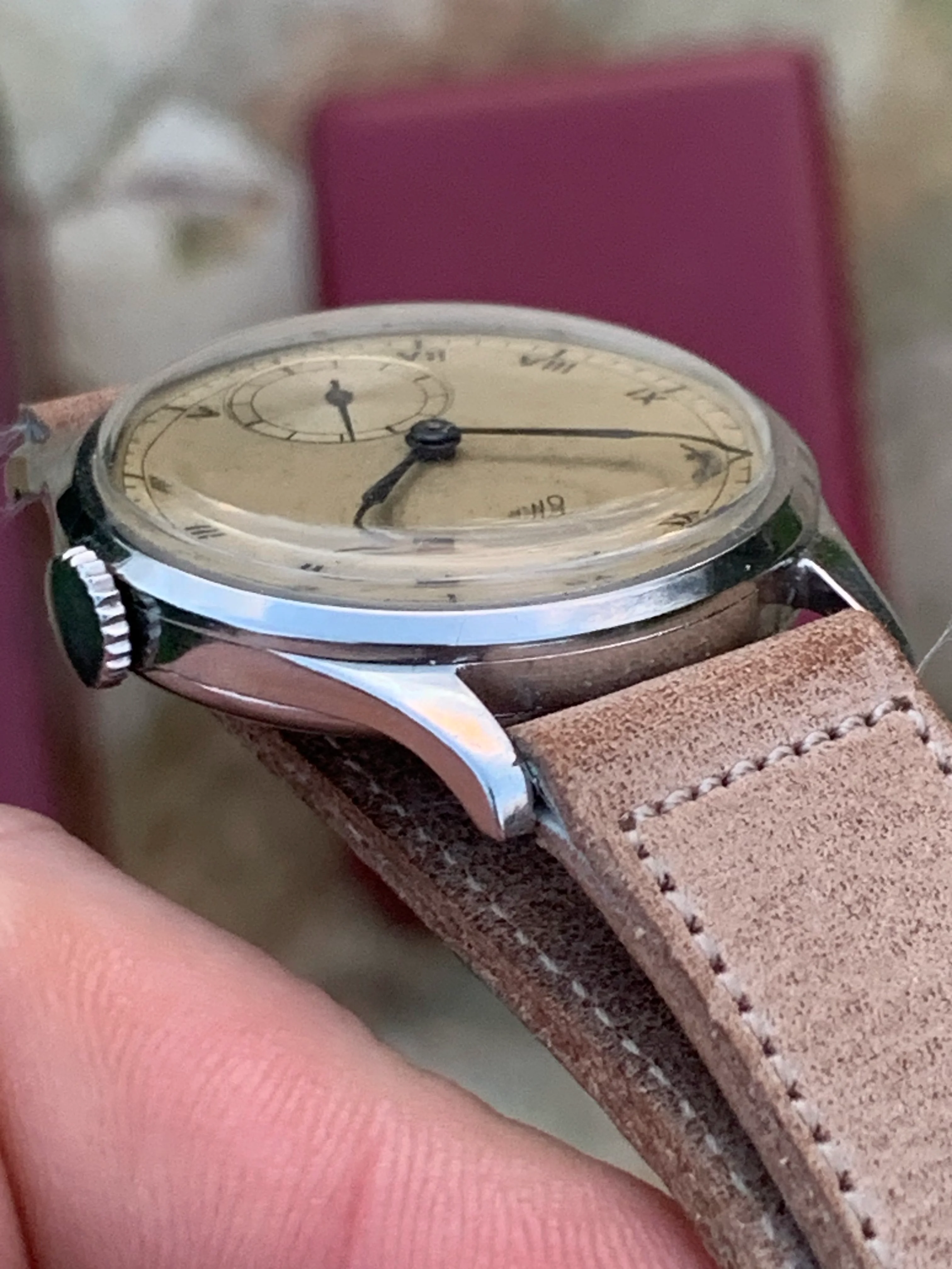 Dial: For an 80 year old watch the dial is in remarkable shape, there is a subtle and even patina that covers the entire dial. The black roman numerals create a great contrast against the creamy dial, and combined with the beautifully blued plume hands create a visually striking and very legible watch. The numerals form a radial pattern around the circumference of the dial, with a second track to their outer edge that reacts differently to the light and so creates a two tone dial effect.