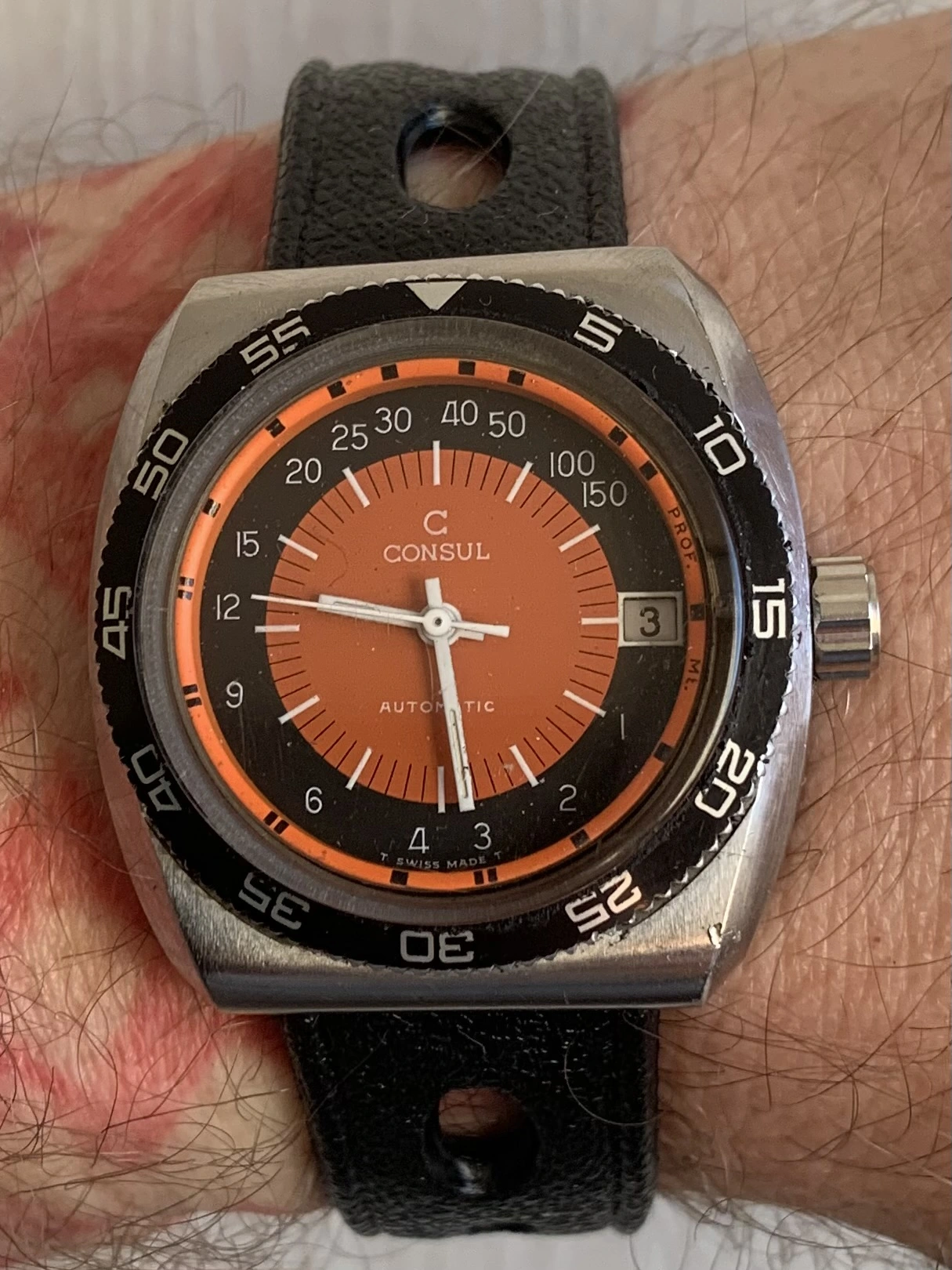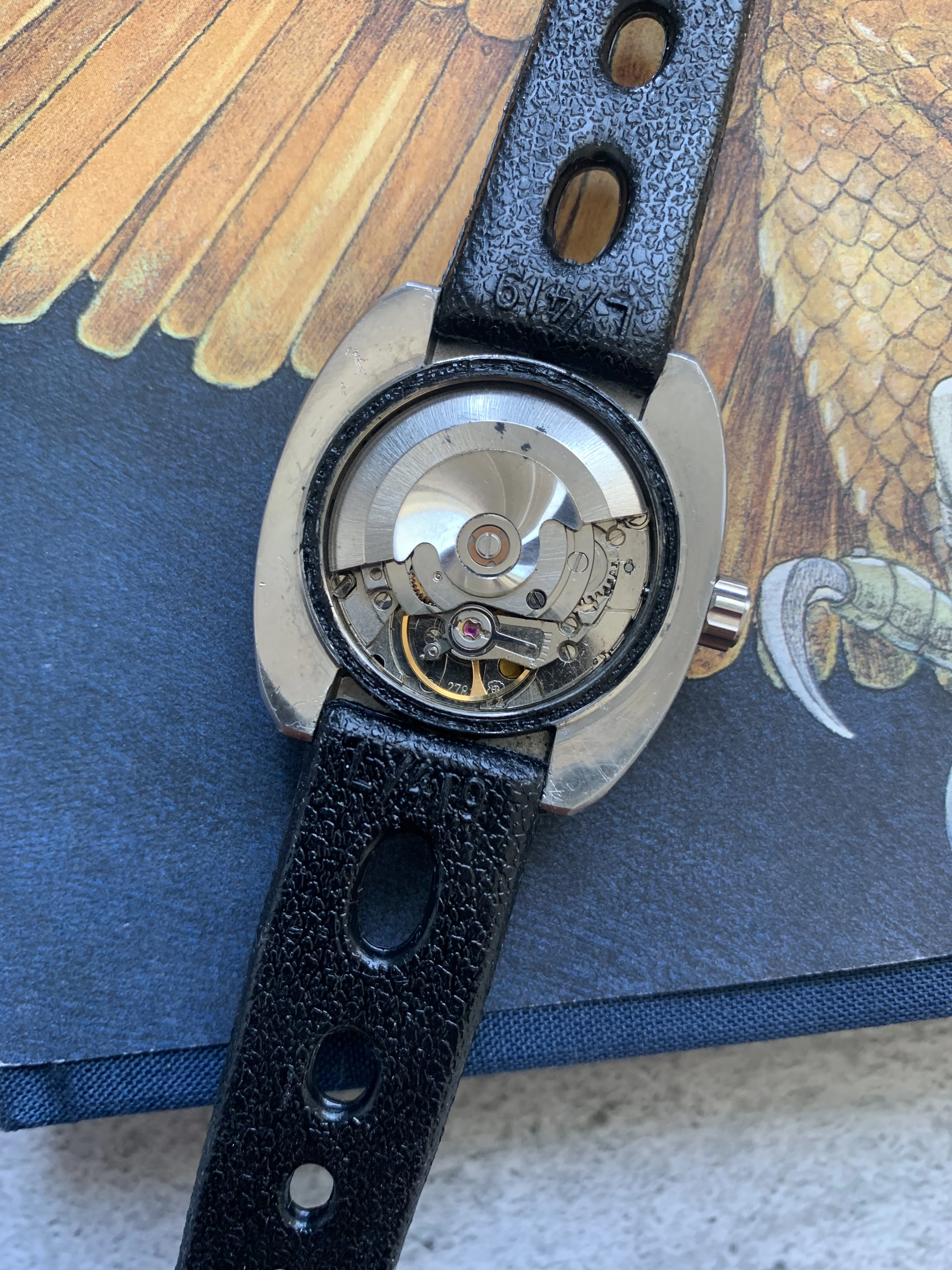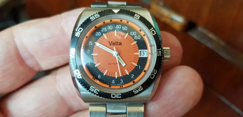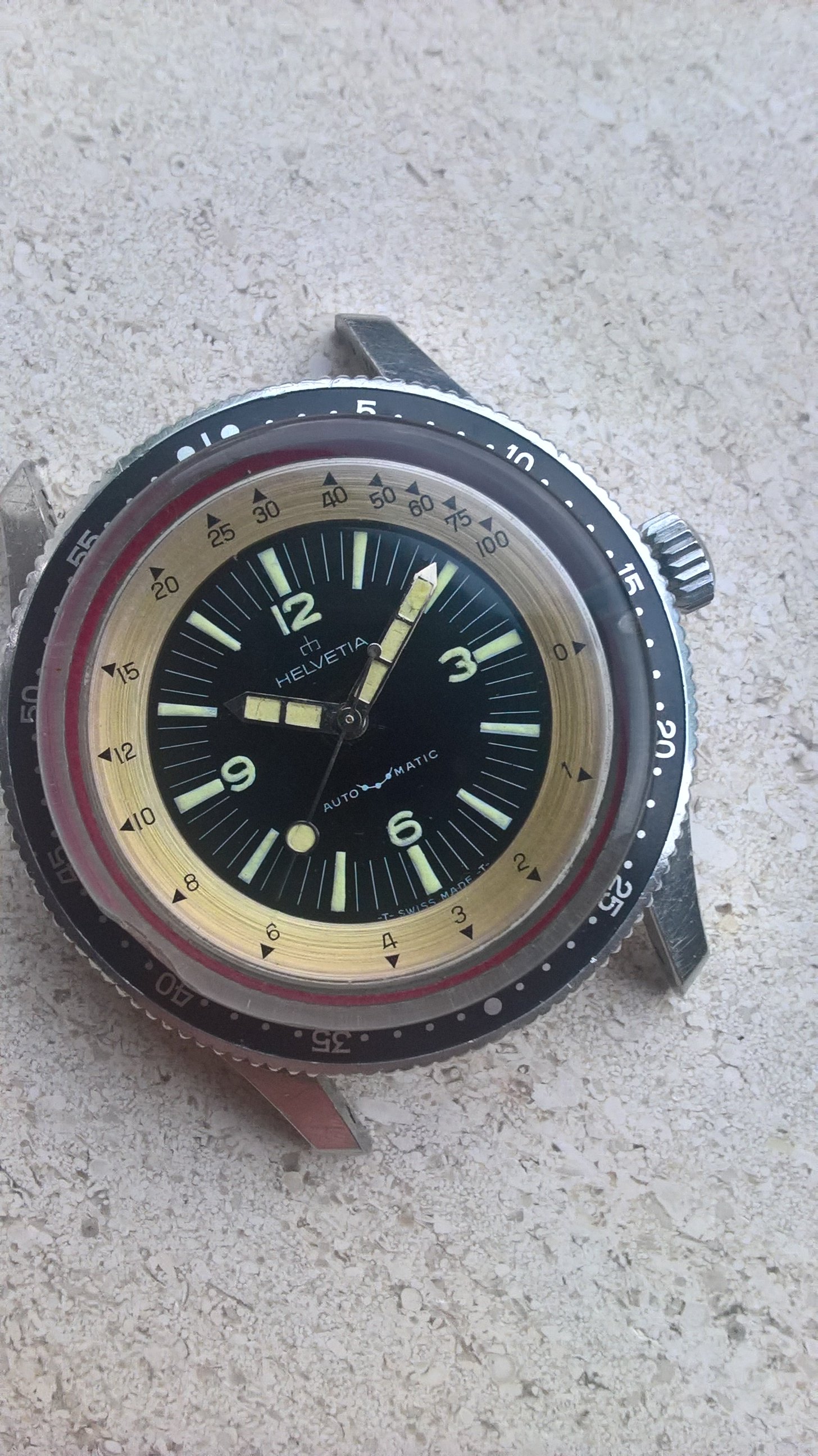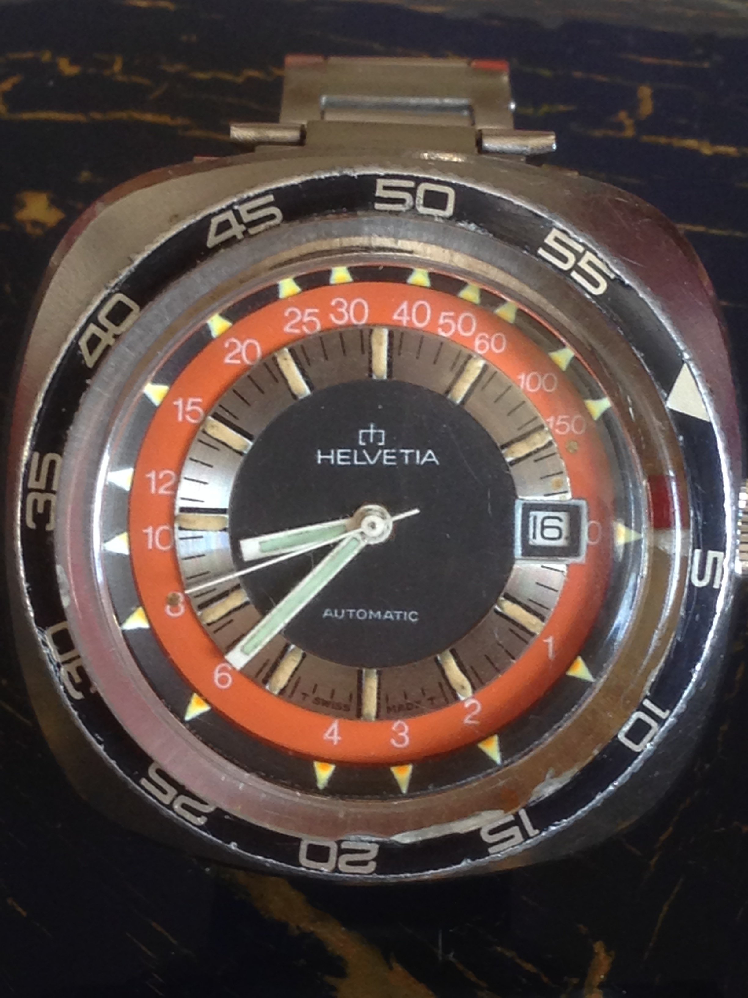 I have a hard time accepting that mine should be a franken, as it doesn't really make any sense. The other Helvetia depth gauge watches I've seen have all been later, more funky 70's designs with date windows, making a transplant unlikely. Here's one: