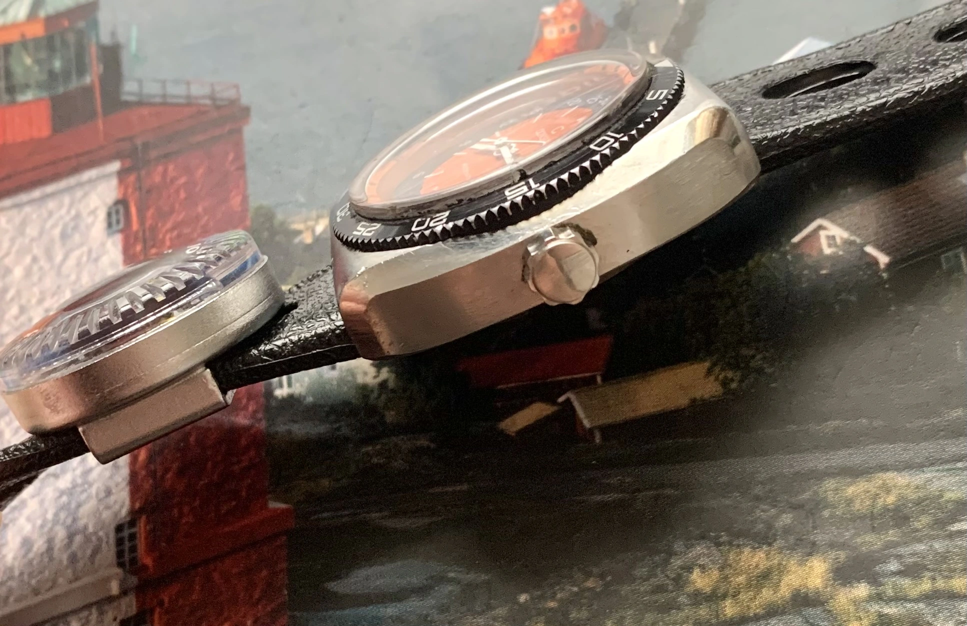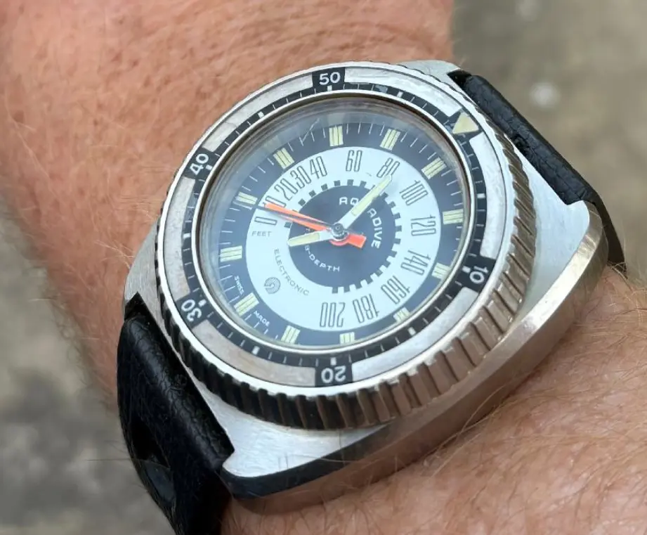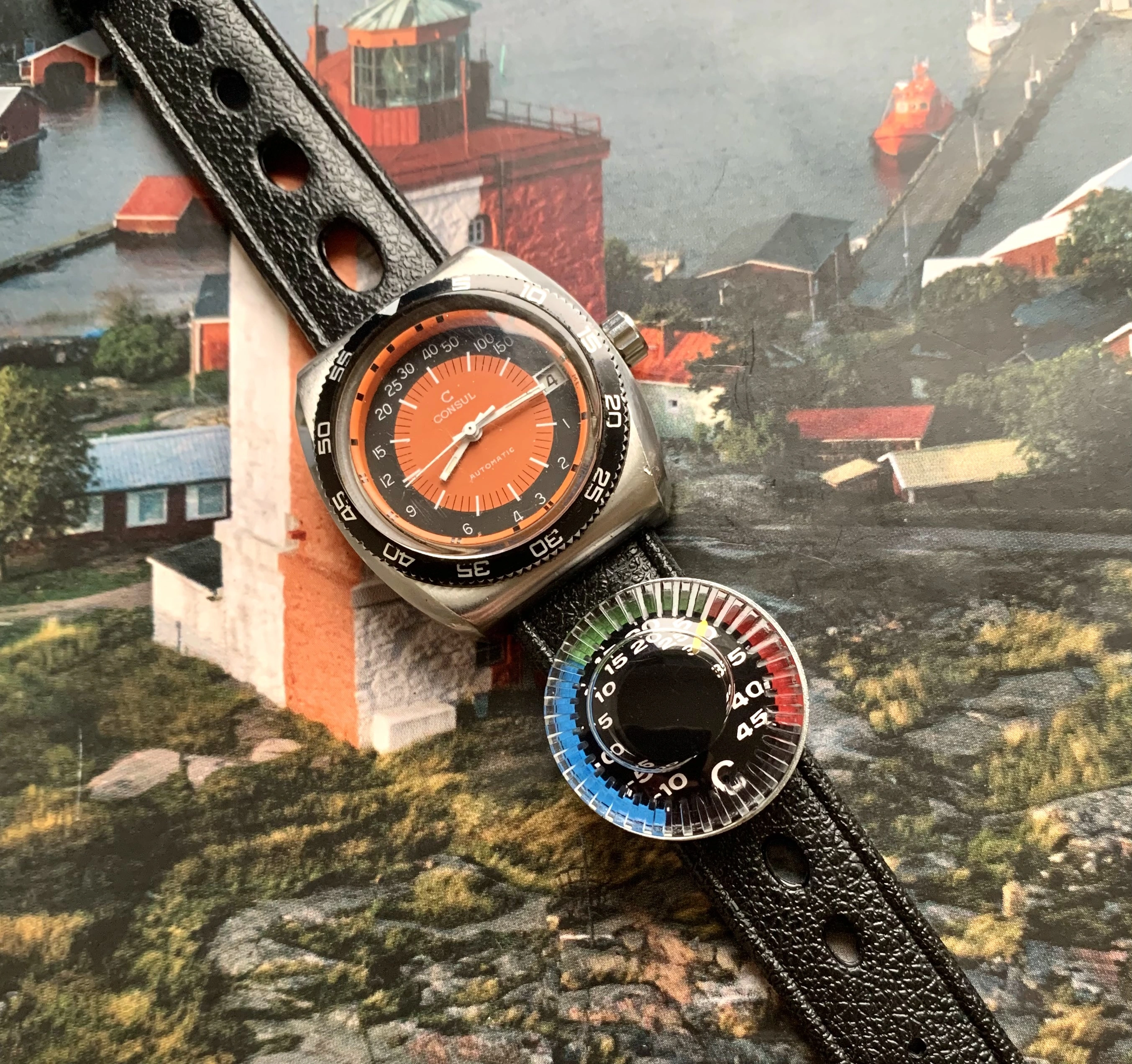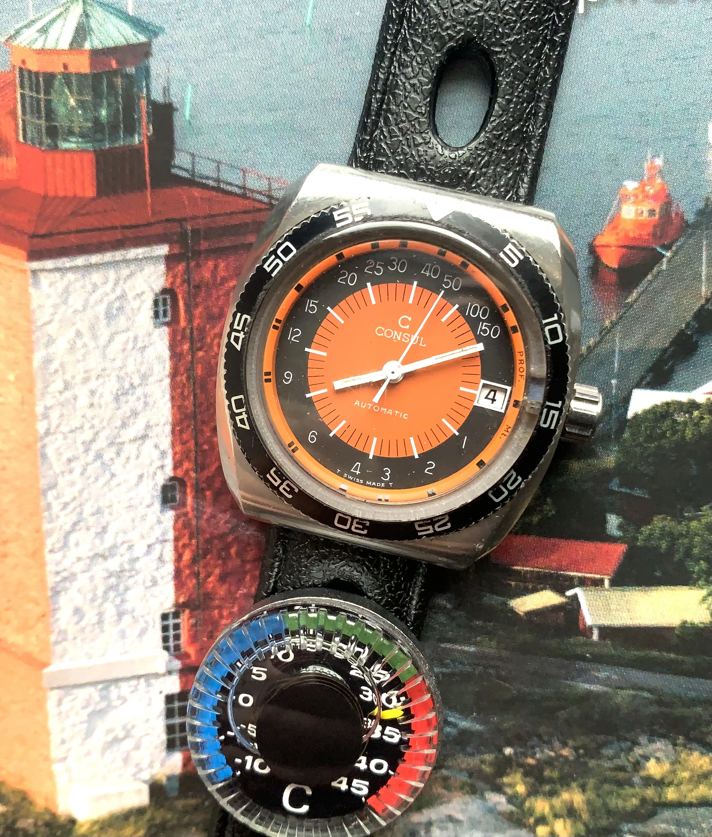 I have a hard time accepting that mine should be a franken, as it doesn't really make any sense. The other Helvetia depth gauge watches I've seen have all been later, more funky 70's designs with date windows, making a transplant unlikely. Here's one: