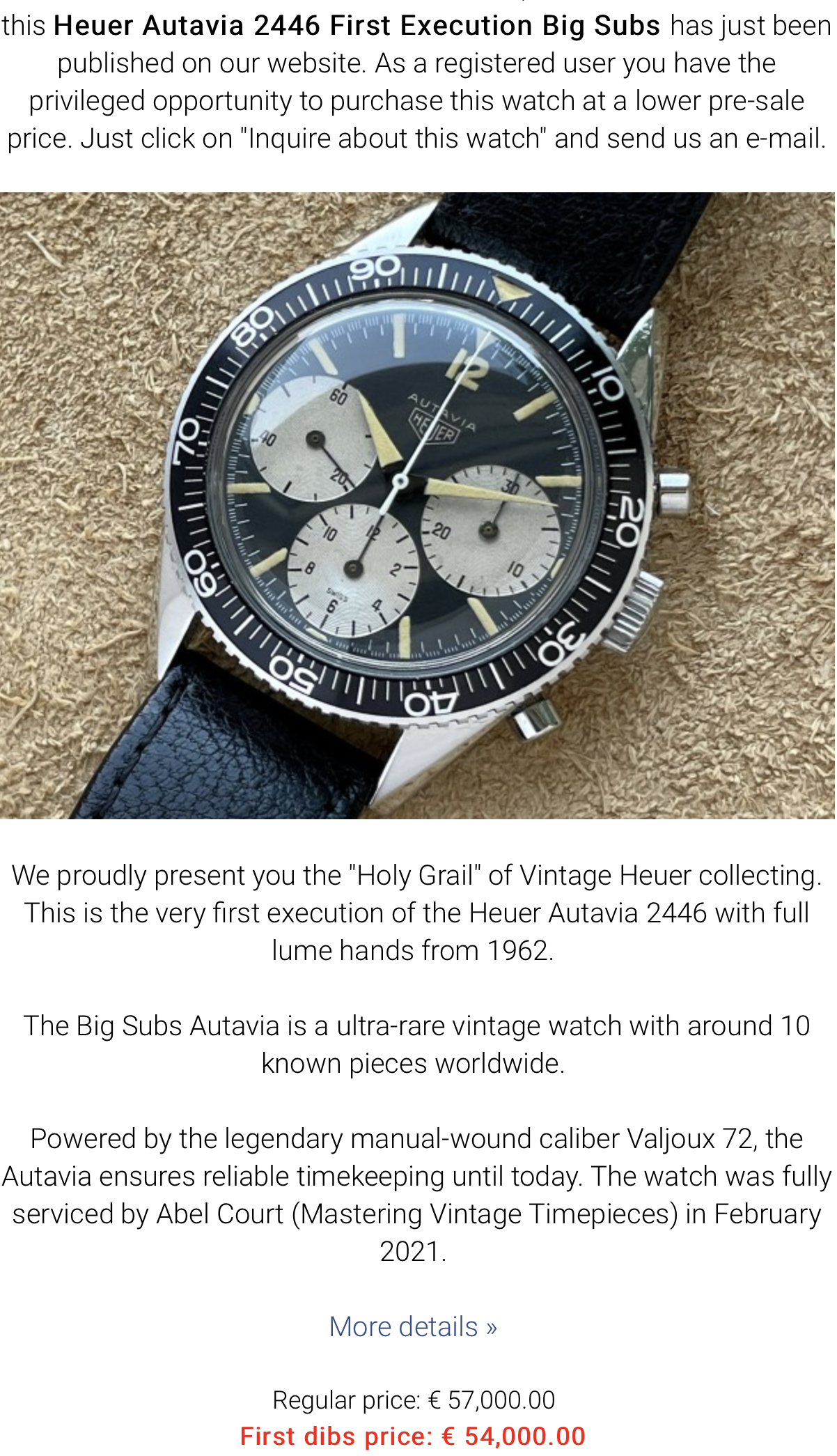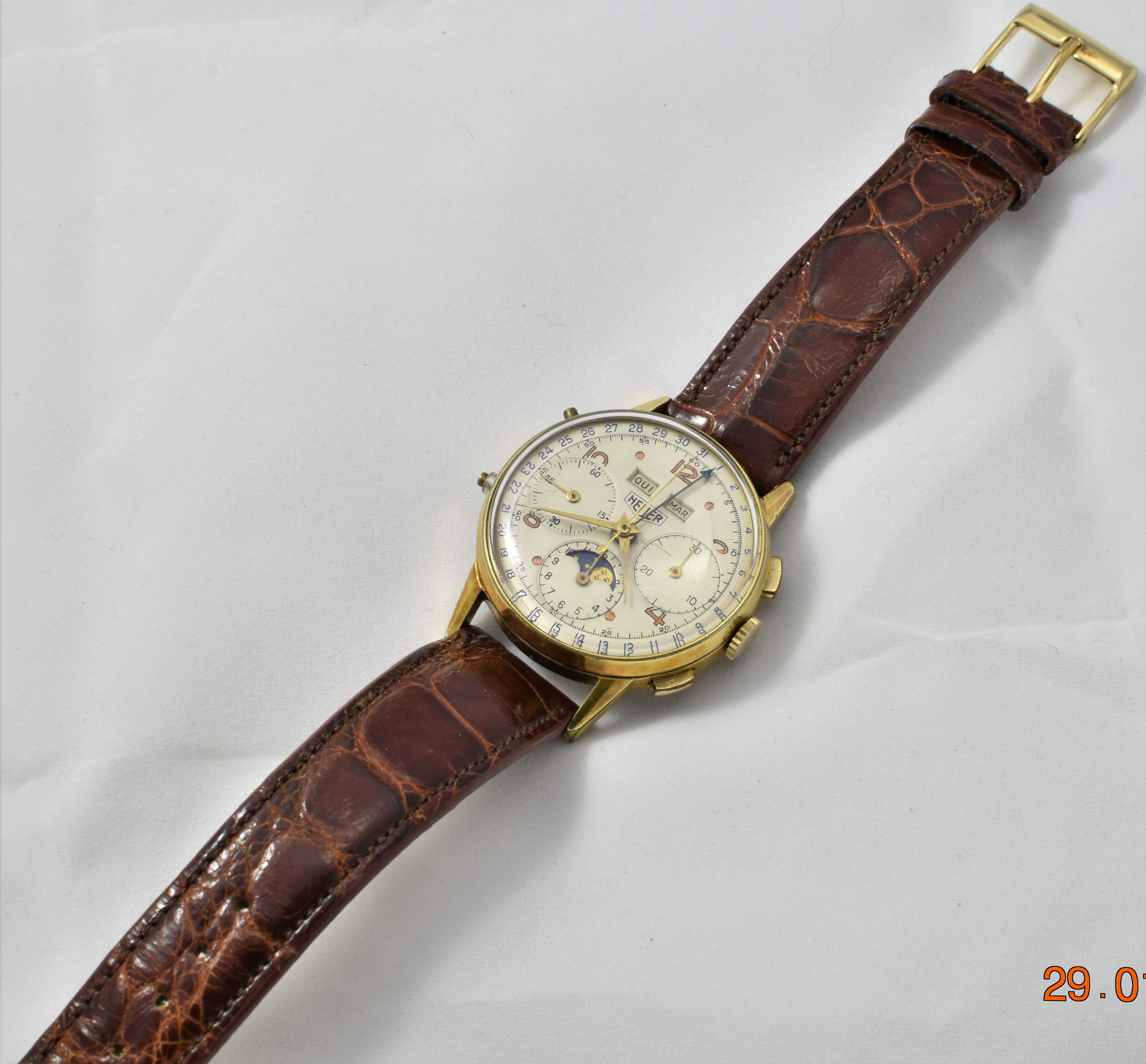 I am willing to sell an all original Heuer Val 88 triple calendar moonphase in cash. Has all the correct features: three big subdials, open & 9, correctly signed and number. No shipping. To be picked up from Netherlands.