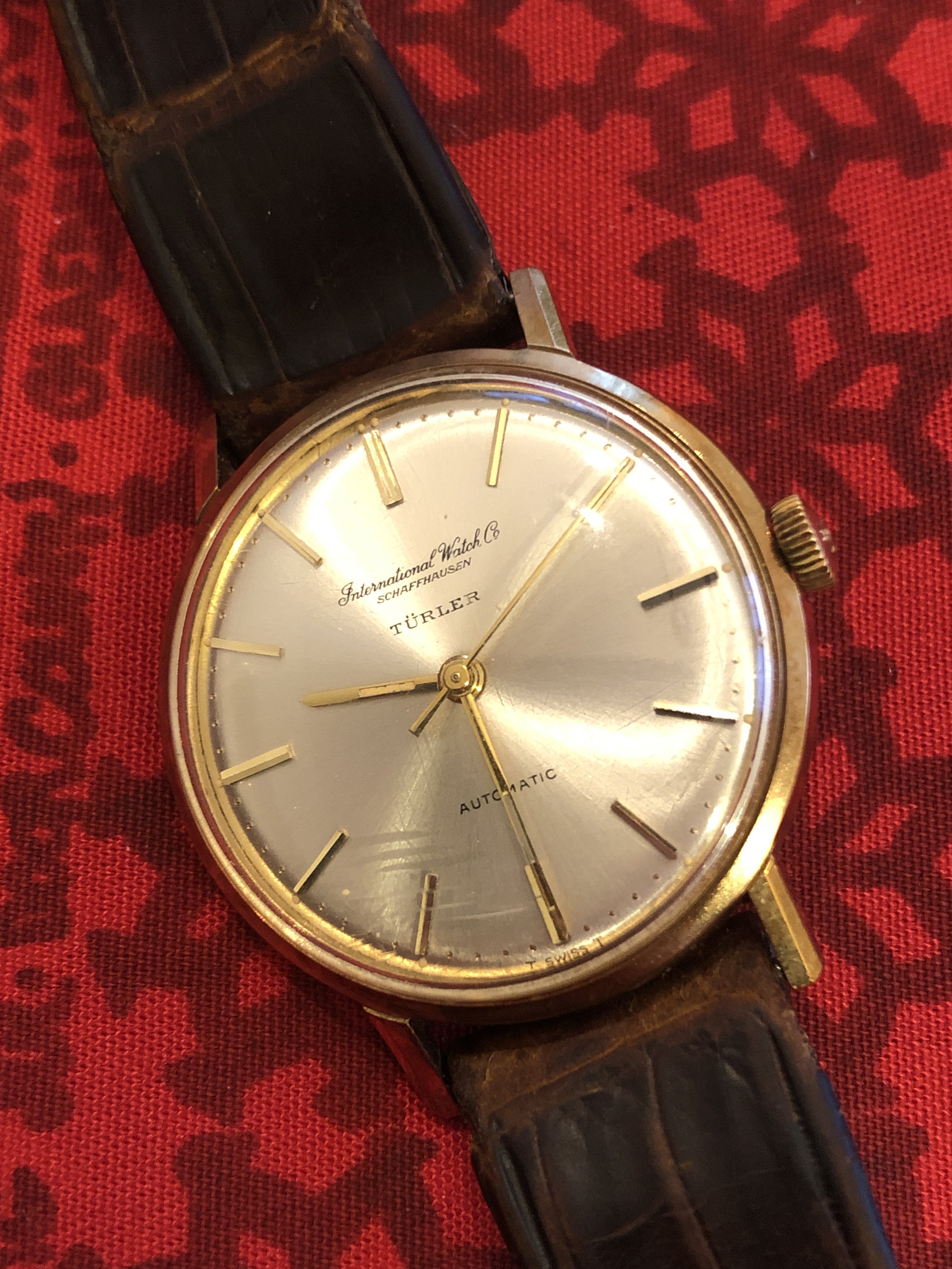 This IWC was, we believe, bought as a gift by his father when he was on a trip to Switzerland, and double signed by T眉rler. I can't get the back off at the moment and it obviously isn't gold, so I'm not sure if it's original to the watch, but being that my grandpa was a lifelong watch guy I can't imagine he just tossed the original back.