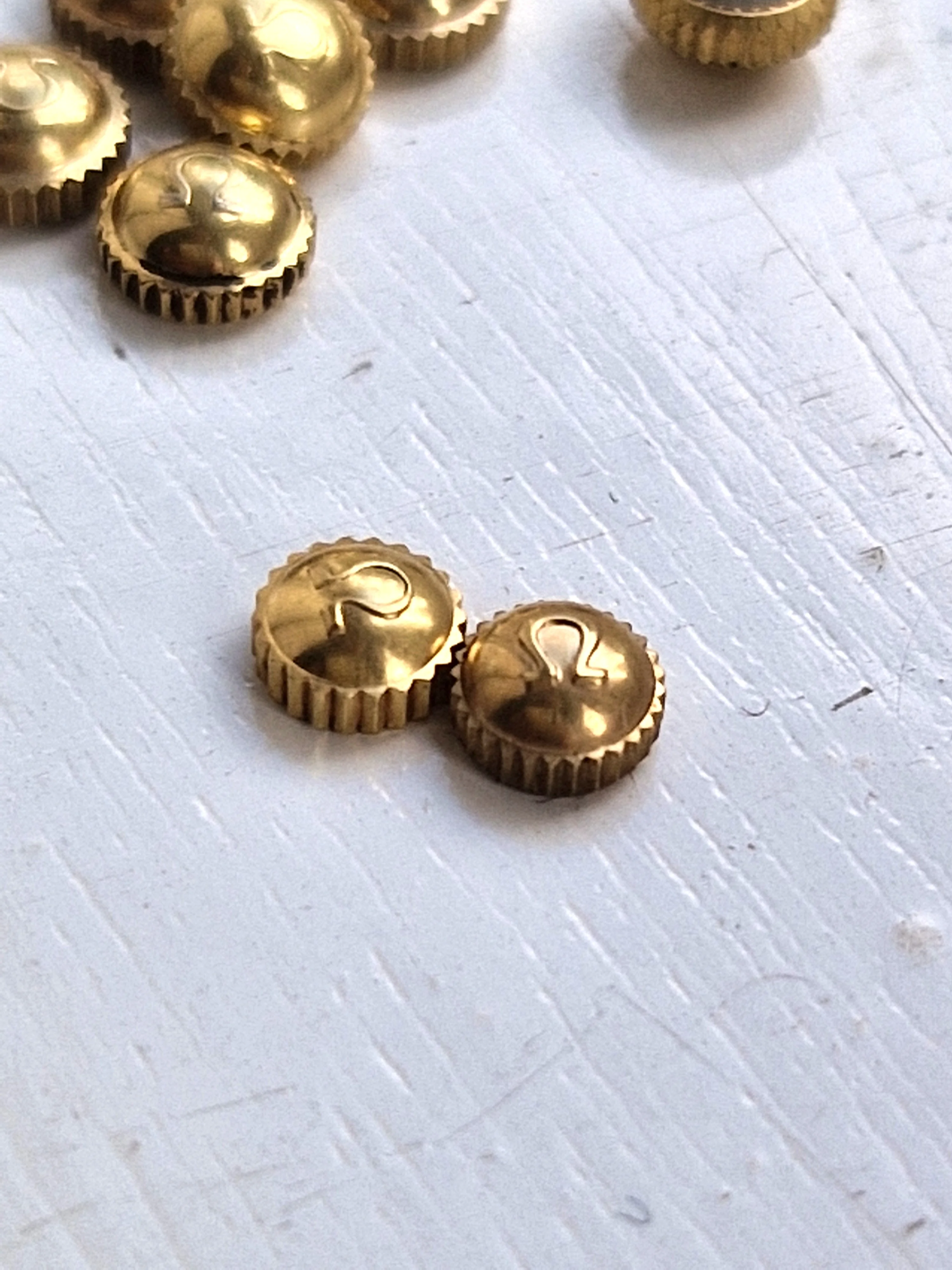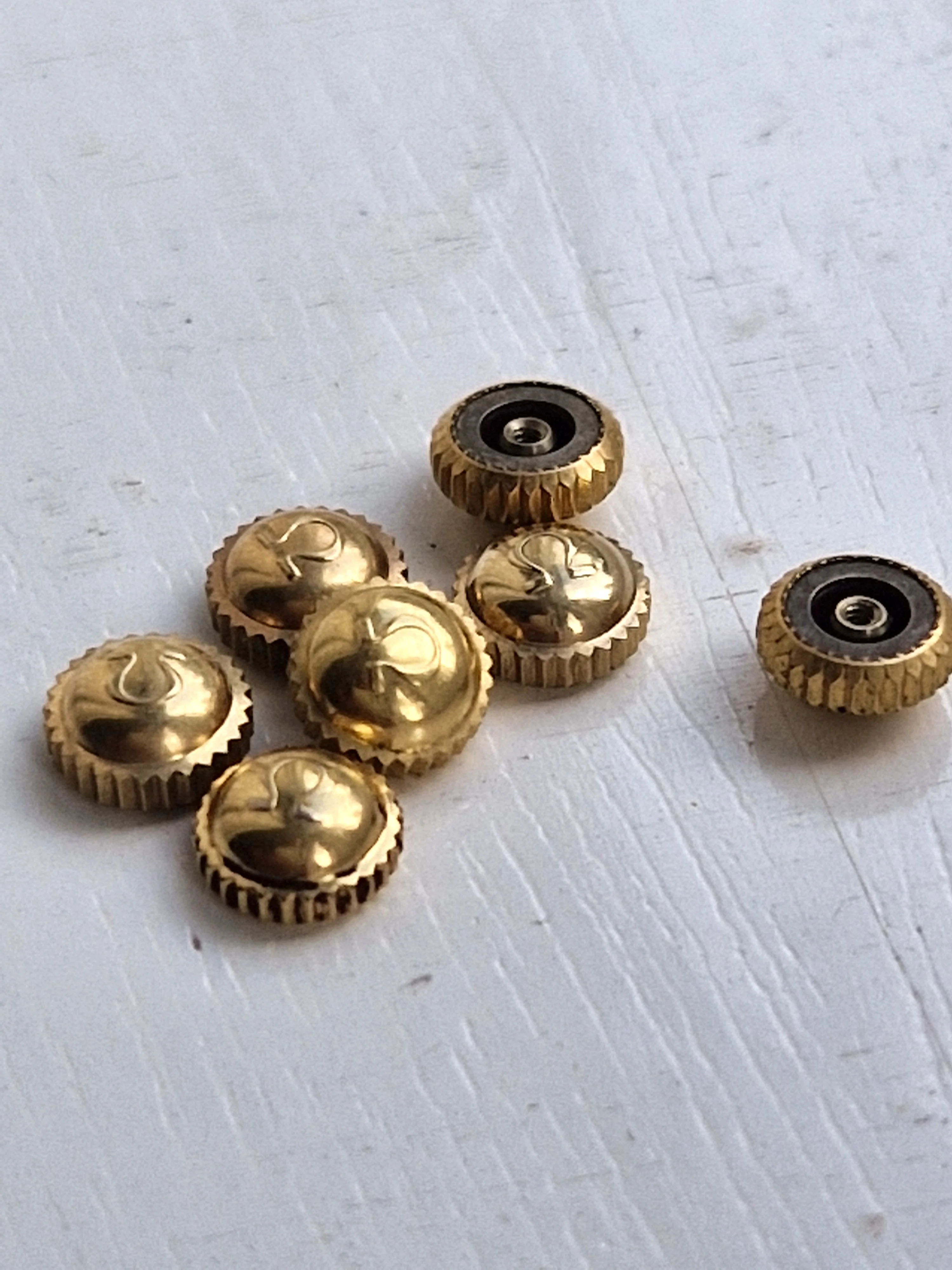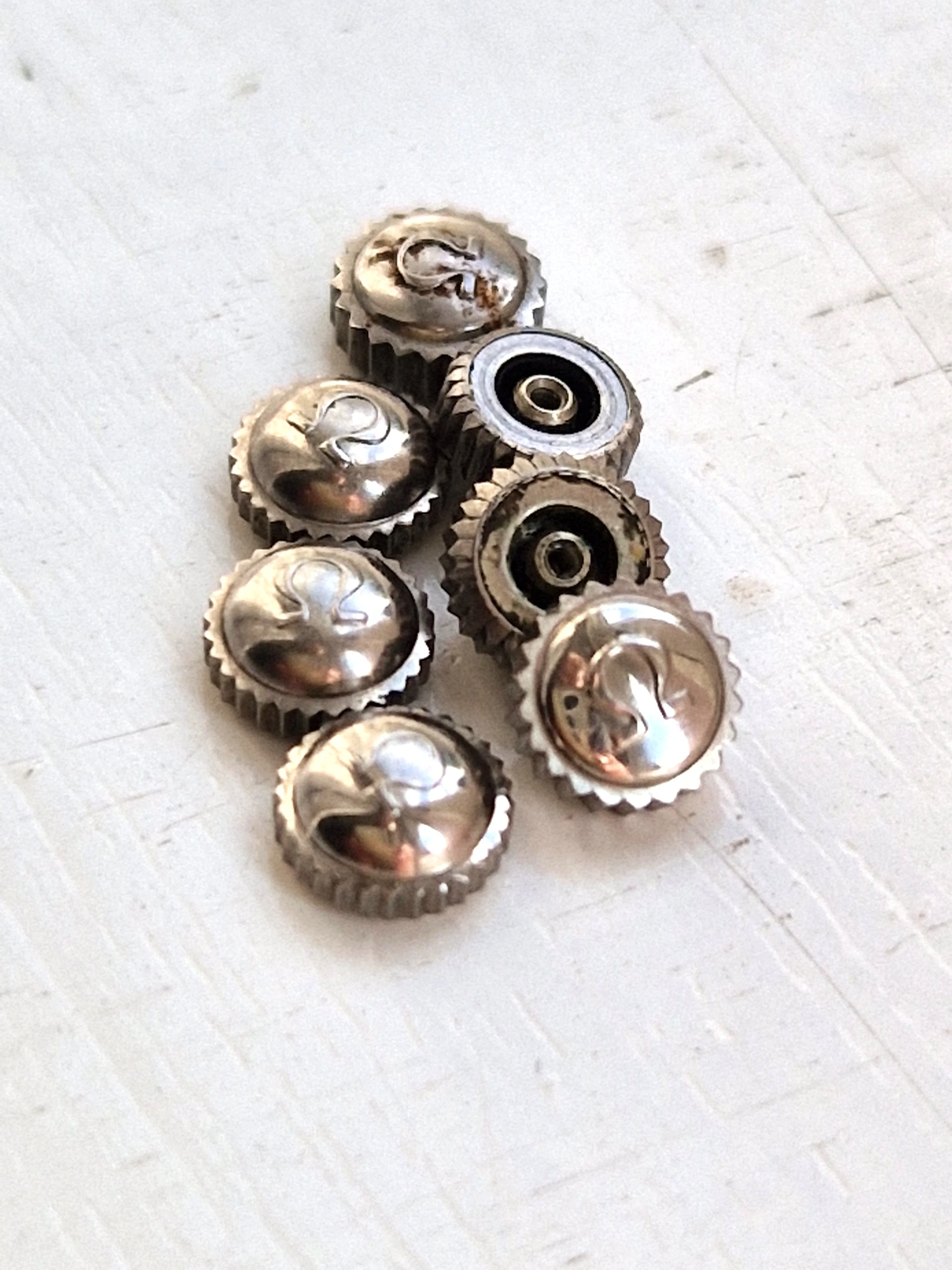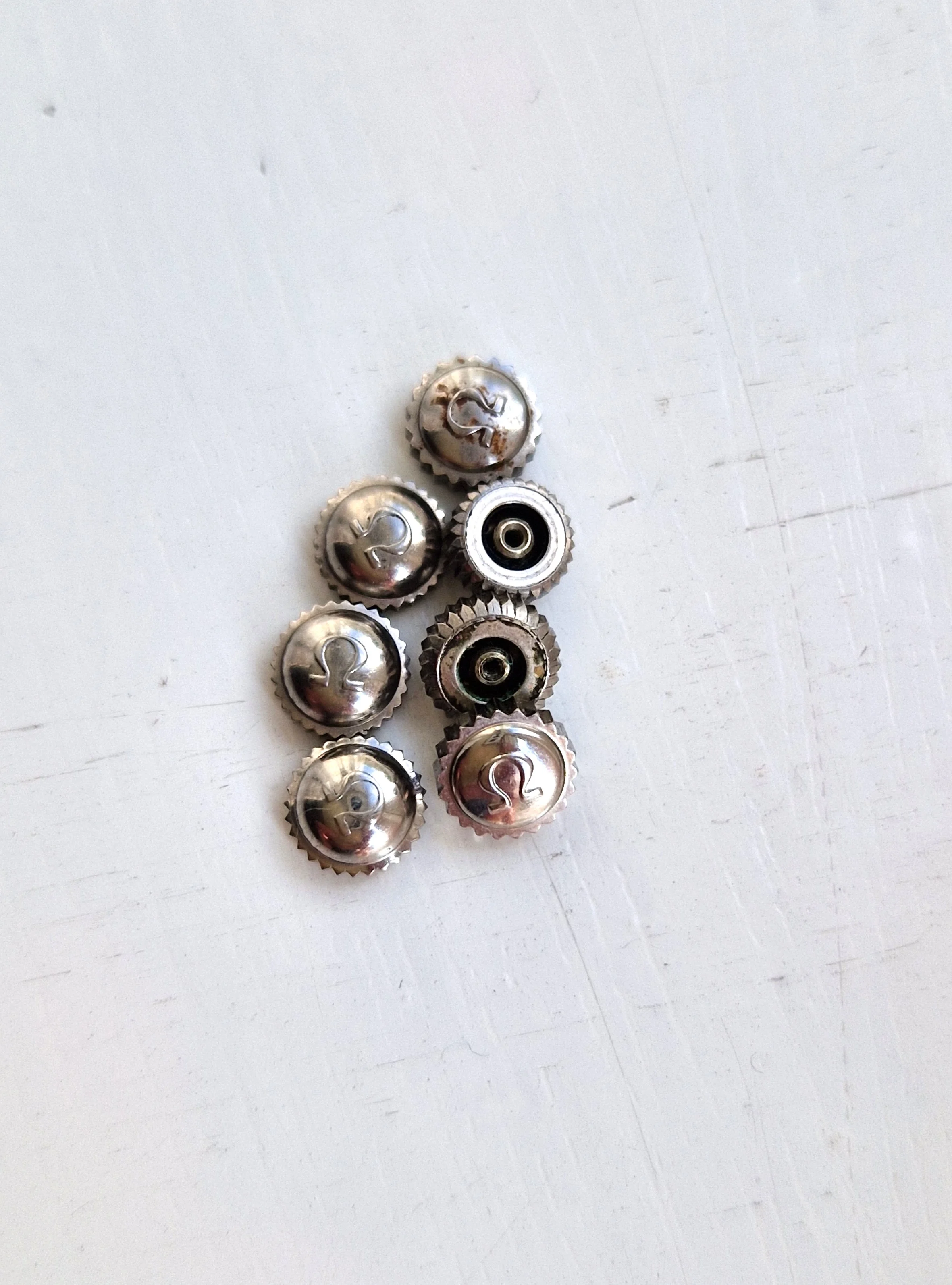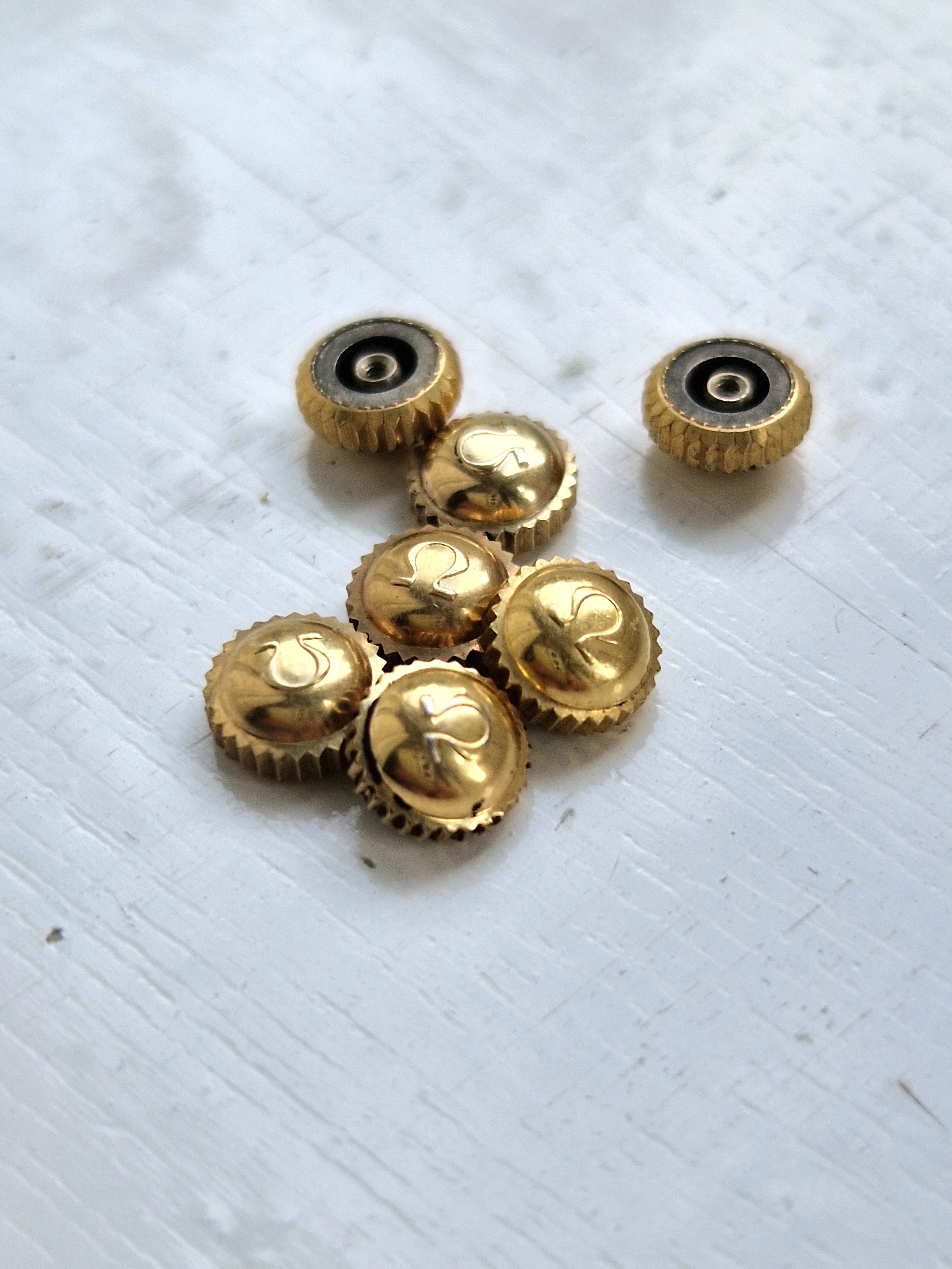 ·I've come into a stash of crowns, amongst them some vintage Omega bowler crowns. These are 1950's vintage and in great shape with the old flat foot logo and were used for various models including Seamaster and Ranchero. Some are in steel and some in gold cap.