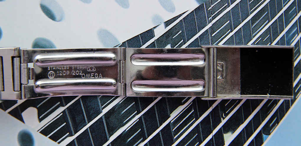 BRACELET: Original ref. 1209/201 heavy solid link tapered bracelet is very tight, seems to have all links and is in Excellent condition with signs of normal but not extreme wear like light scratches to the original brushed finish and some marks to the clasp, which is also nice and tight. I have it sized to my 7.25-7.5" wrist with 2 more downward adjustments left and at its longest I would imagine it can accommodate up to an 8" wrist.