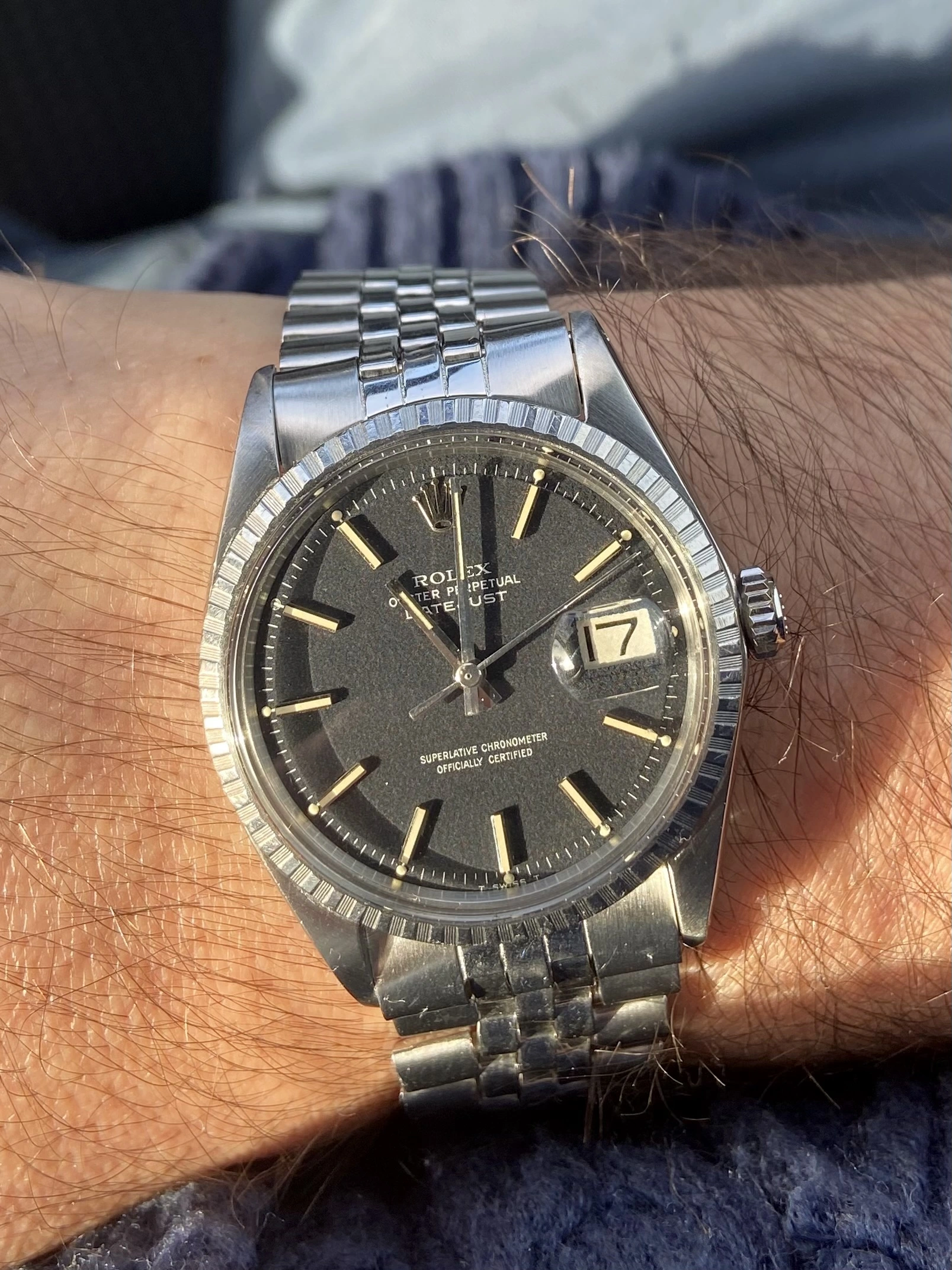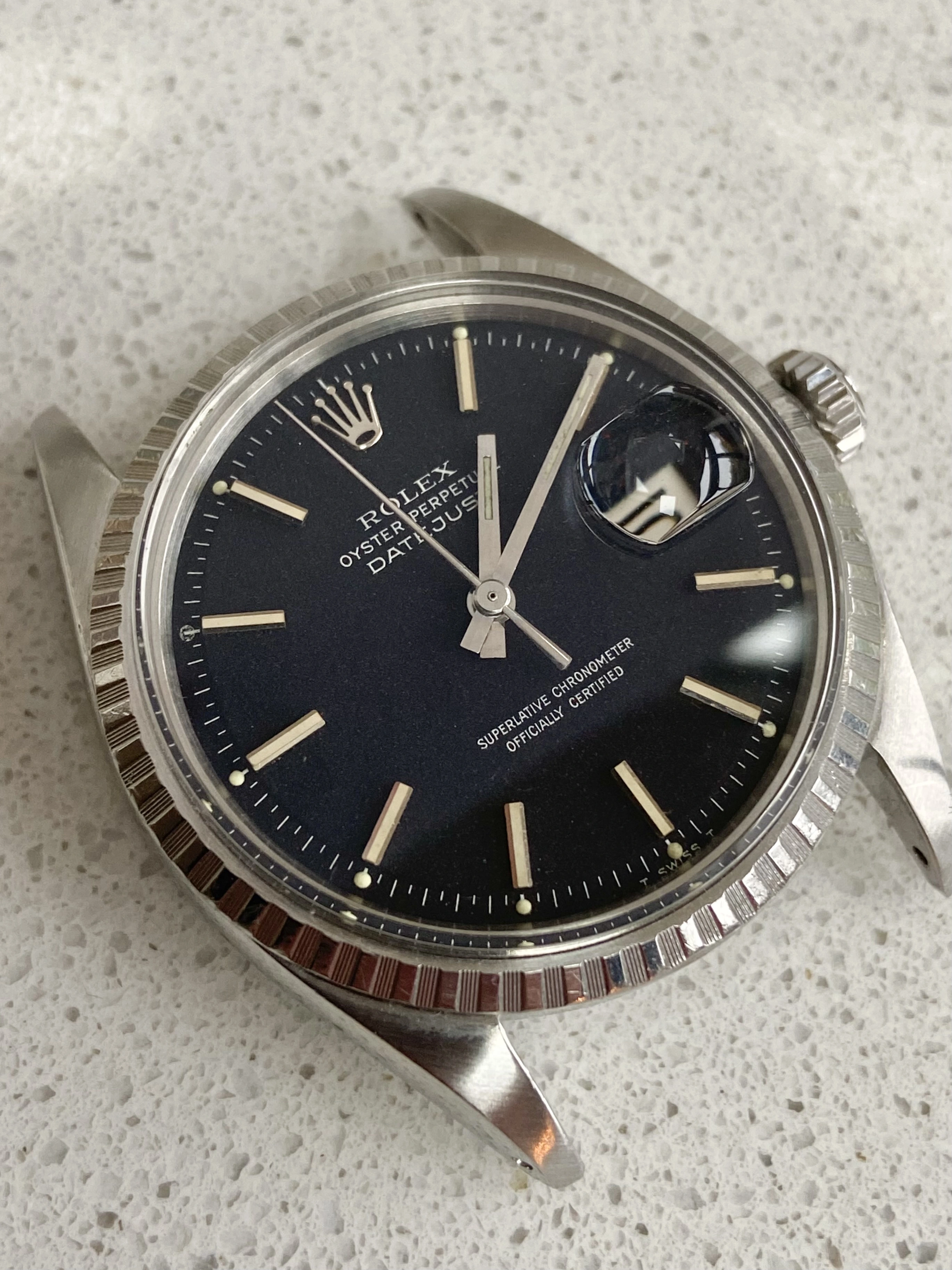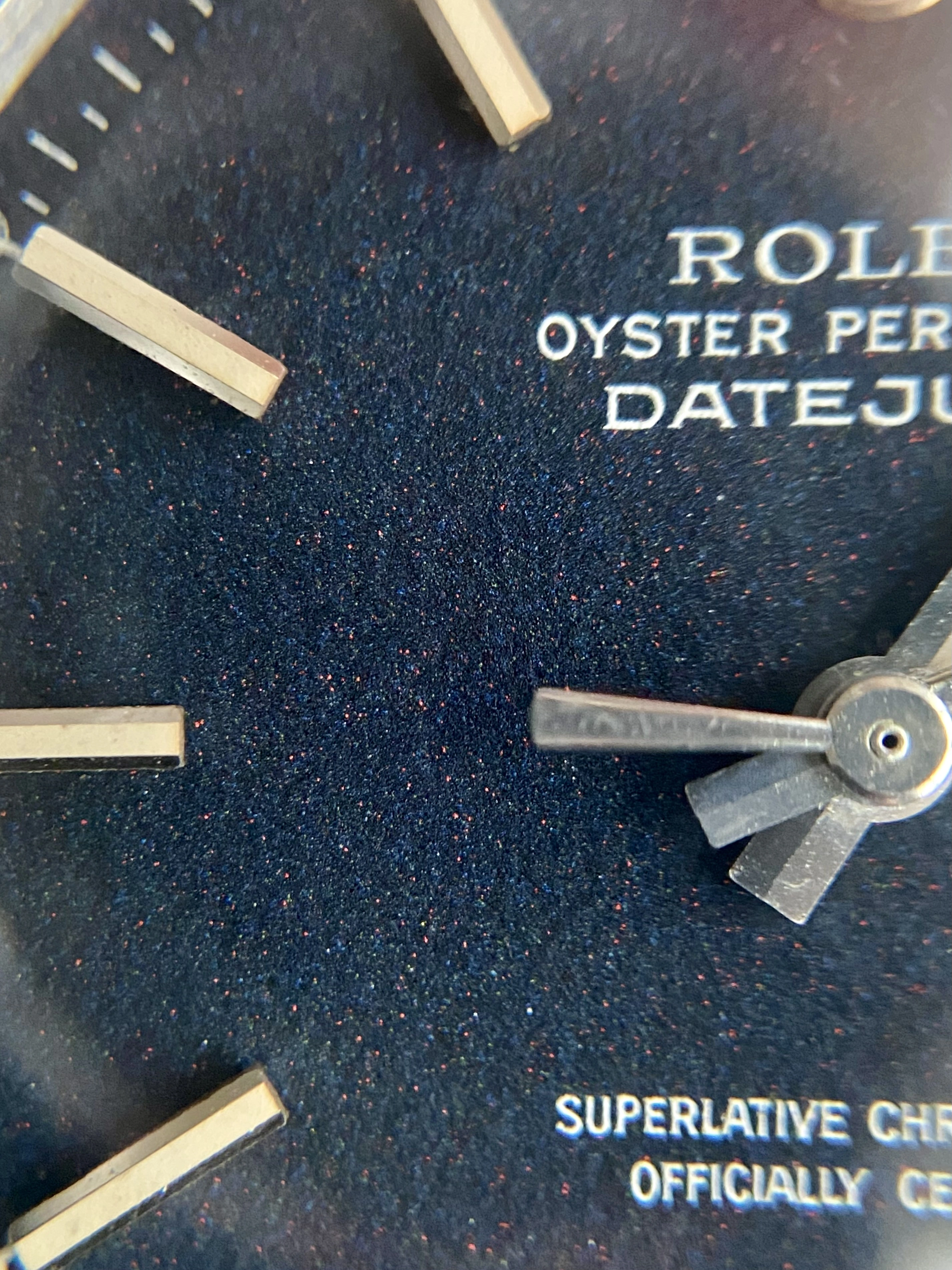 ·Offering for sale a vintage 1970’s Rolex DateJust 1603 with matte black ‘confetti’ dial. These matte black DateJust dials are something else, much more interesting and attractive than the standard black dials. The dial on this one is beautiful with clear flecks of red and blue and gives it a different look to other DateJusts. This has just returned from a full service with a Rolex certified watchmaker, sympathetic to vintage and is under warranty to Nov 2027.