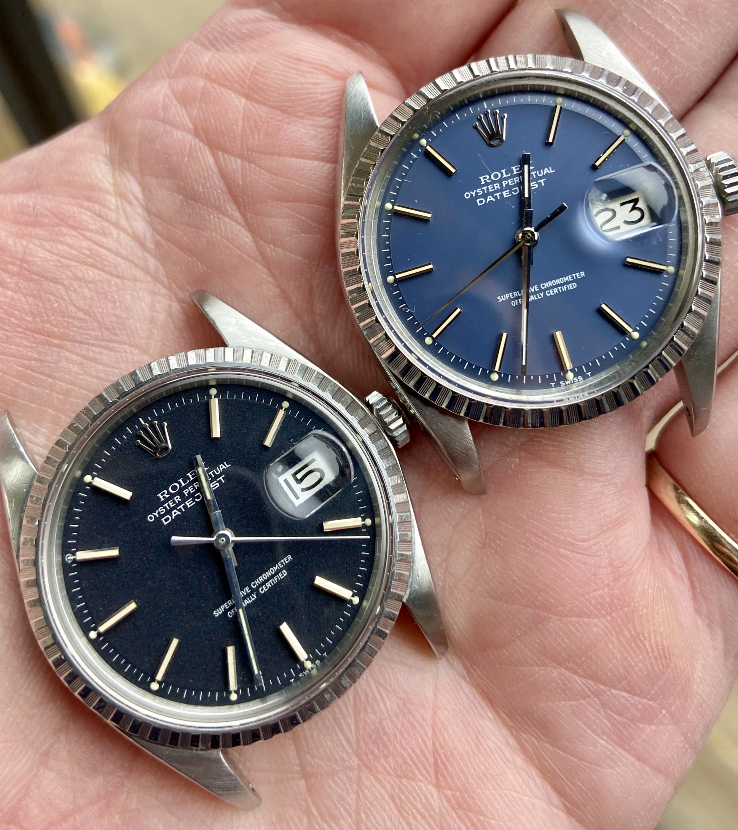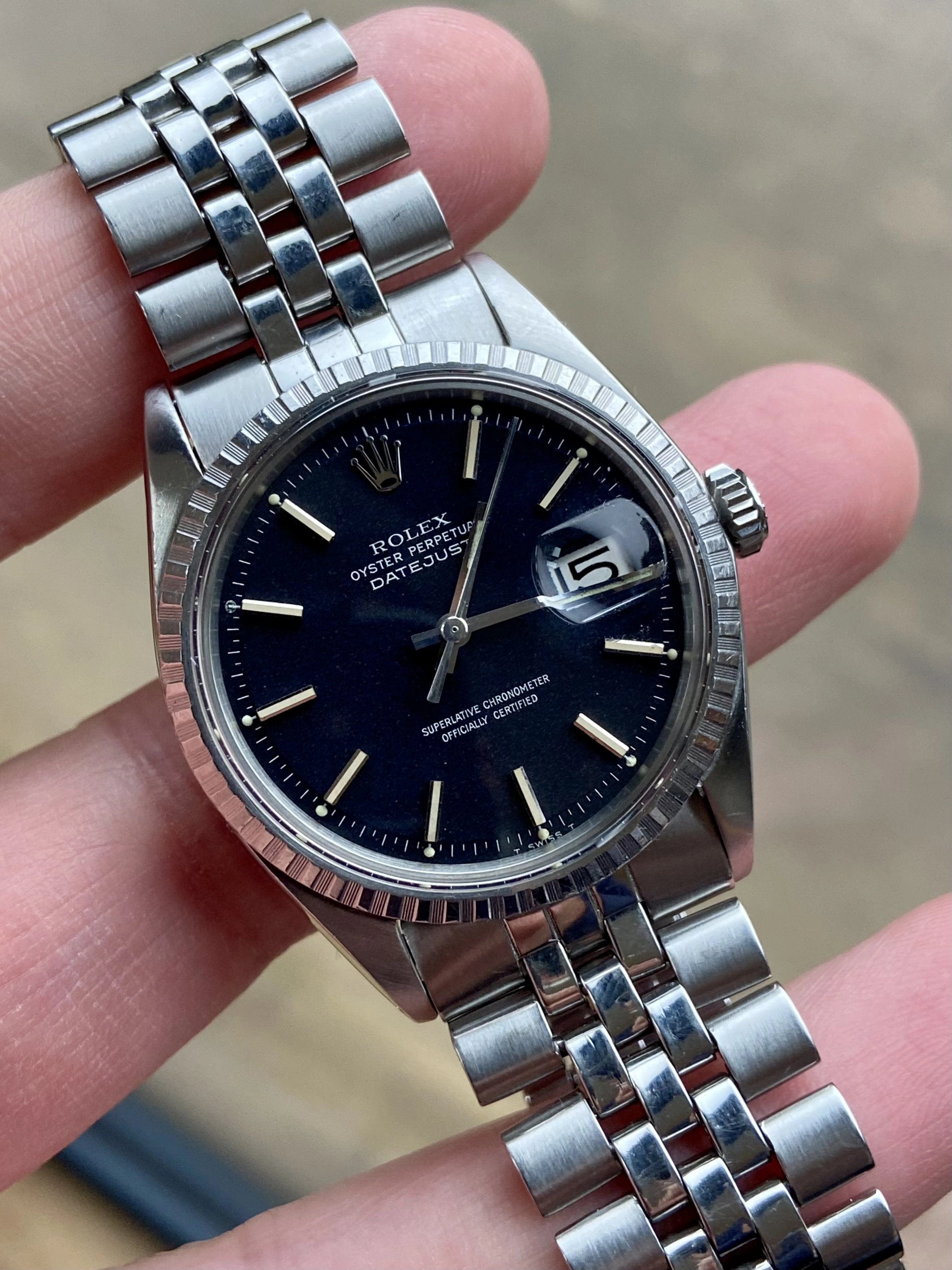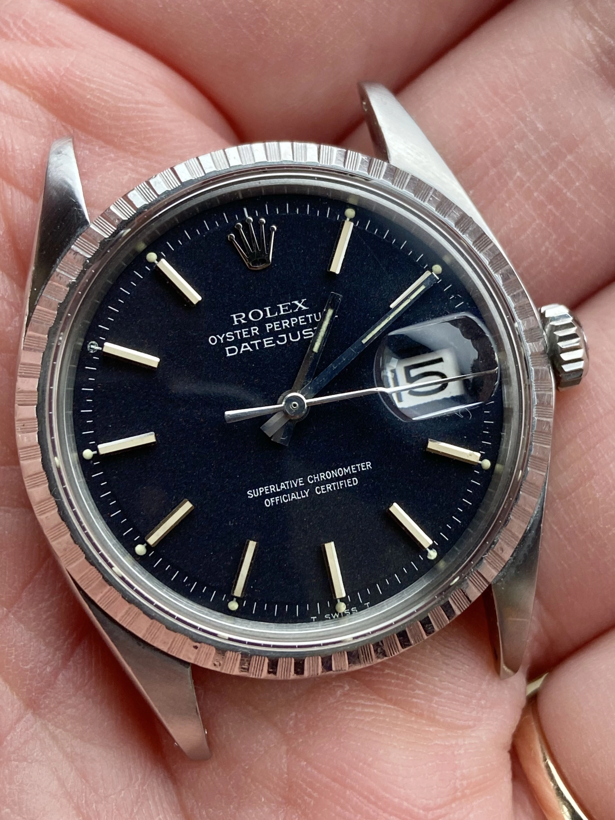 ·Offering for sale a vintage 1970’s Rolex DateJust 1603 with matte black ‘confetti’ dial. These matte black DateJust dials are something else, much more interesting and attractive than the standard black dials. The dial on this one is beautiful with clear flecks of red and blue and gives it a different look to other DateJusts. This has just returned from a full service with a Rolex certified watchmaker, sympathetic to vintage and is under warranty to Nov 2027.