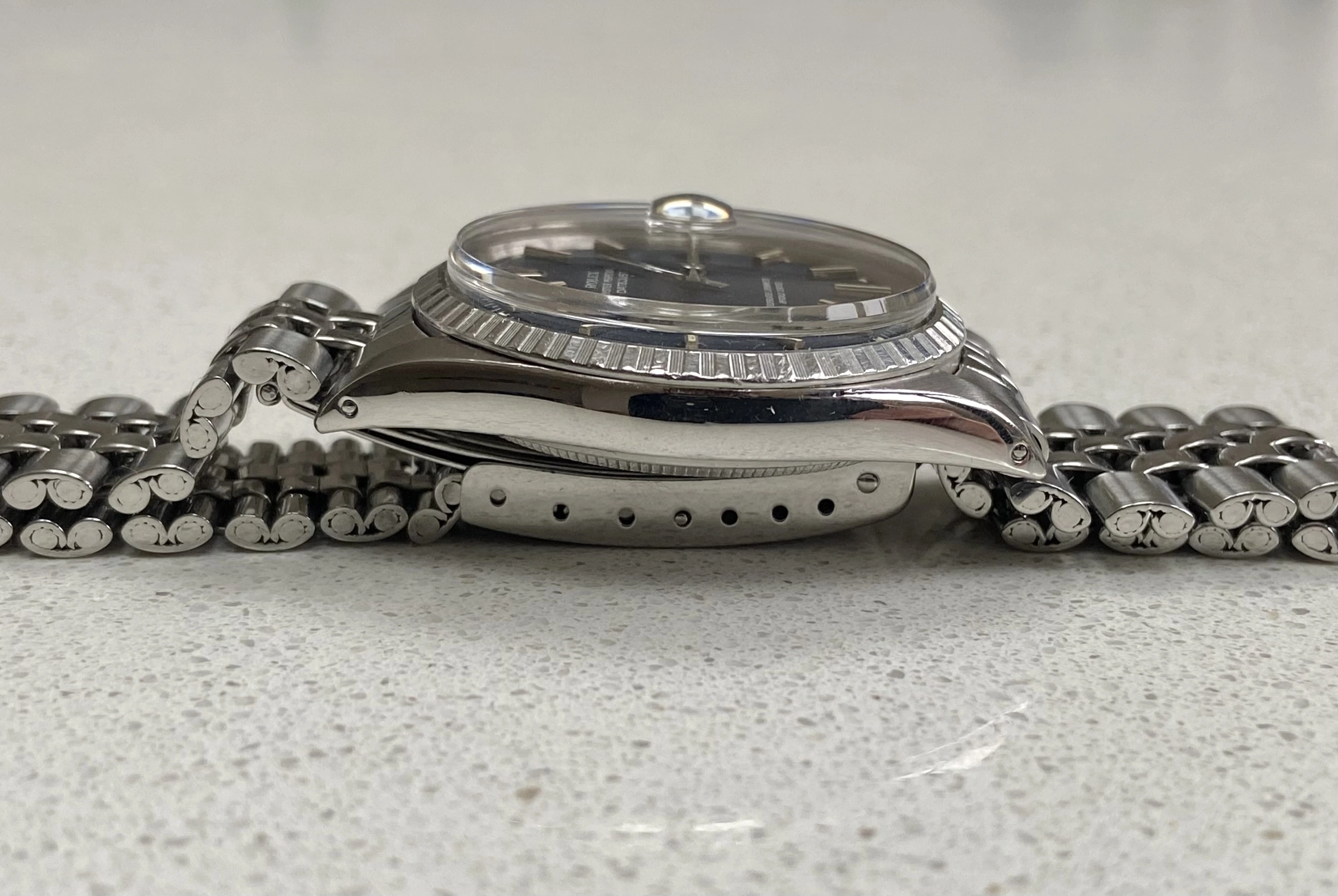 Stainless steel 36mm case ref 1603 with engine turned bezel. Has been polished before (not by me). New genuine Rolex crown, tube, crystal and seals at service on Nov 25. Passed waterproof test at service.