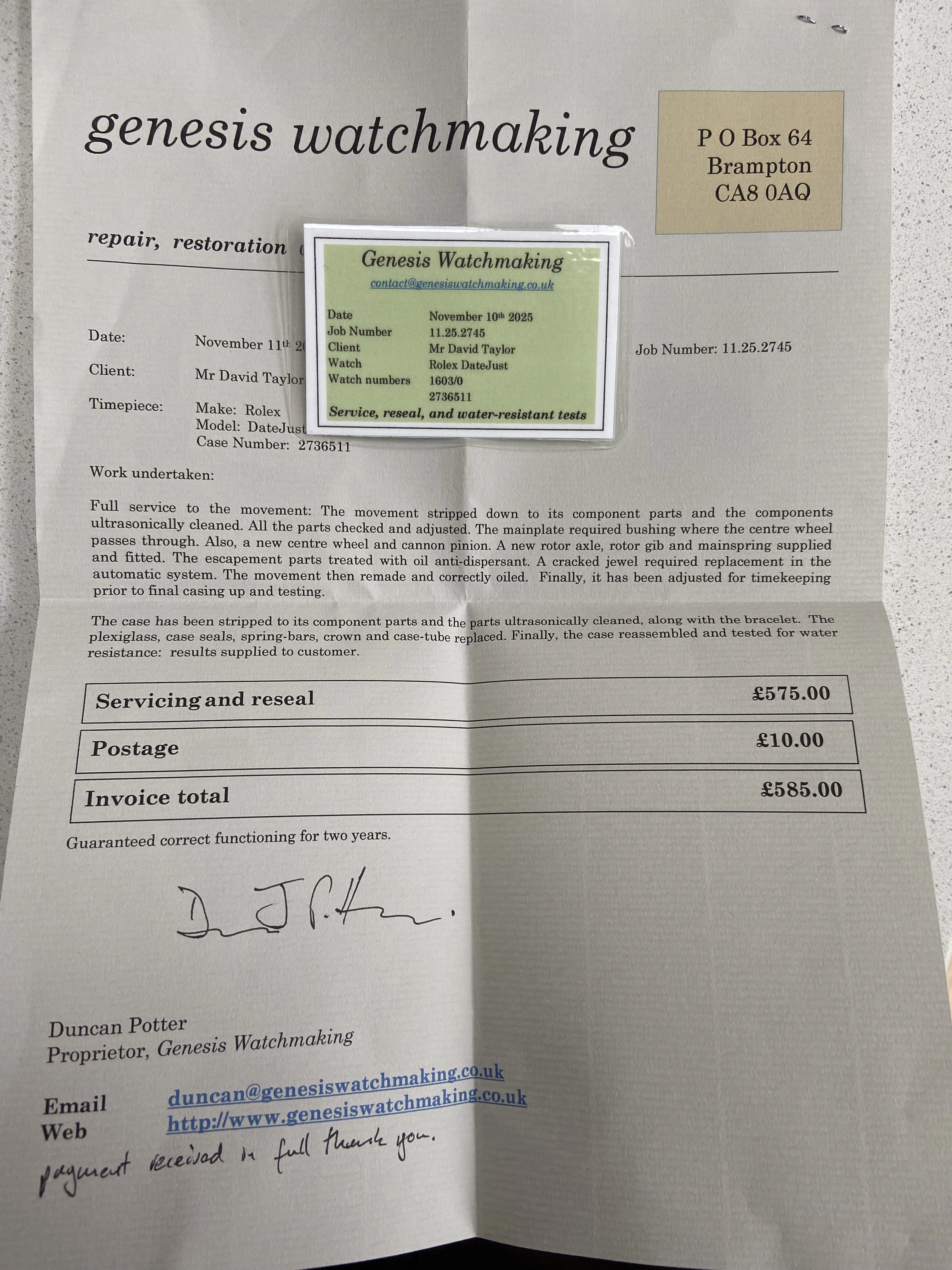 Rolex cal.1570. Fully serviced by Rolex accredited watchmaker, with Rolex parts account in Nov 25, under warranty until Nov 27.