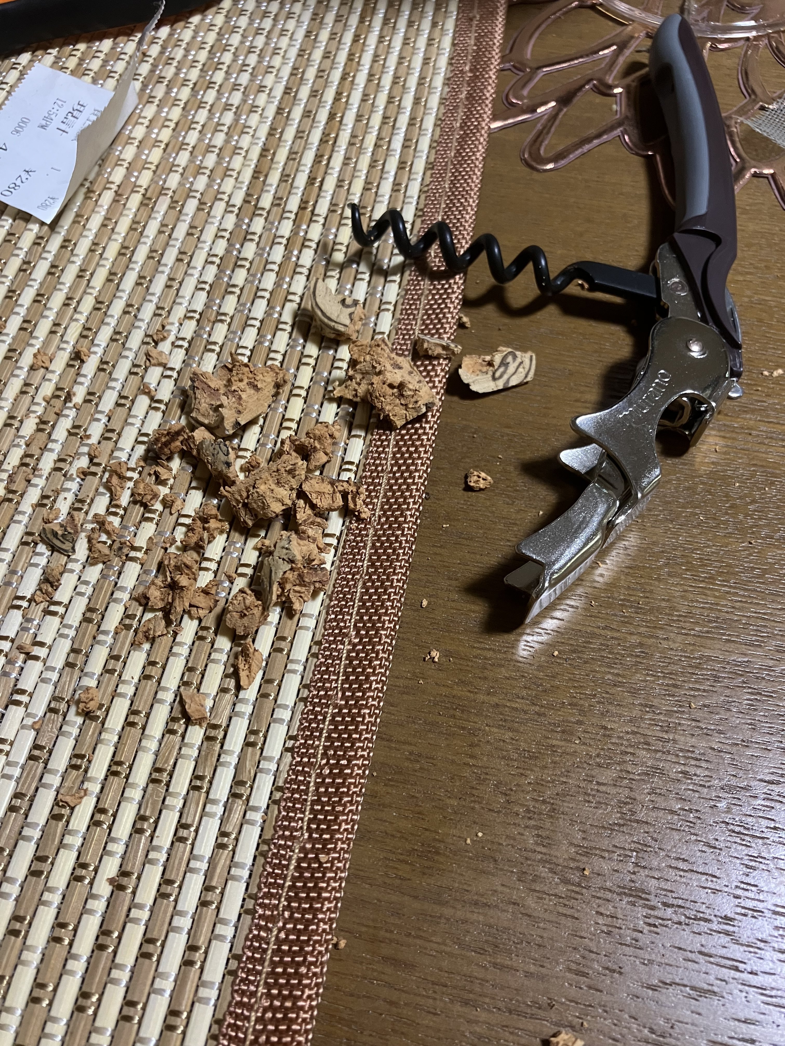 Sadly the cork completely disintegrated and I didn’t have my fancy old-cork remover with me. Nor any strainers or coffee filters, but I remembered that there was some window screen material left over from a repair.