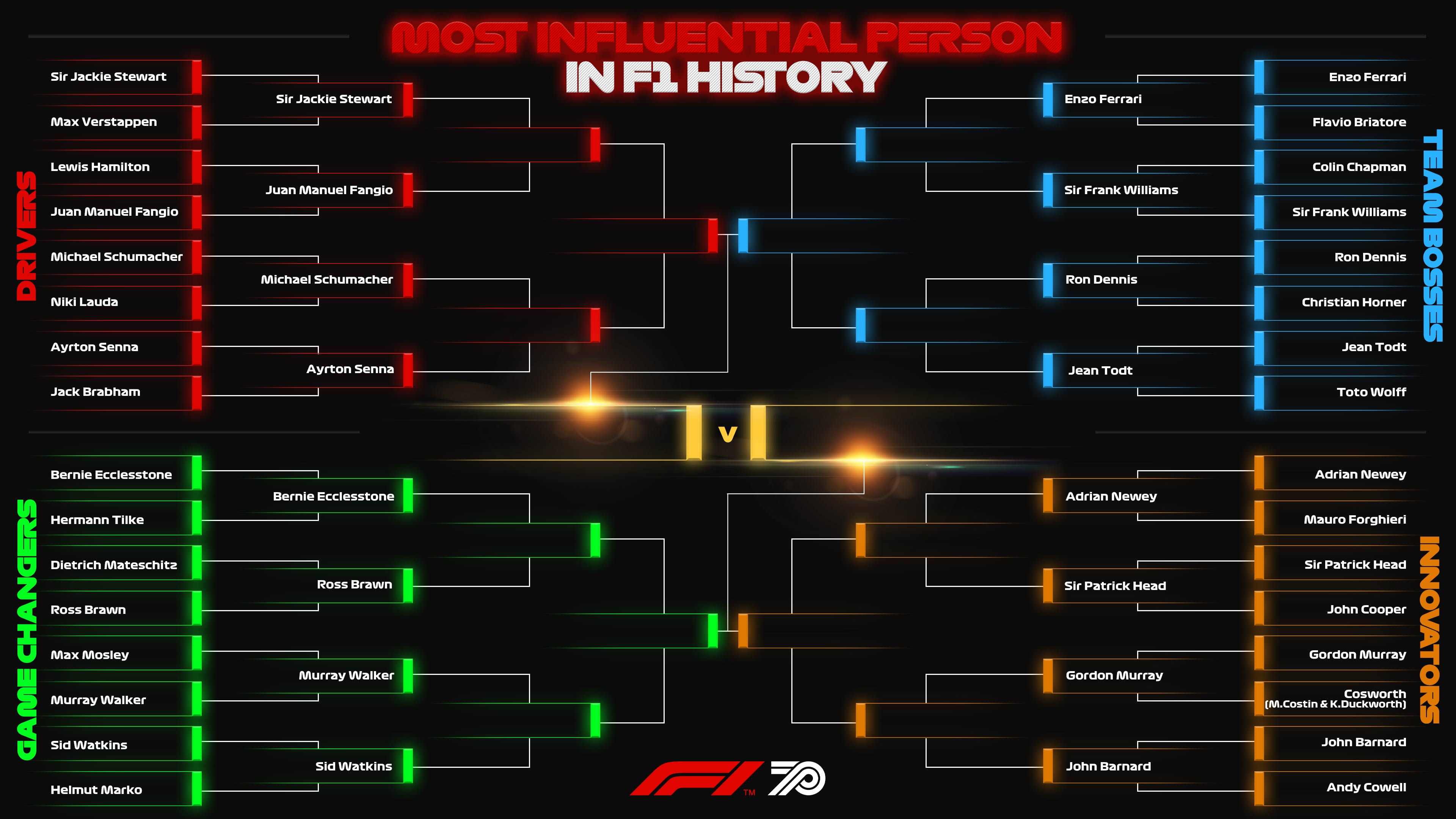 Yes, possibly Senna and Ecclestone will reach the grand final on that full bracket with 32 contenders... both had long talks in the paddock, as Bernie highly regarded Senna's opinions and advice... but I think whoever brought the magic to F1 should win whoever made it big business