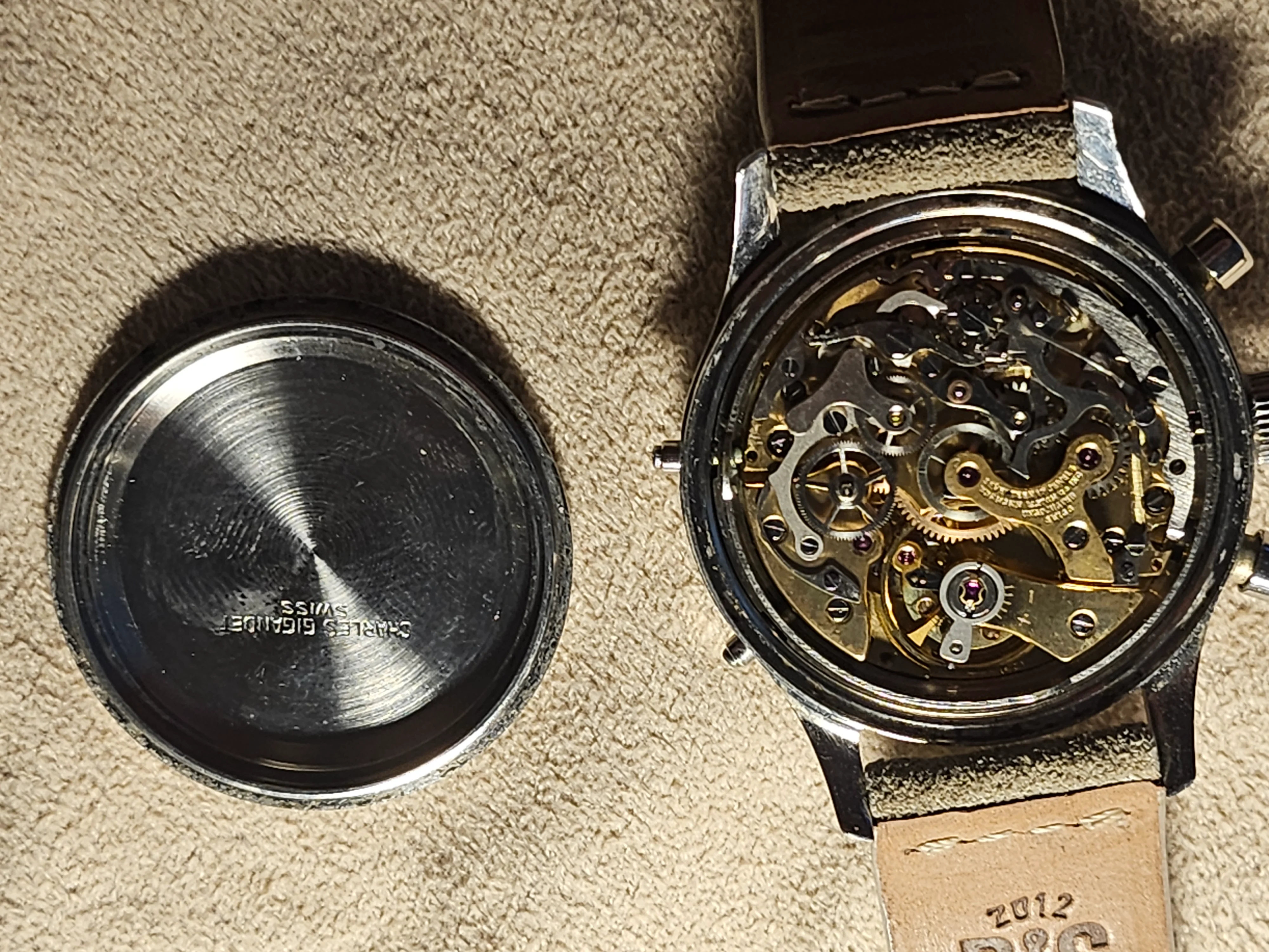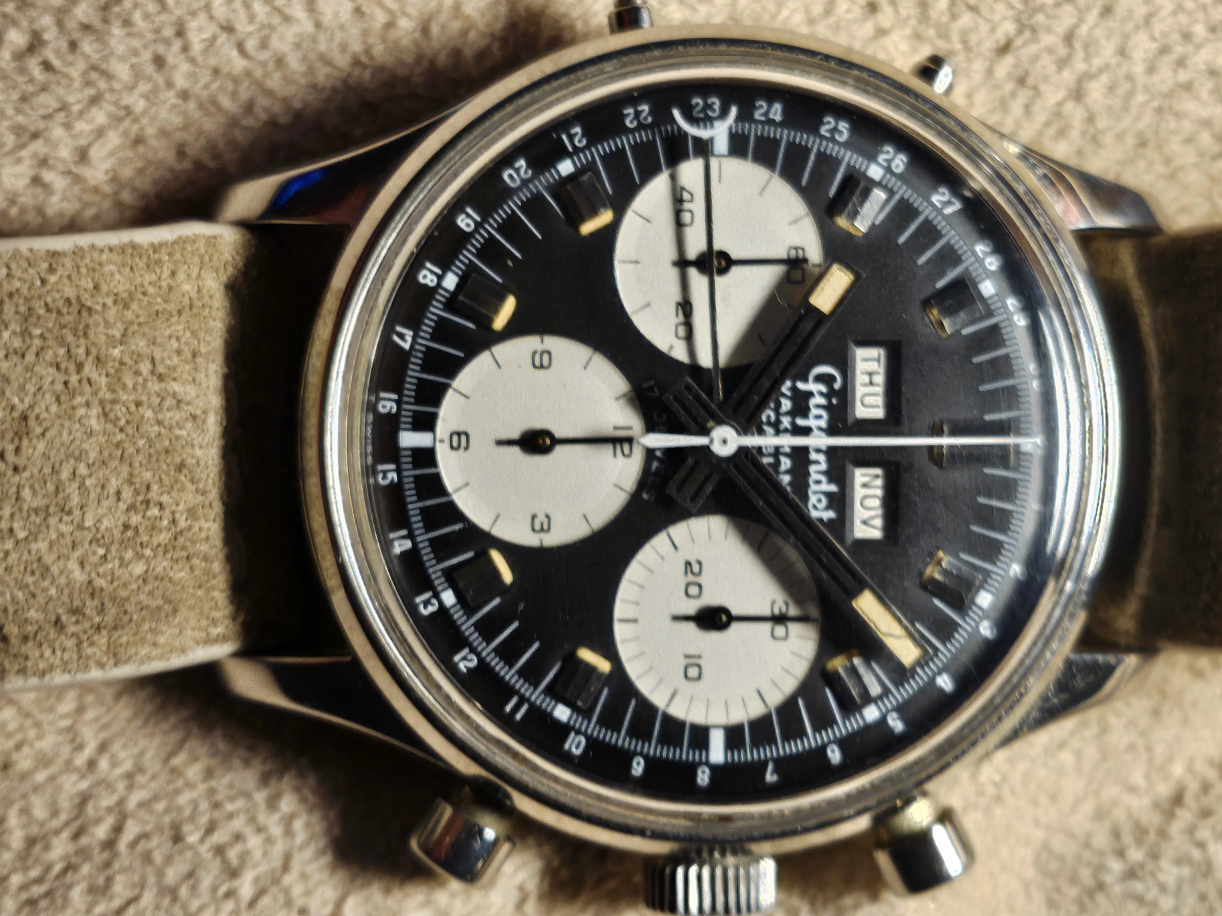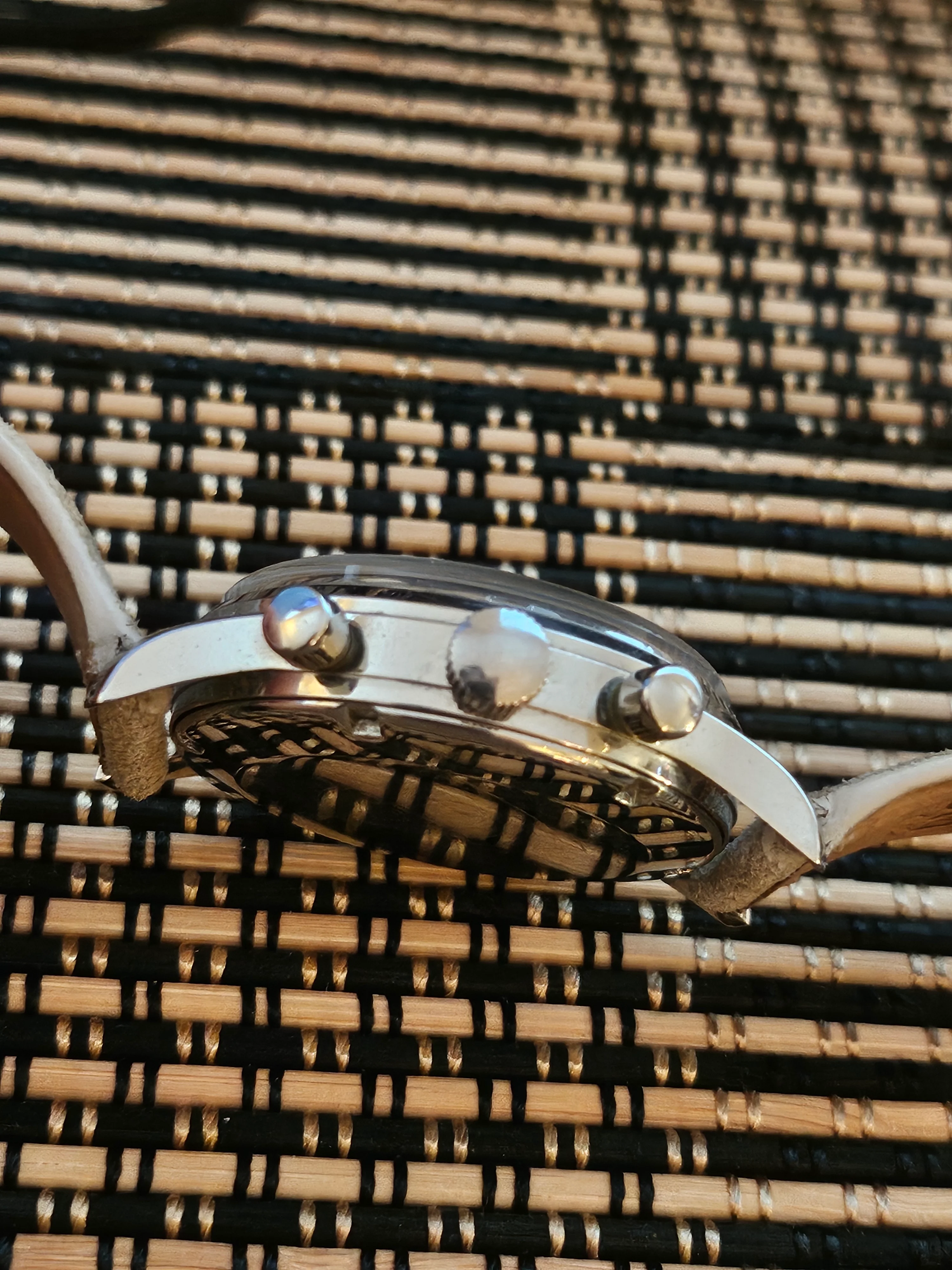 Condition: Watch is fully functioning as it should (dates flipping over, actuation of chronograph, reset, actuation of manual knobs for date adjustment). Did not service it in my ownership, unknown service history beforehand. Movement is very clean.