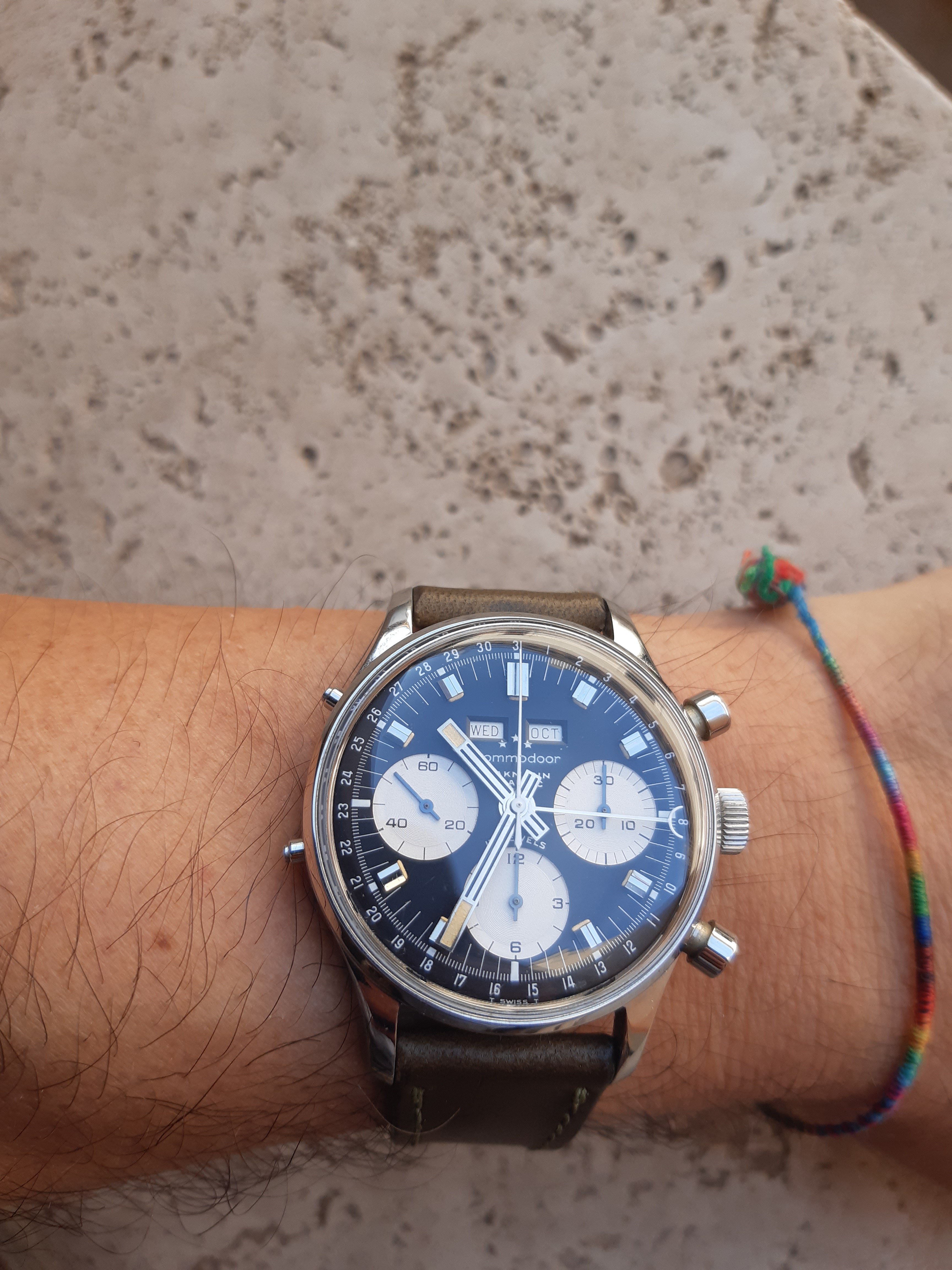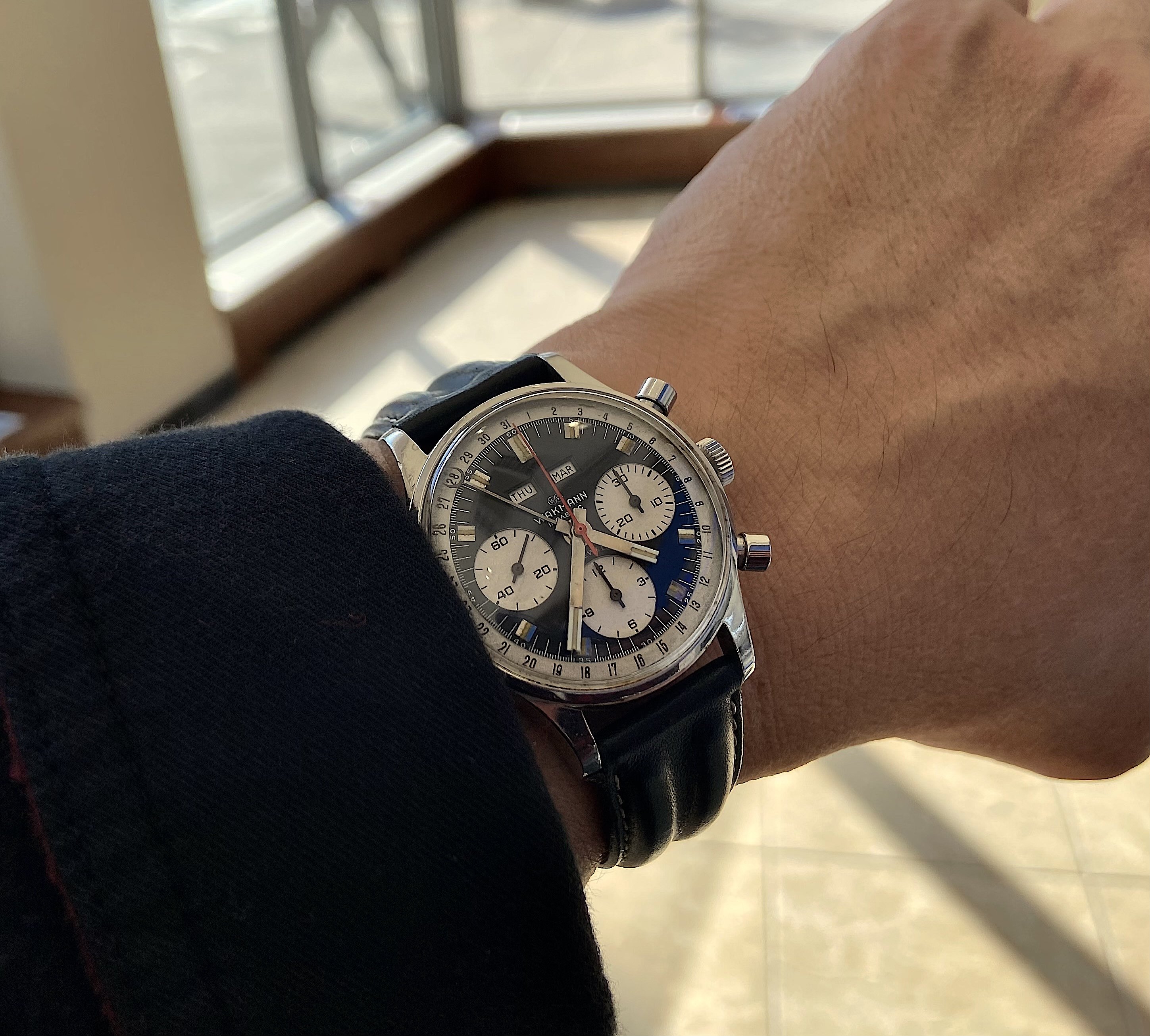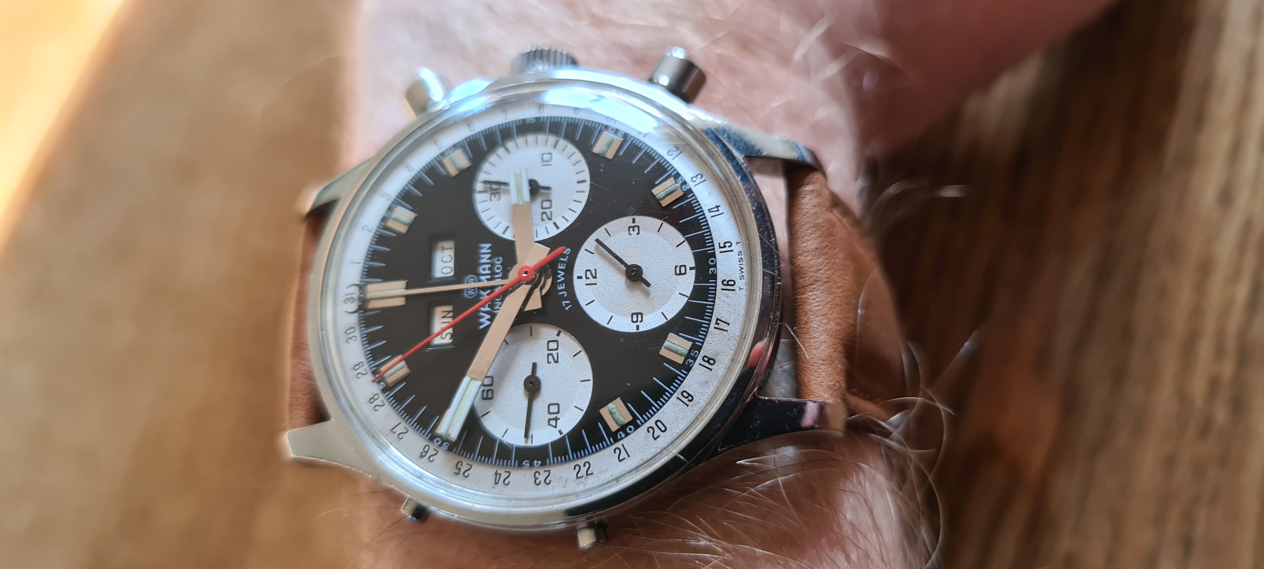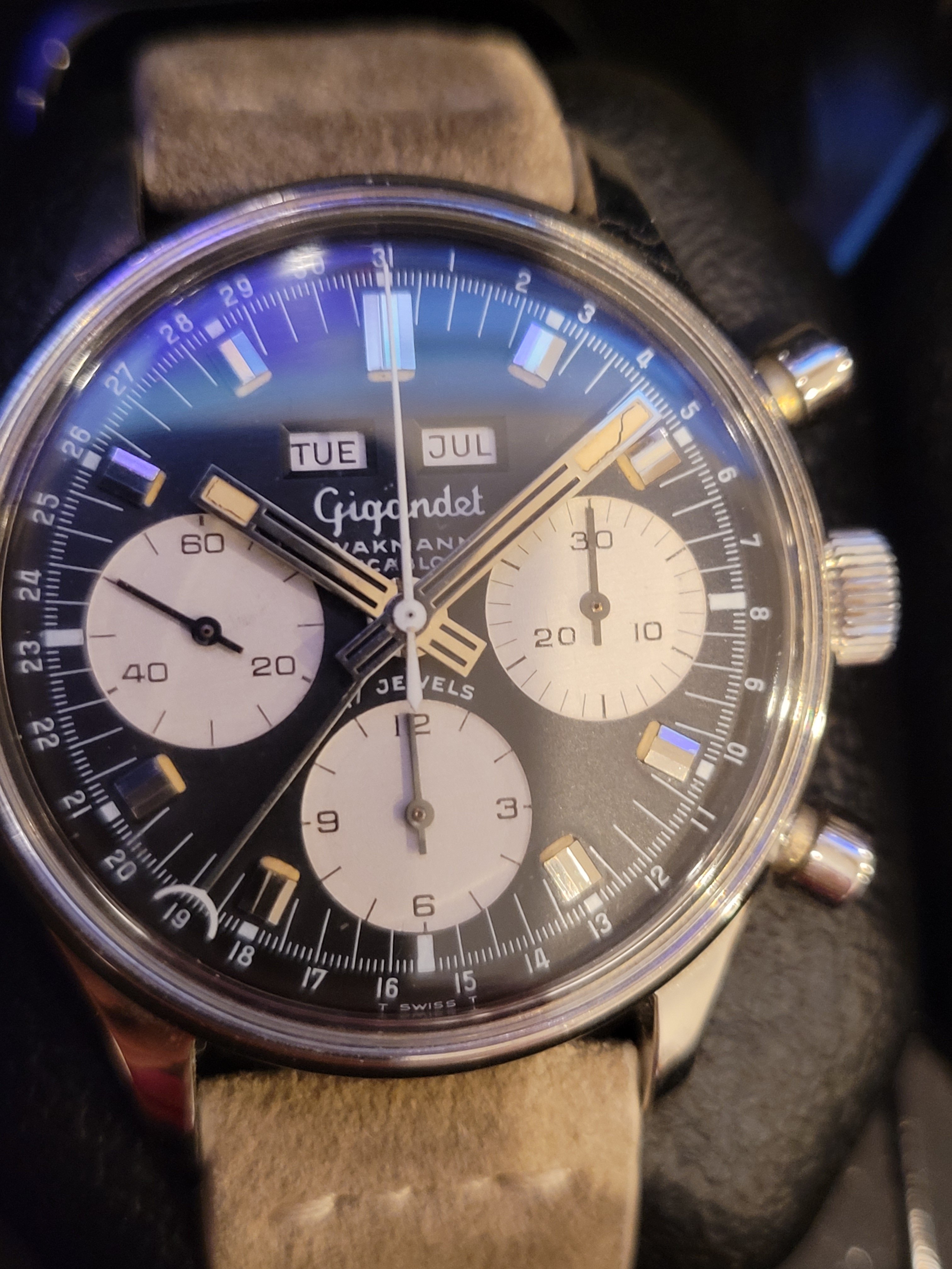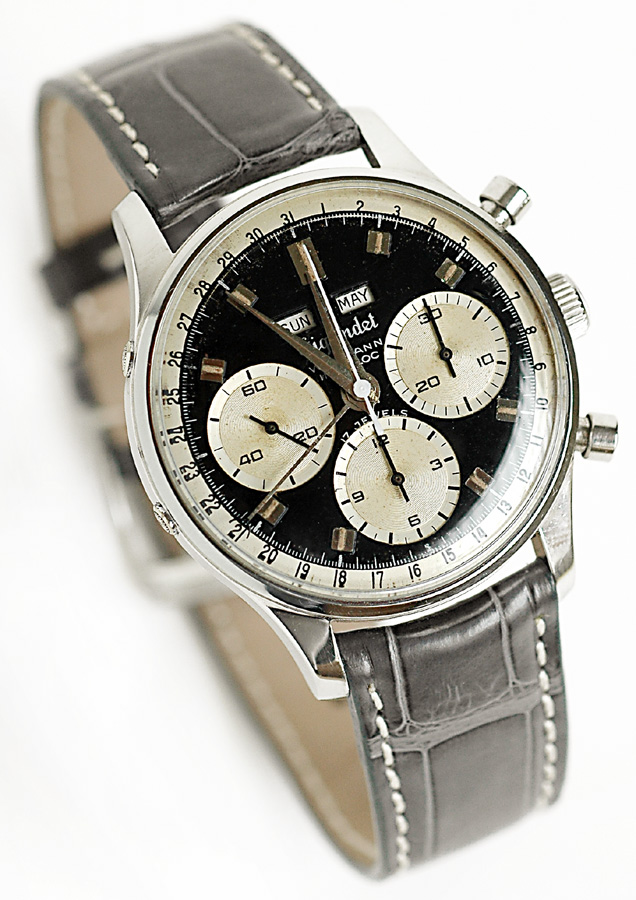 I own two of these now but don't wear them much, not because they aren't attractive. I find this to be one of the most aesthetically pleasing chronographs of that era...or now, and they have solid movements. The chrono functions are superior to several others I own. And even the date features on mine are reliable. They keep reasonably good time, too. So why are the prices on them still mostly below 3k, and why are there always half a dozen of them for sale on ebay? At less than 3k, how many great-looking, reliable vintage chronographs with a Val 72 family movement are there to be had? I'm not sure I can think of any. The 72 was good enough for those old Daytonas for a very long time, and one could easily argue that they are not really any better built than the Wakmann.