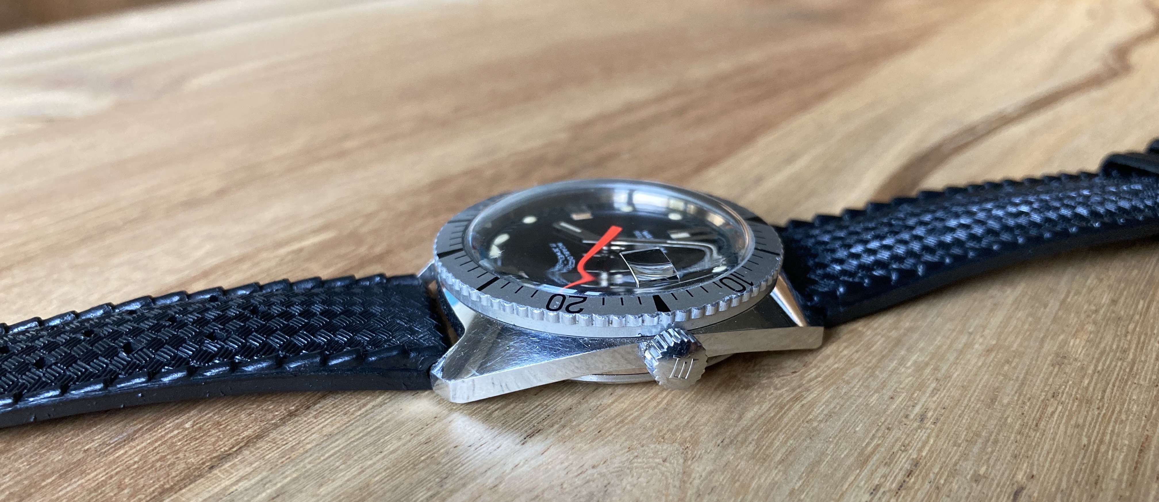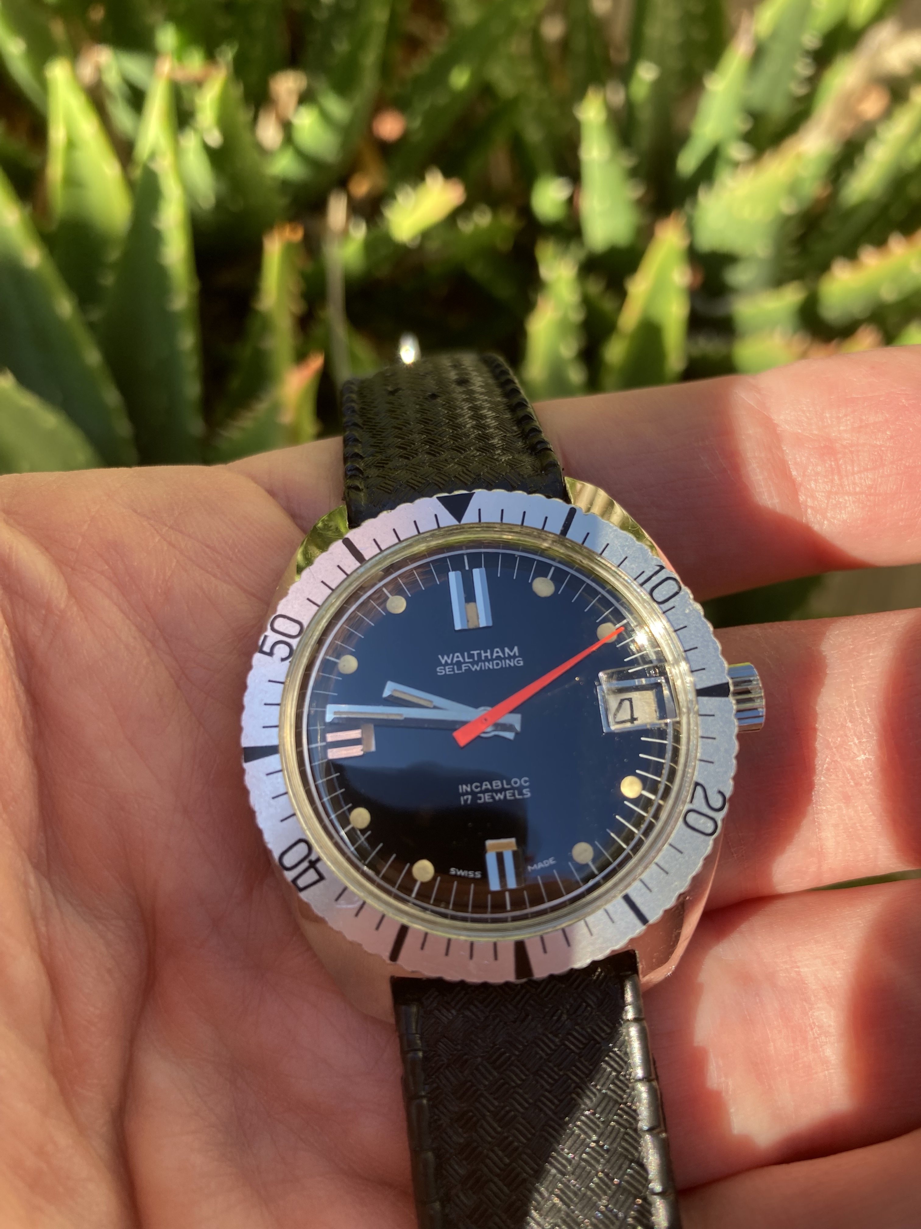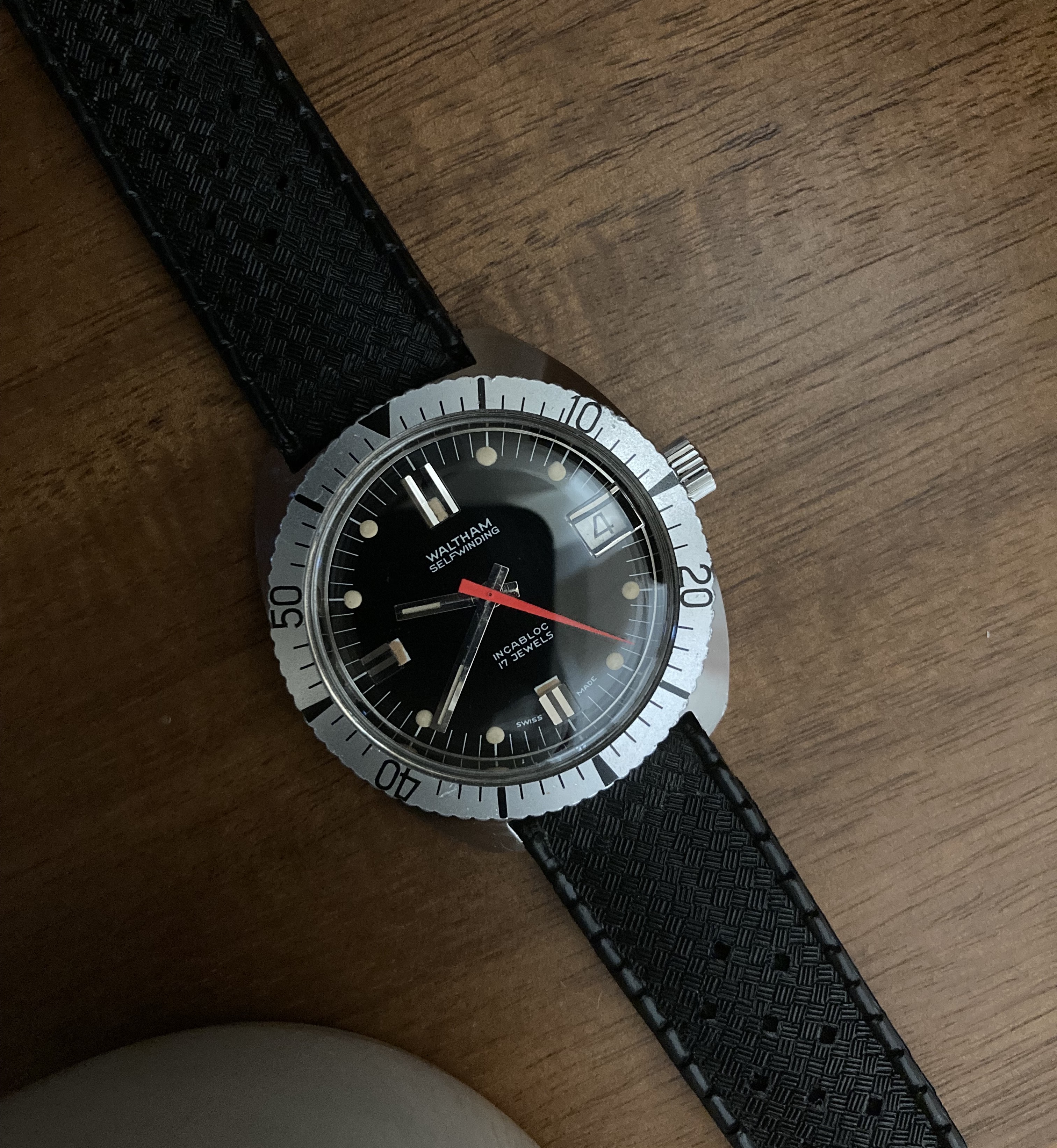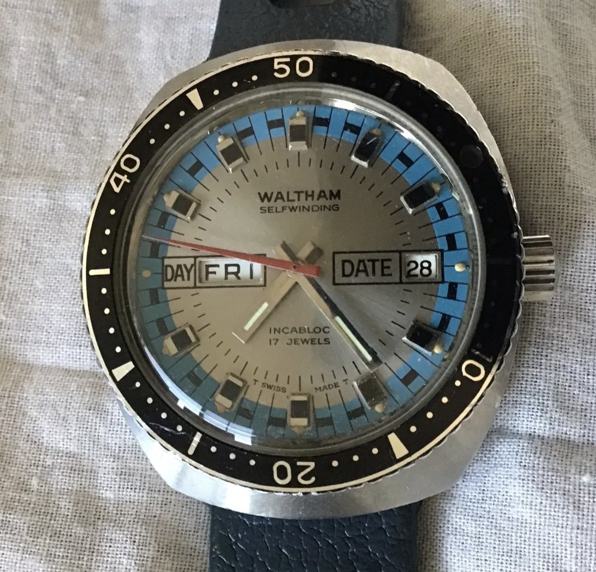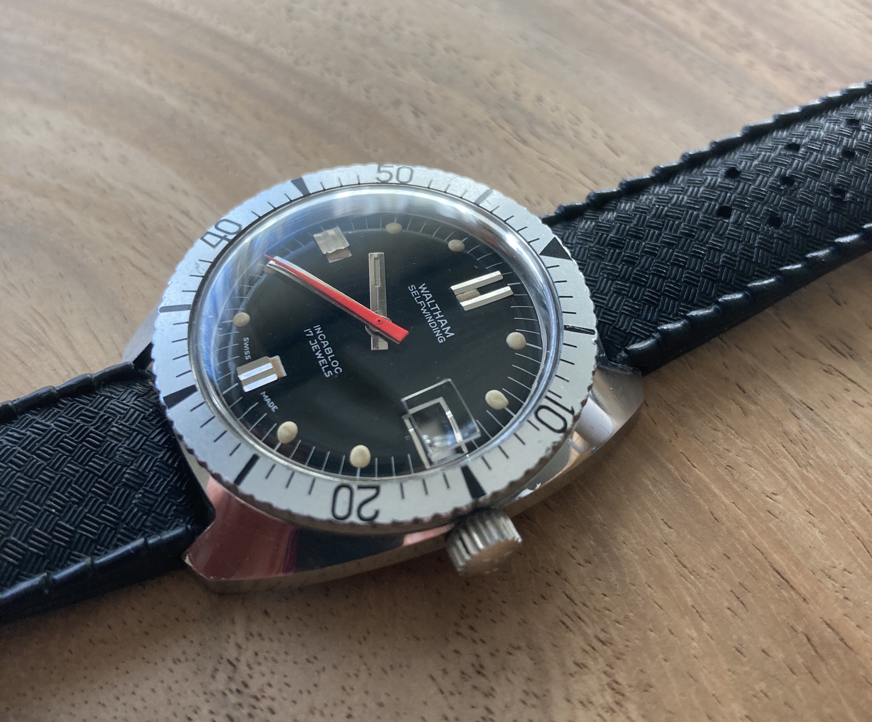 ·I didn't spot a thread devoted to vintage Waltham divers, so I'd like to start one. I find these watches can be attractive, with some interesting dial elements and hand sets. Please post your Waltham divers and any information you'd like to share. Would be keen to see some of those bakelite bezels.
