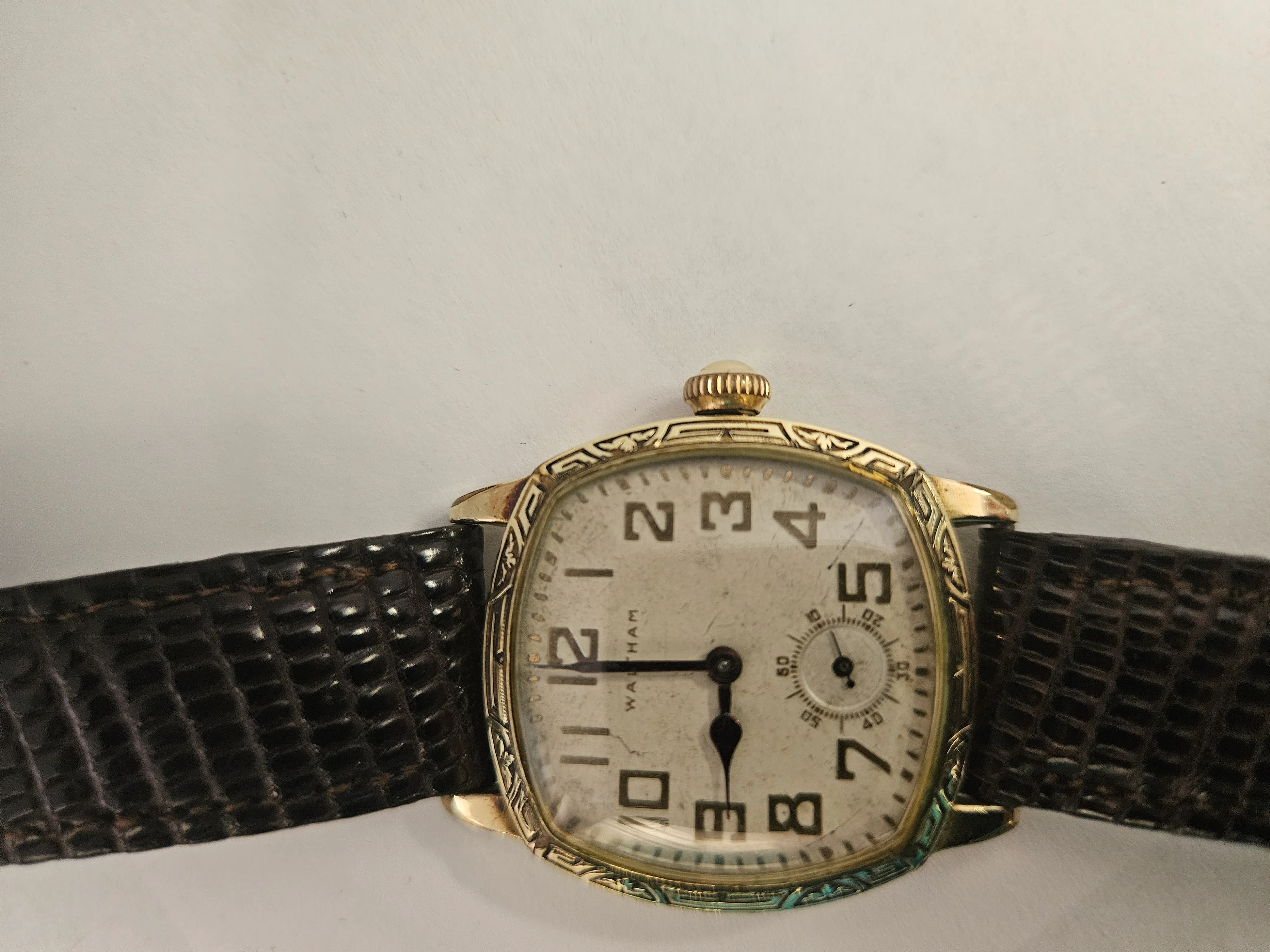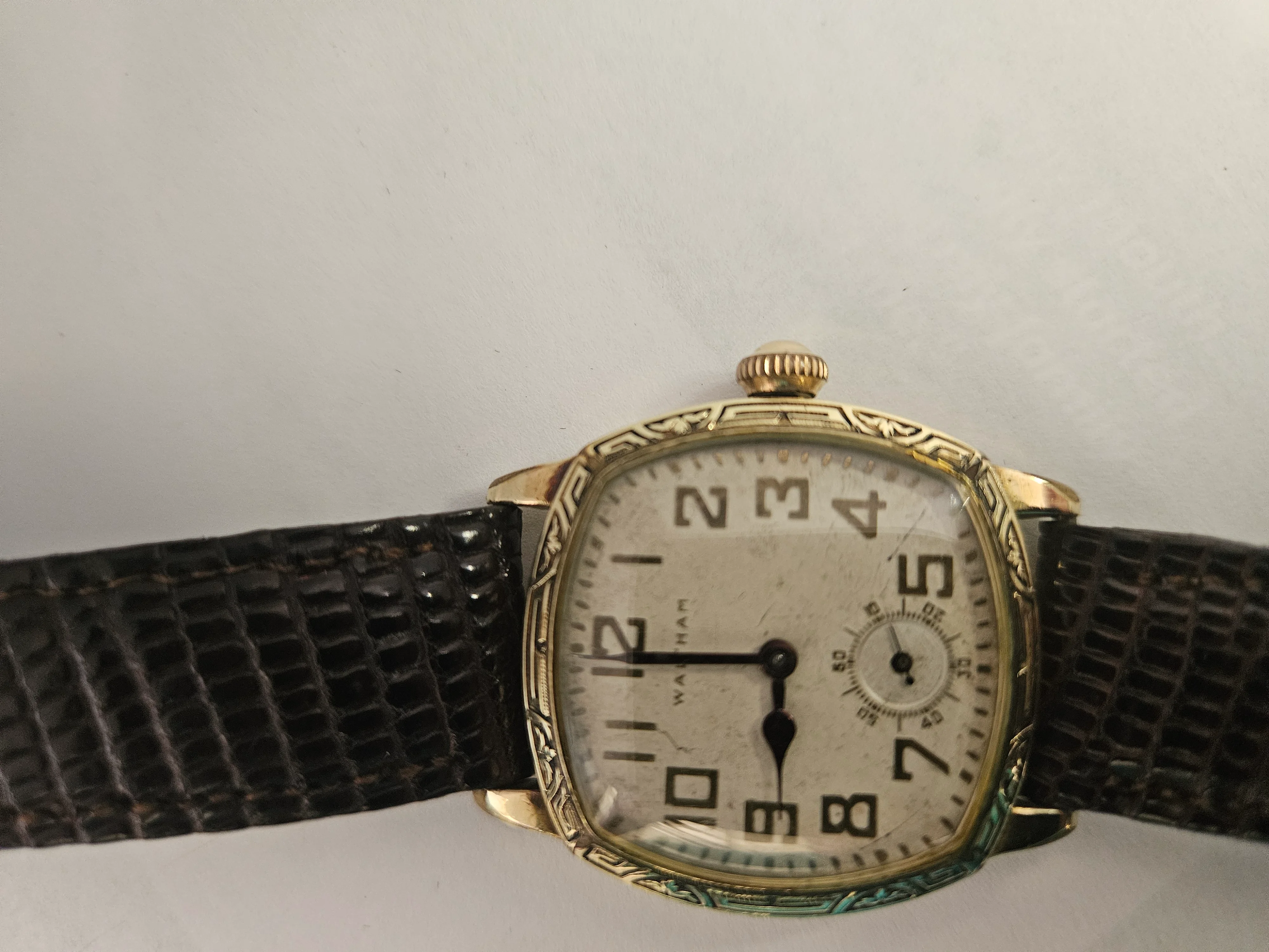 Great old Waltham you've found. These are excellent wrist watches, but do not offer any shock protection, so be careful of hard surfaces when you wear it. @gatorcpa is absolutely correct in saying that it is gold filled, you can see brassing on a couple of the lugs and the corners of the bezel. The Pocket Watch Database is an excellent resource, you won't be disappointed by it.