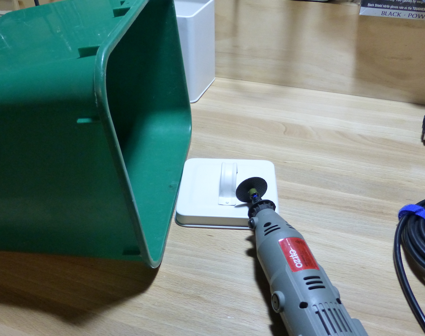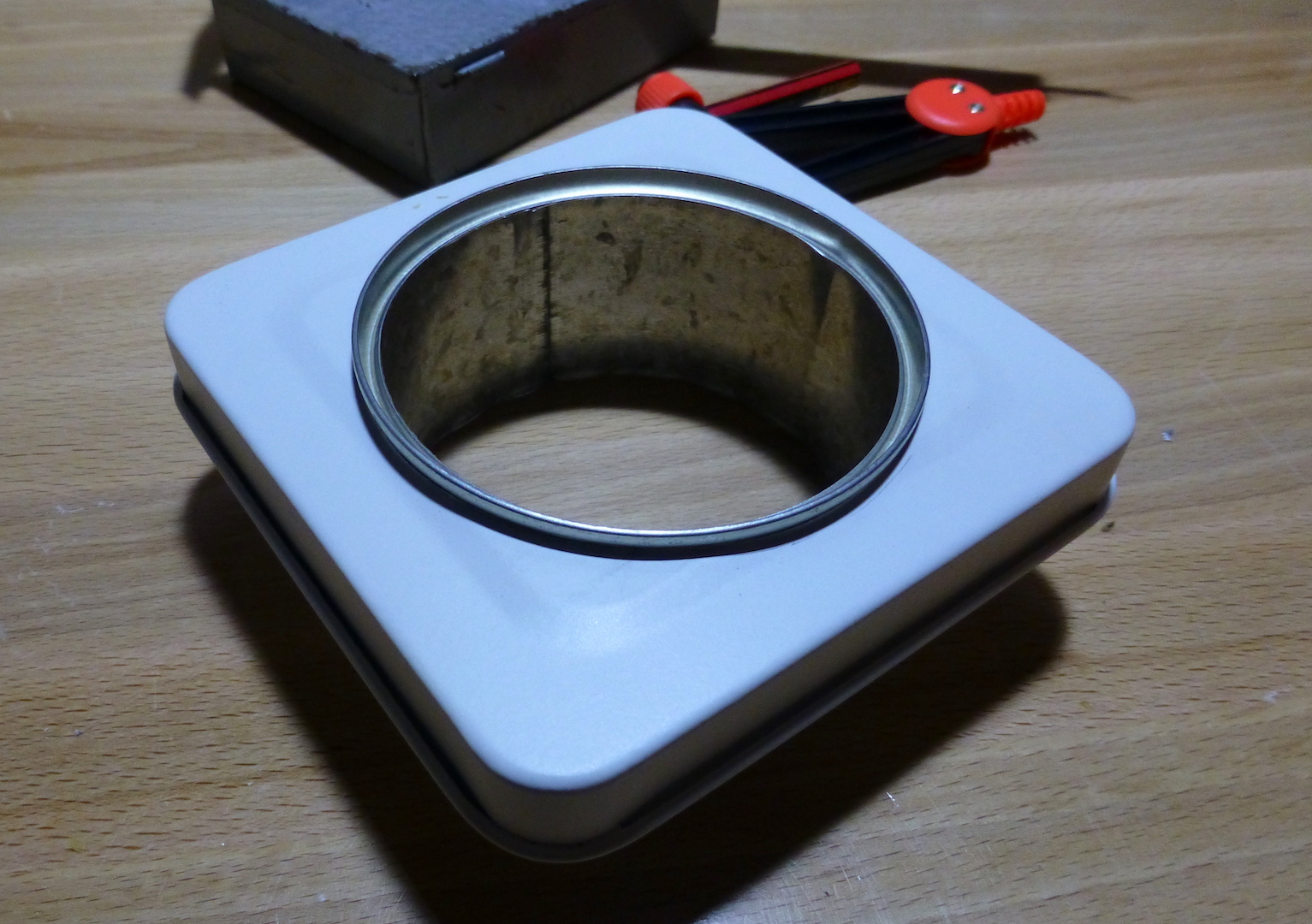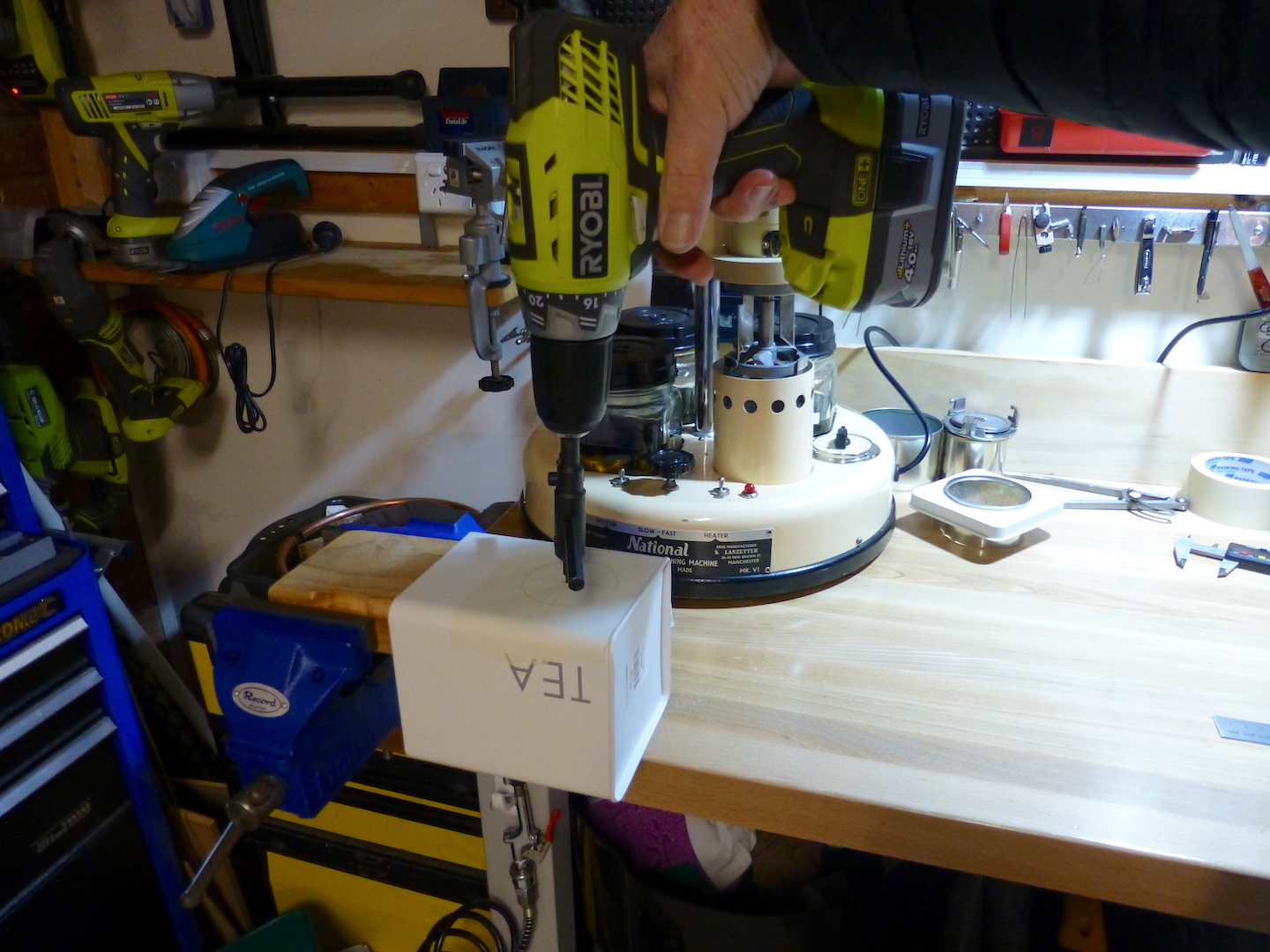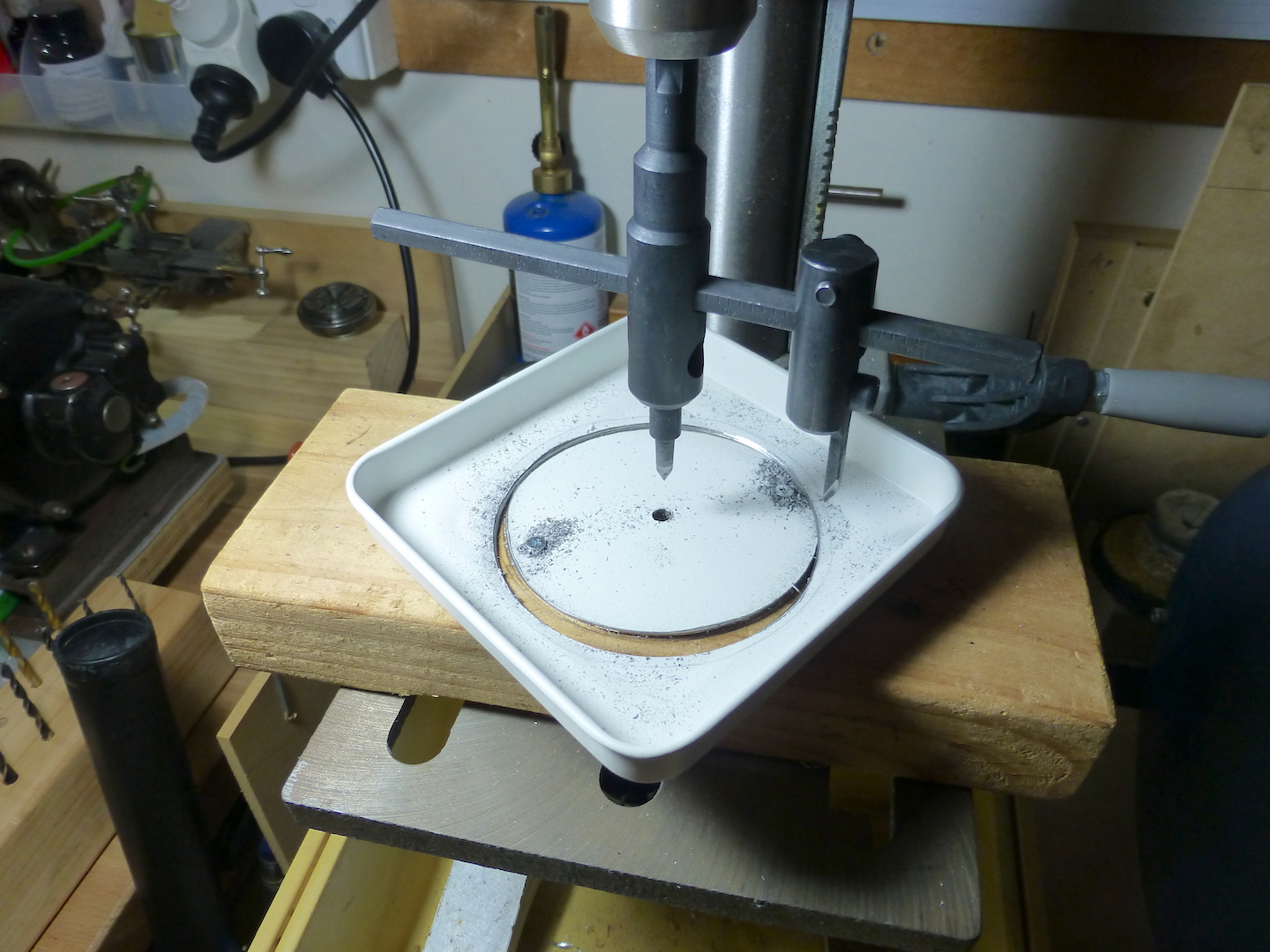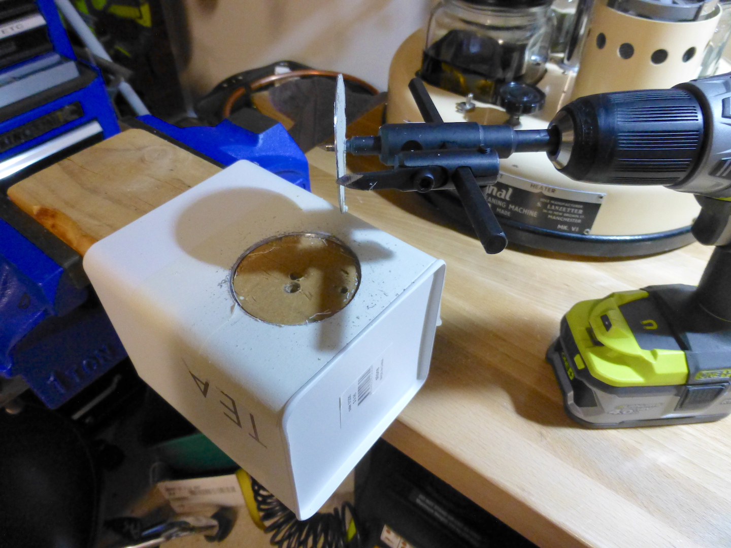 I didn’t have a sheetmetal punch, so I had to improvise with a downlight hole cutter with a sharpened and hardened blade. The lid was clamped to the drill table and I slowly applied the blade. It was a bit scary with that big bar whizzing around, lucky my hair isn’t long enough to get caught up in it.