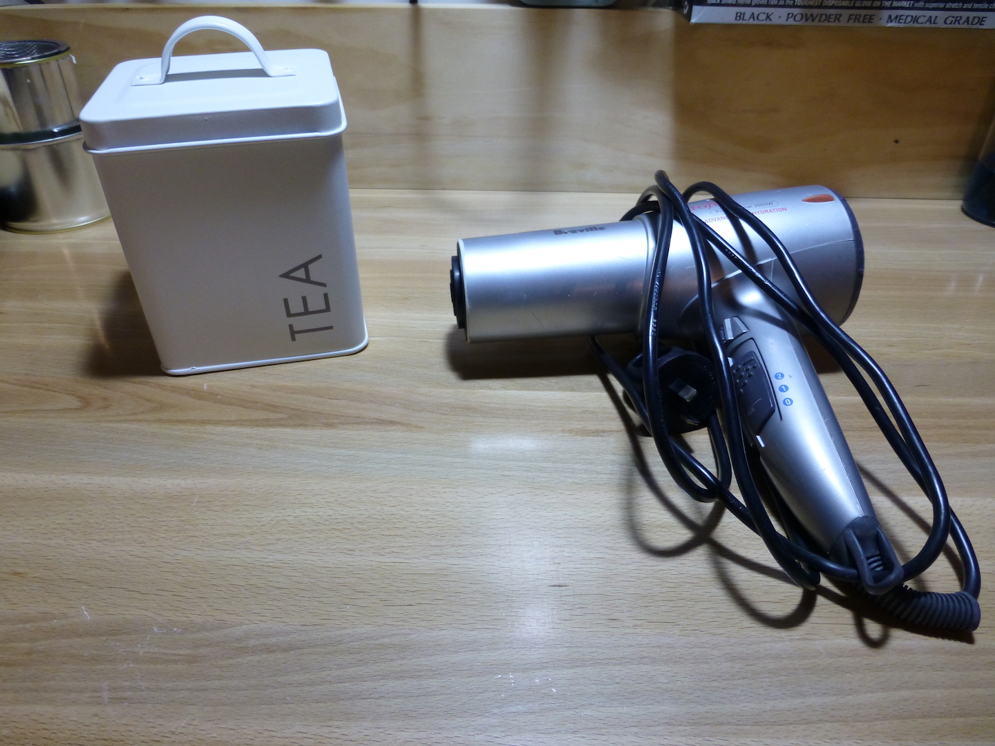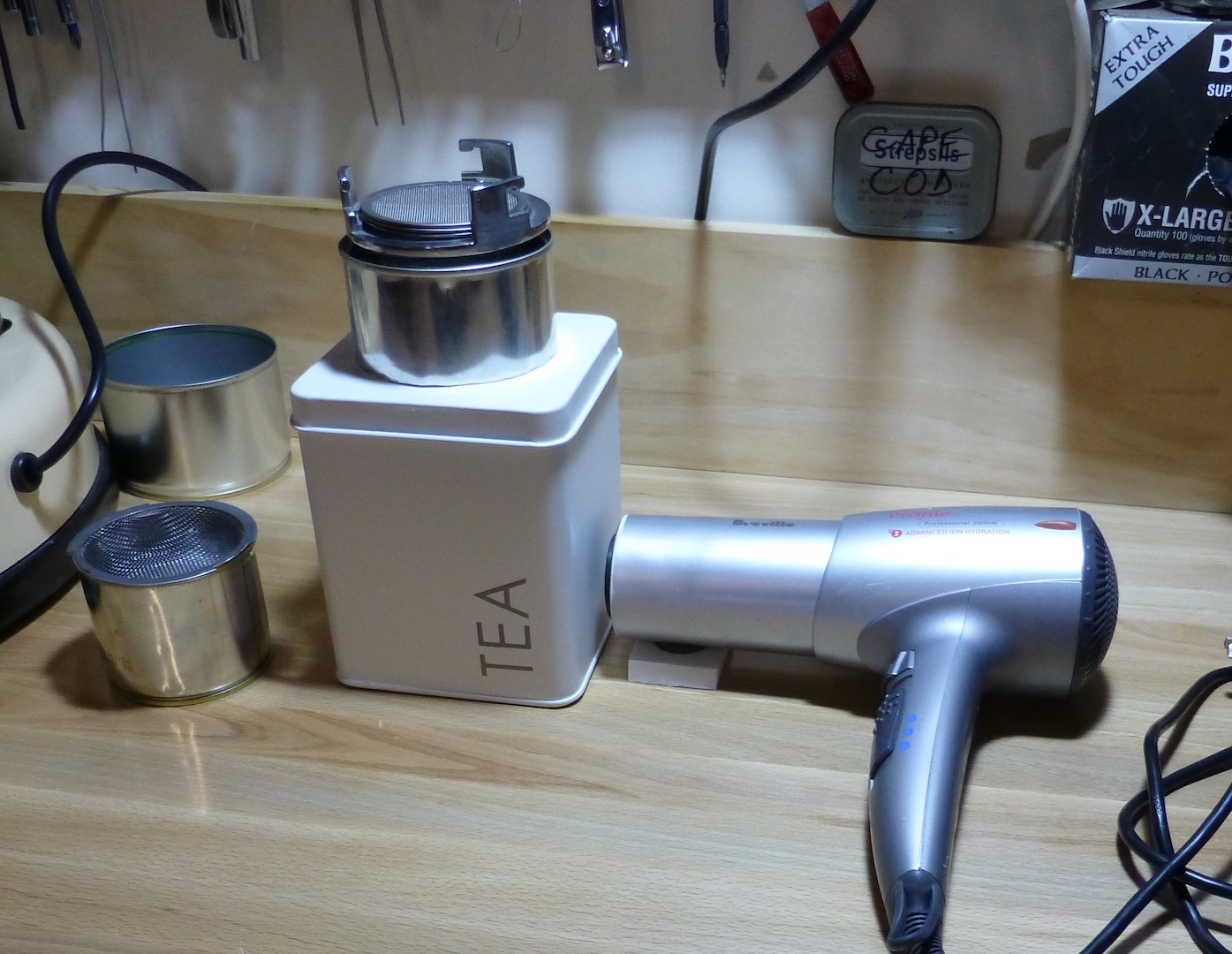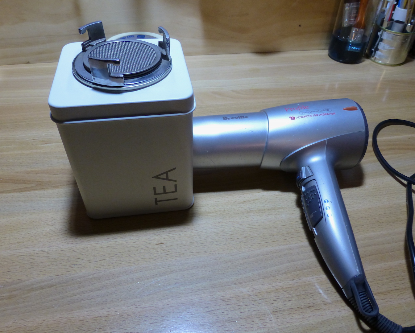 I needed a hot air dryer, but the ones available are a bit expensive for a hobby, so I looked around the house to see if I could find anything that could be turned into a watch parts dryer. Luckily I just happened to find just the thing in the pantry, and the other half in Annie’s bathroom.