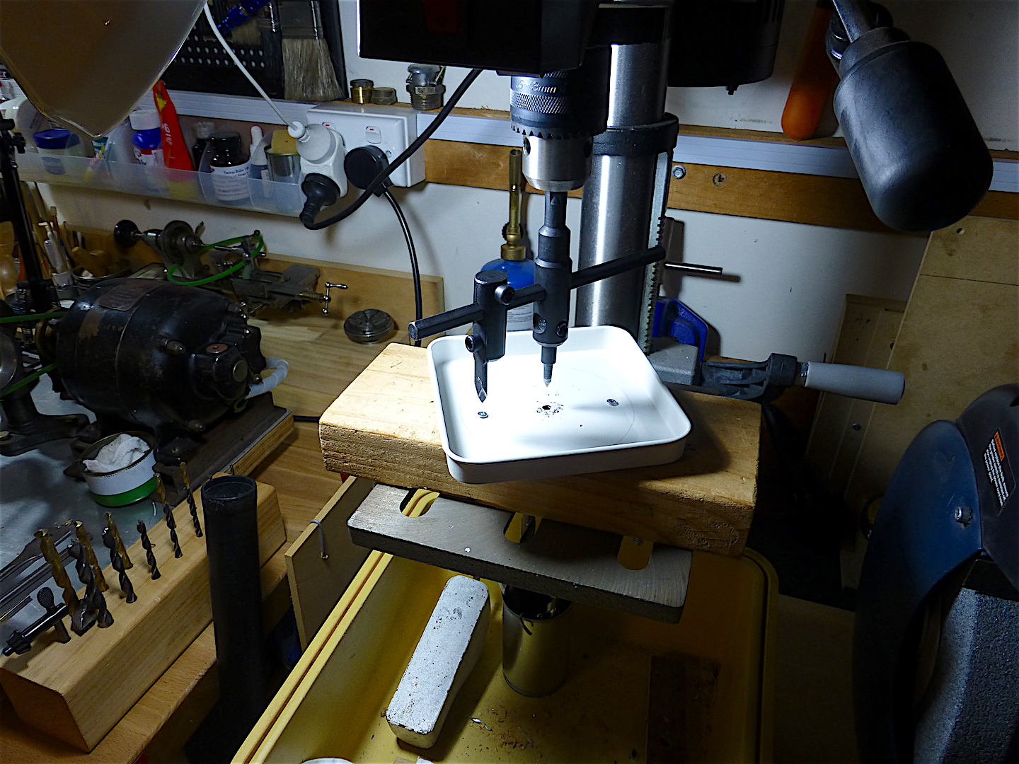 The next hole in the side of the can was a bit harder and scarier. I couldn’t clamp it under the drill so I used a hand drill with the tin on a block of wood in the bench vice.