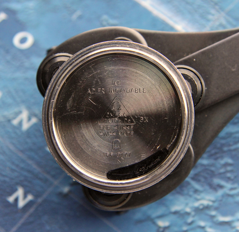 CASE & CASEBACK: Large, angular and distinctive octagonal case measures 43mm wide (including crown guards) x 49mm long x 13mm tall. Being originally new old stock and then worn sparingly it is quite clean and unpolished with all edges and bevels sharp and the original satin finish present. There are only some minor marks to the case from limited use and it is Near Mint. The outer caseback also has only minor marks with the Seamaster symbol and "Tested 200M" text crisp as when new--externally likewise Near Mint cosmetic condition. The inner caseback has no corrosion and shows all the correct original Omega nomenclature of the period, including the proper reference number for this case shape of Seamaster 200.