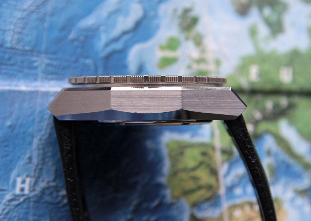 BEZEL: Thick ratcheting bidirectional rotating elapsed time bezel is tight and clean with sharp, well defined knurling, Mint condition. The black & silver metal inlay shows one small mark near the "14" hash, Near Mint condition, and it retains its luminous Luminova pip within the triangle at "12".