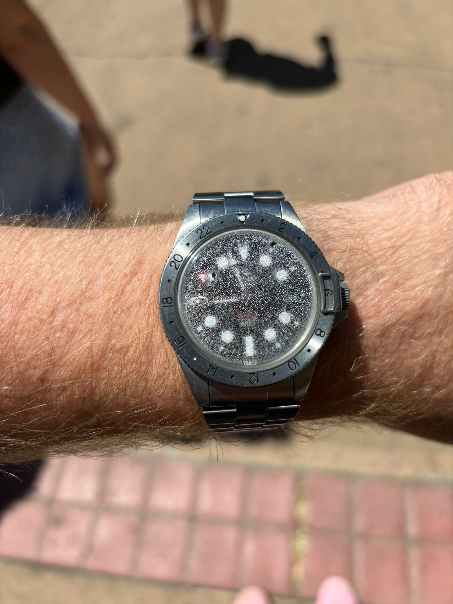 ·Dear OF members, I have a spot of a dilema and maybe someone here can point me in the right direction. My 21yo son has just started his Erasmus placement at the University of San Diego, arriving last week, the weather there is somewhat better than it is here in the Emerald Isle and has been taking full advantage of the outdoors swimming facilities, unfortunately it appears that he did not properly screw down the crown of his Yema Superman heritage GMT and now it looks like this