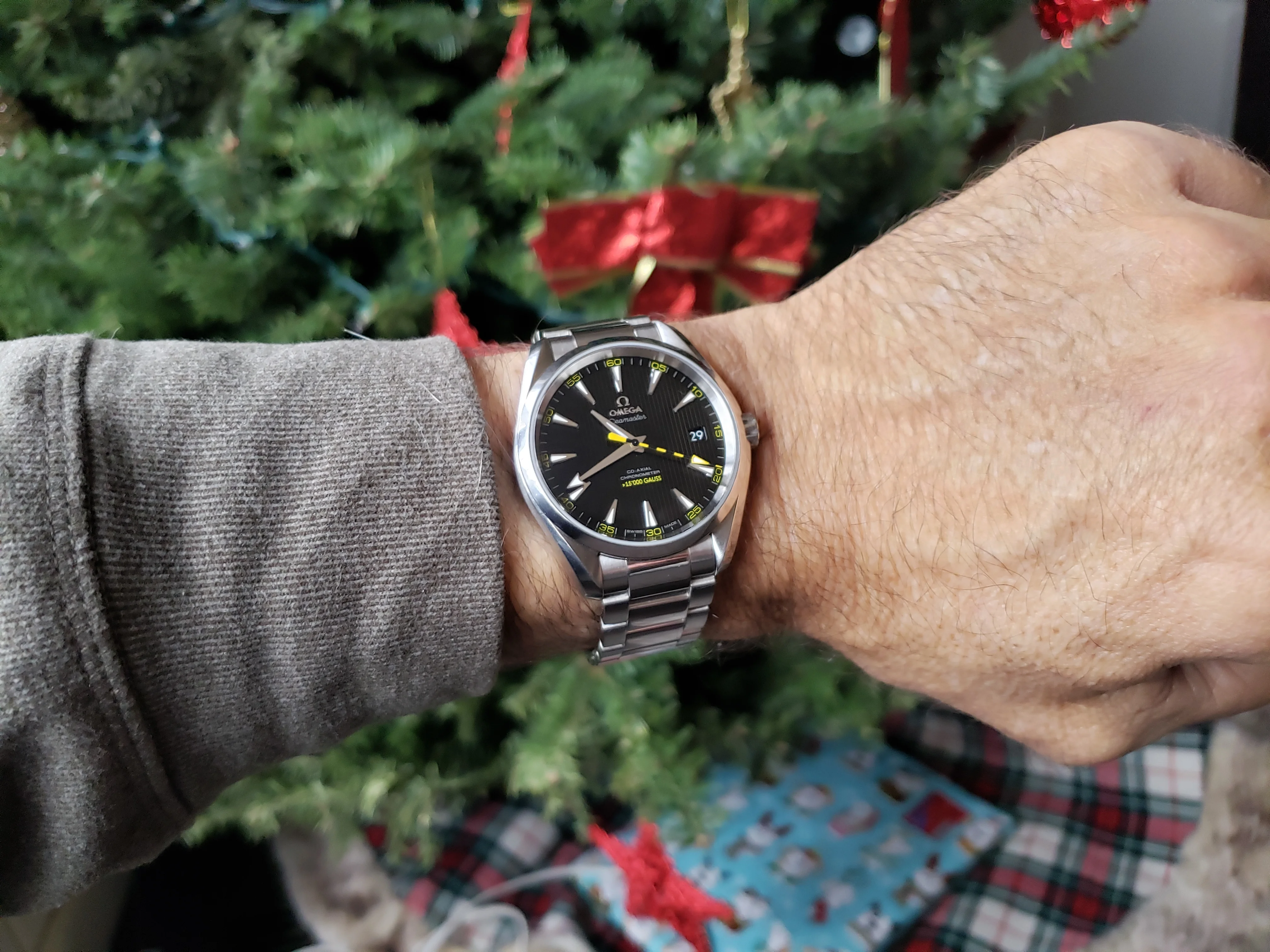 After thinking about it some more, especially since he already has a chronograph, getting the FOIS might be too similar. Recently picked up my first Aqua Terra, older Bumblebee (black vertical teak dial) Really surprised how can go from dressy to casual and in between without blinking. It's the most versatile out of all my watches.