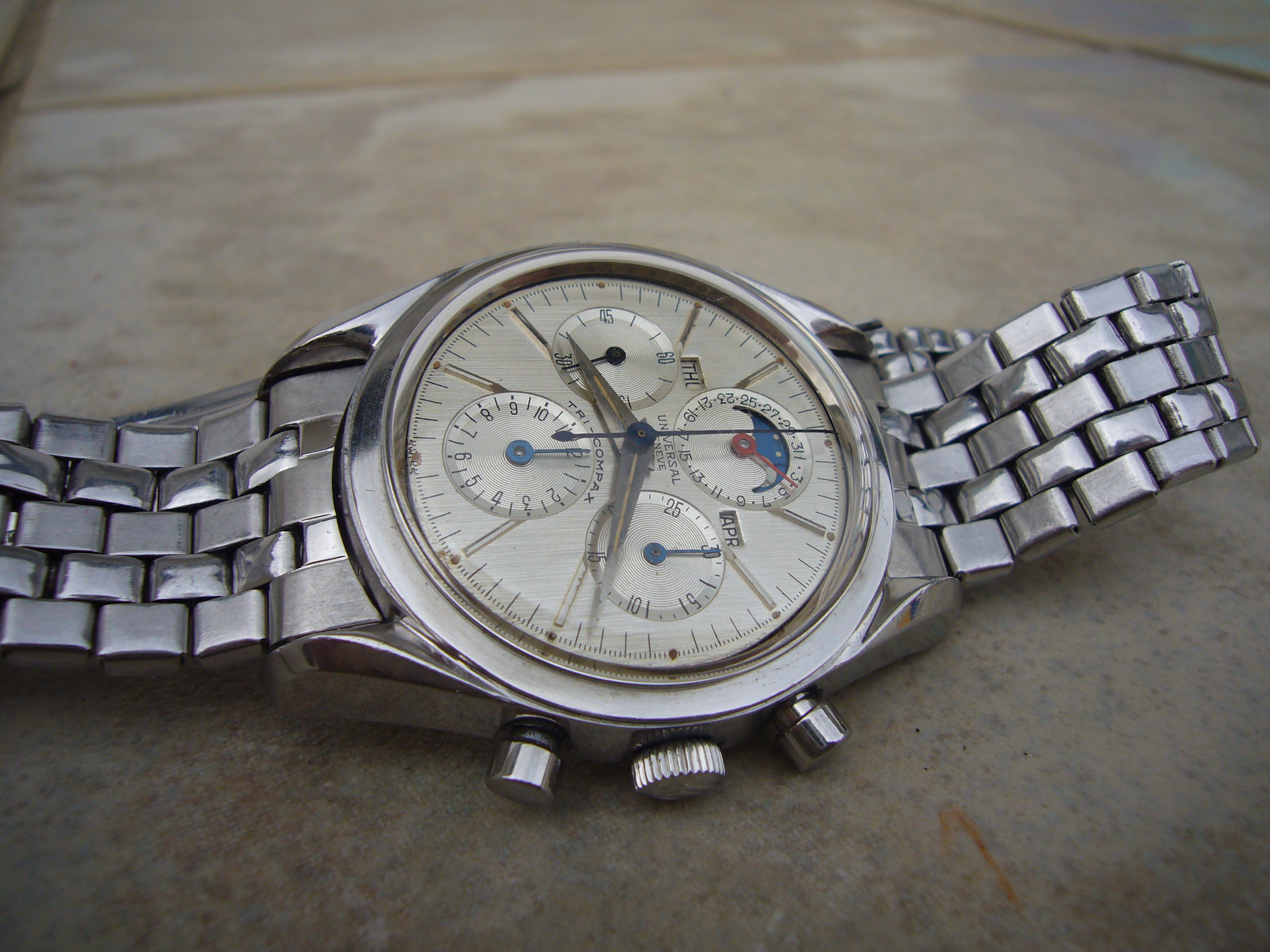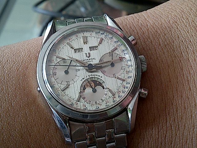 Posts 6,712 Likes 18,569 LouS ·May 5, 2015·Mrs Nataf's Other Son Modest_Proposal Could this be a late production model, when UG was on the ropes? I know they made some weird stuff at the end and this looks convincing enough. What's not convincing is a chronograph moonphase calendar with day of the week, month...but no date. EDIT: Oh wait. I see the date. Still not convinced.
