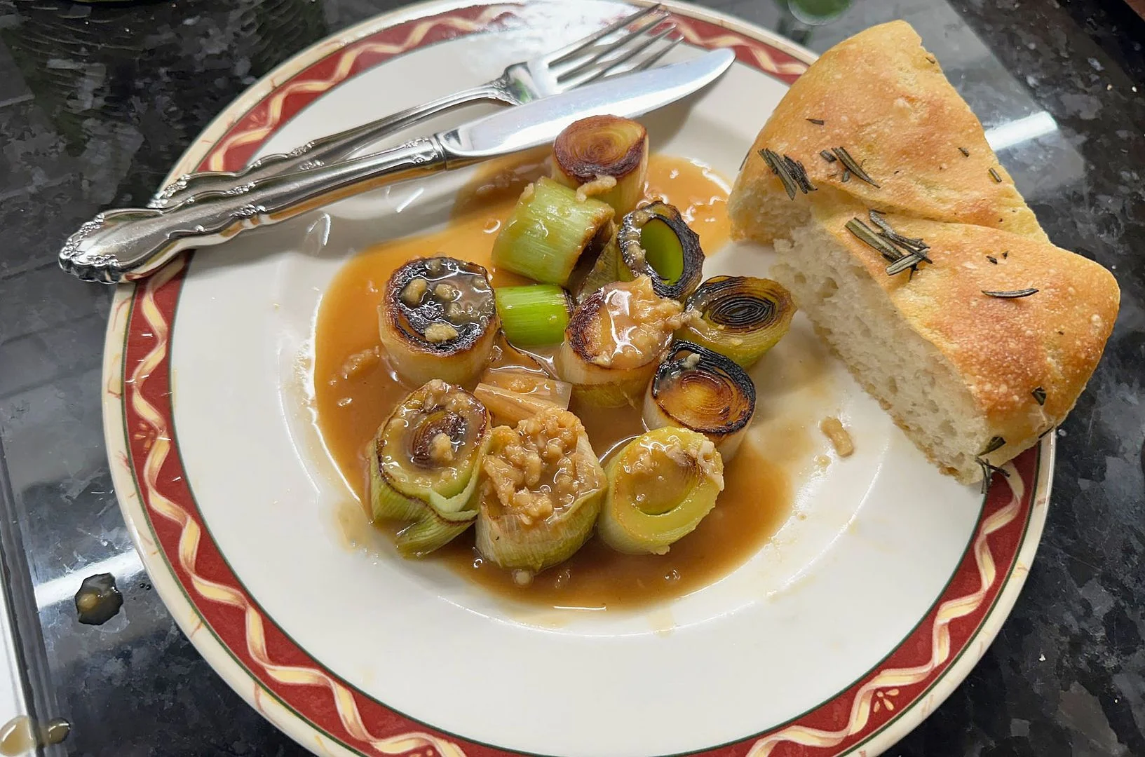 On another night some braised leeks in miso sauce...wash and cut leeks in 1 inch long pieces, brown each end on oil:
