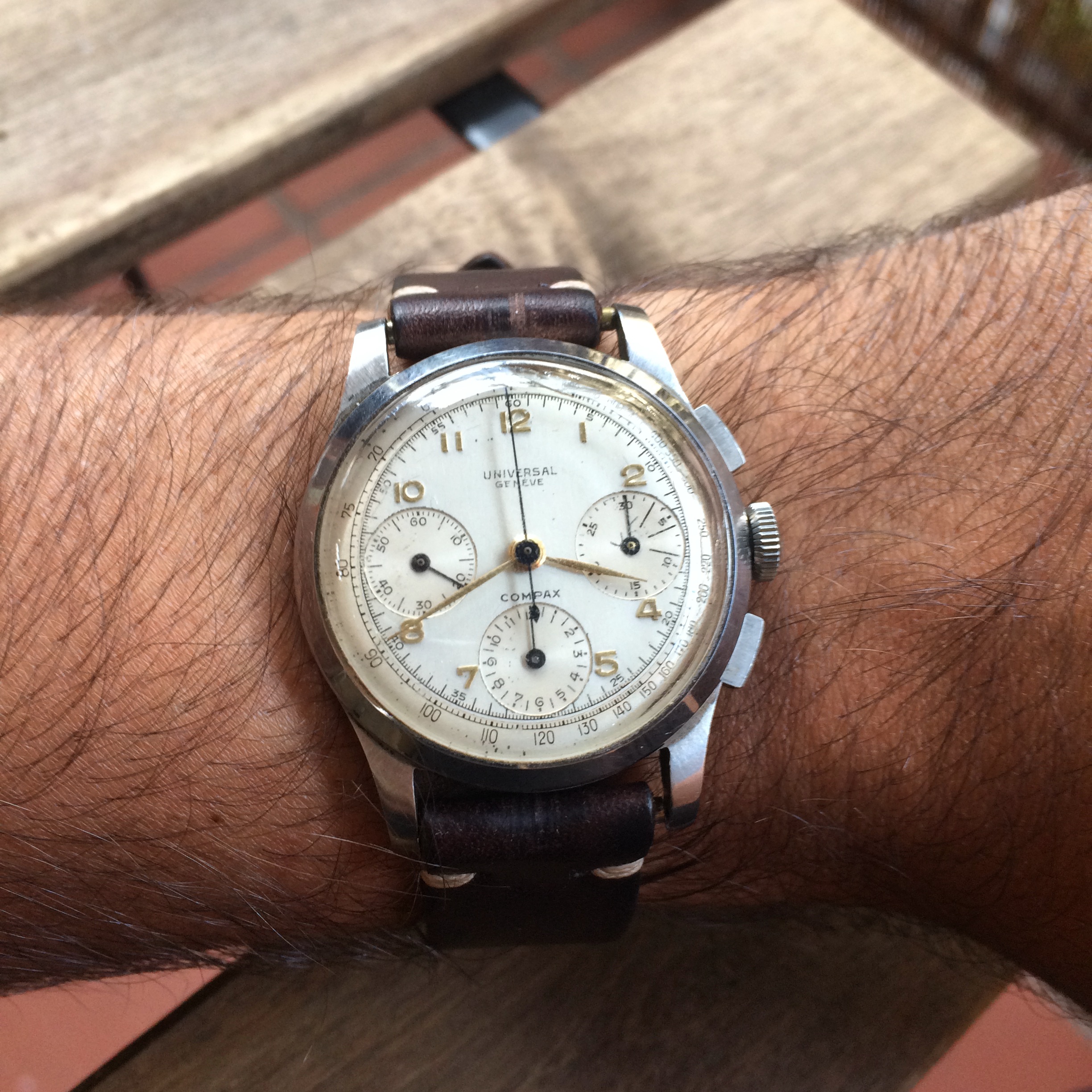 Posts 84 Likes 18 knozkhi ·Apr 12, 2014 Universal Geneve Compax circa 1953 😀 Here's a pic (excuse my extremely hairy wrist 😁)