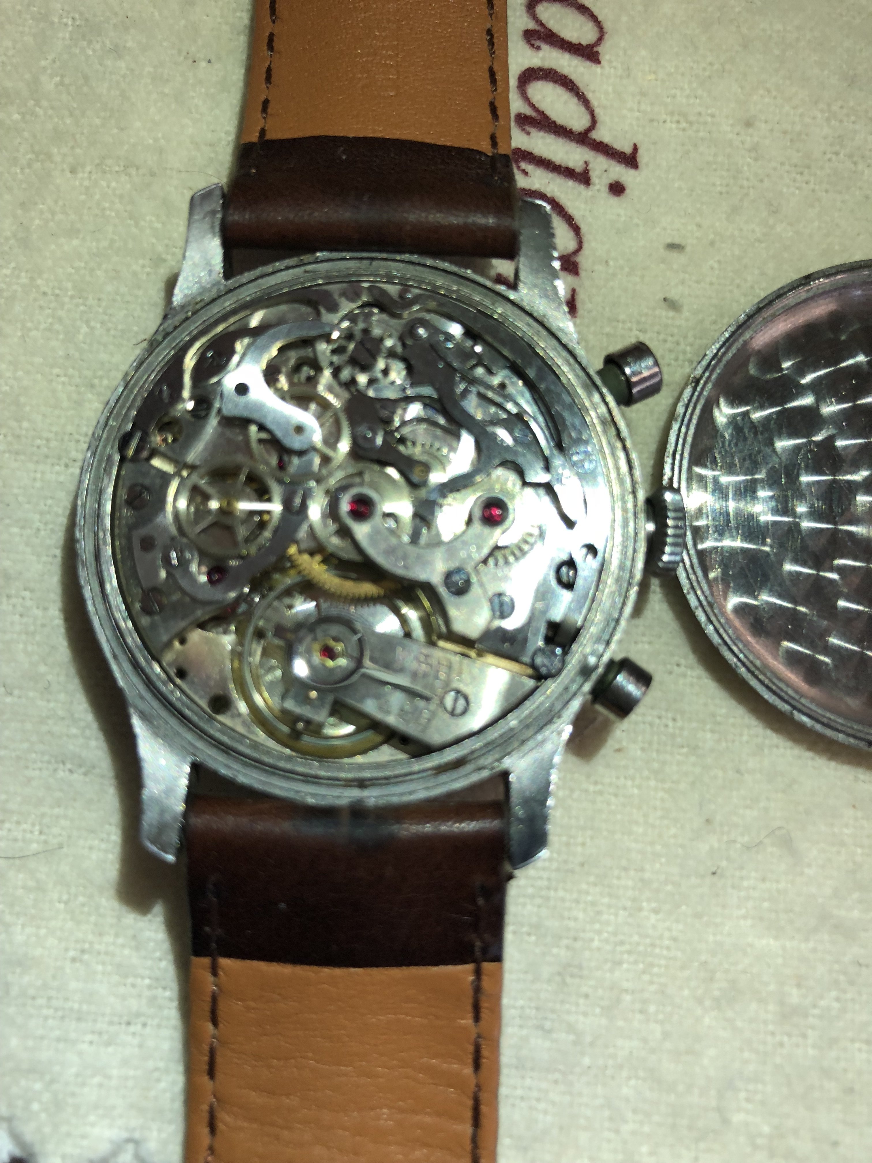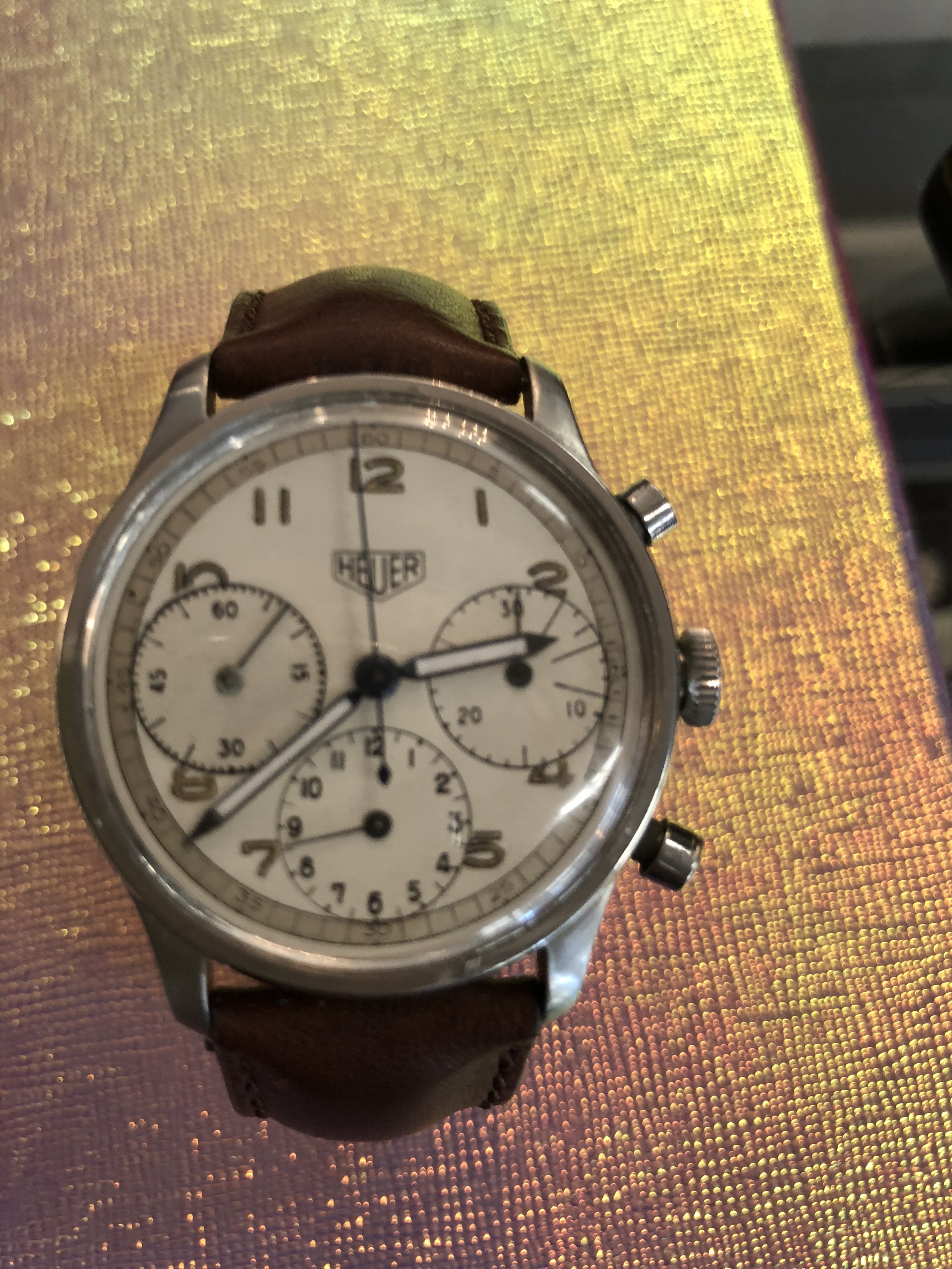 ยทJust purchased this Heuer chrono at a consignment store in La Quinta. The watch is going in for service ASAP (any suggestions in the LA area?). Watch has a Valjoux movement (72 I think) and the watch keeps good time when it runs (ie: will run for 1 - 2 days, but then stop). I have not seen the same watch on the internet, but did find a 1946 Heuer brochure (shown below) which has a very similar watch. Neither the case nor the calibre have any engraving, which all the later Heuer's have. Not sure what this means, but would like some comments (I bought the watch because I liked it, not as an investment).