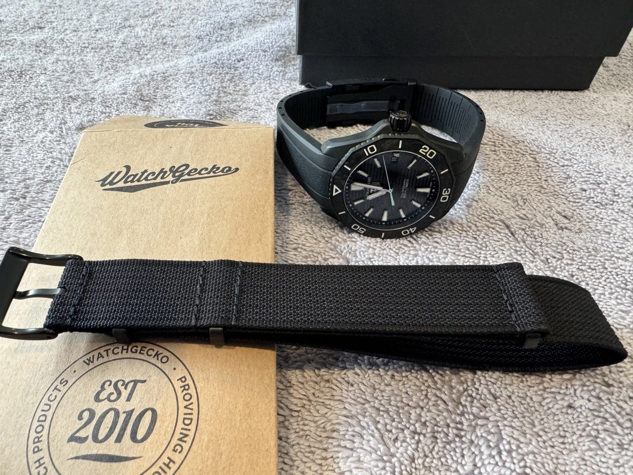 When I bought my titanium solargraph last summer, I looked very hard at the black one with the lumed bezel. The only thing that stopped me was the rubber strap -- it just doesn't fit me well. Then, after I tried a nato strap on the titanium watch, it occurred to me that a nato might work very nicely on the black one. So, guess what I did? 😜