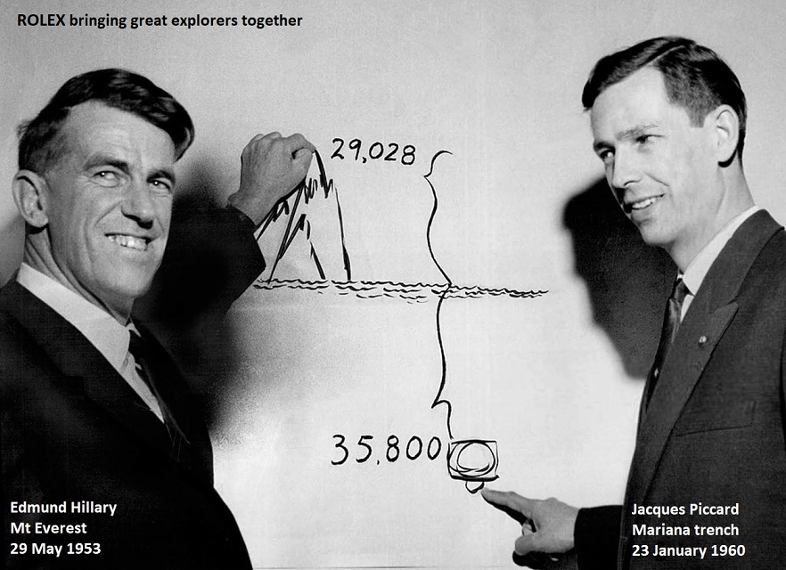 Nine years later, in May 1962, the Swiss watch brand Rolex brought great explorers together, New-Zealand mountaineer Edmund Hillary (8848 m high Mt Everest 1953) and Swiss oceanographer Jacques Piccard (10915 m deep Mariana Trench 1960).