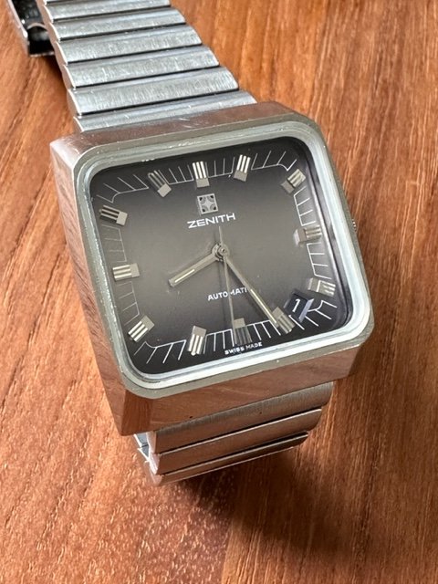 "Rectangular men's wrist watch, about 1976, steel case, reference 01.0040.380, automatic, date, Calibre 2572 PC, lacquered face. (Zenith collection)" although the picture shows it on a leather strap rather than the bracelet. Hope this helps.
